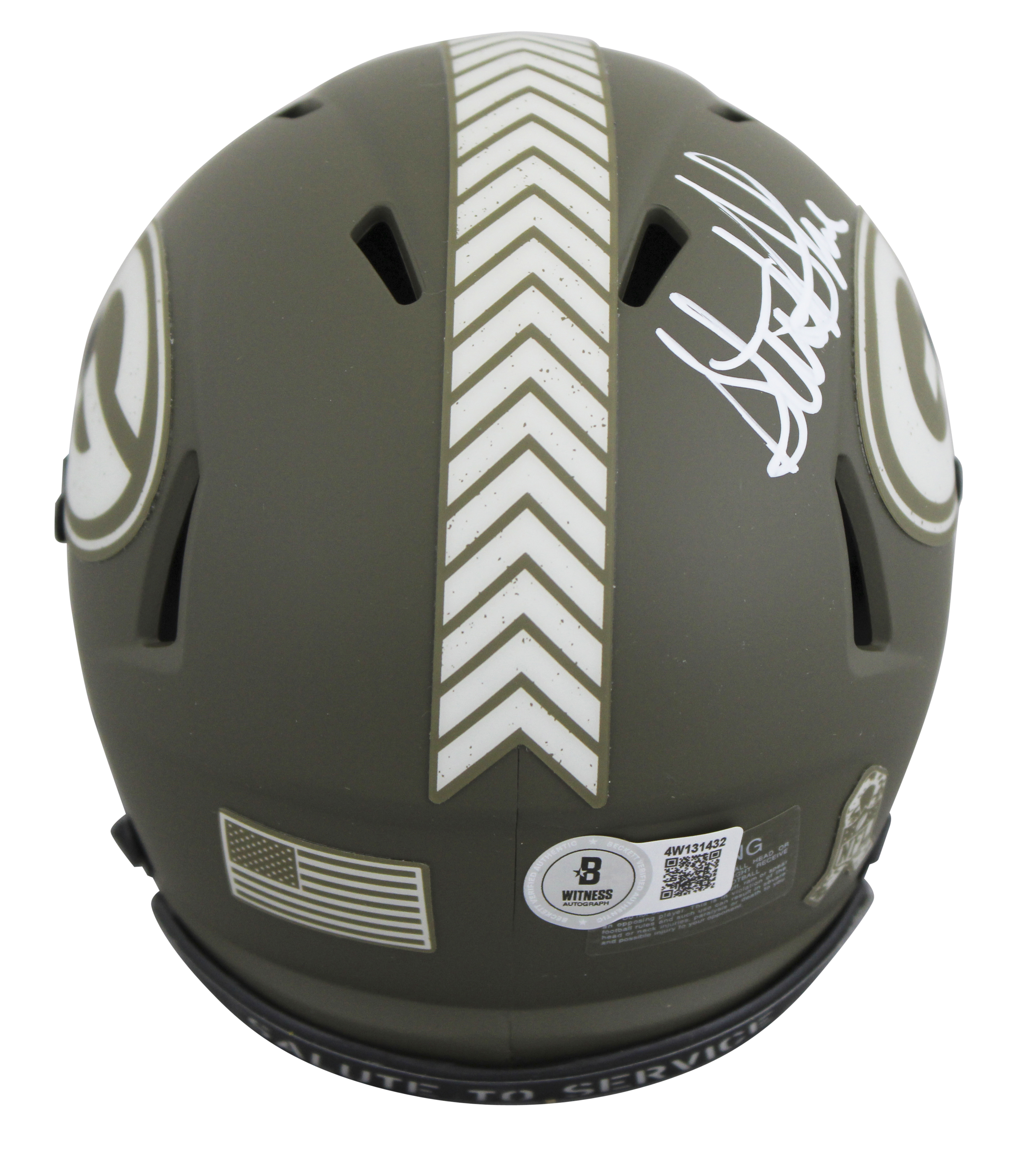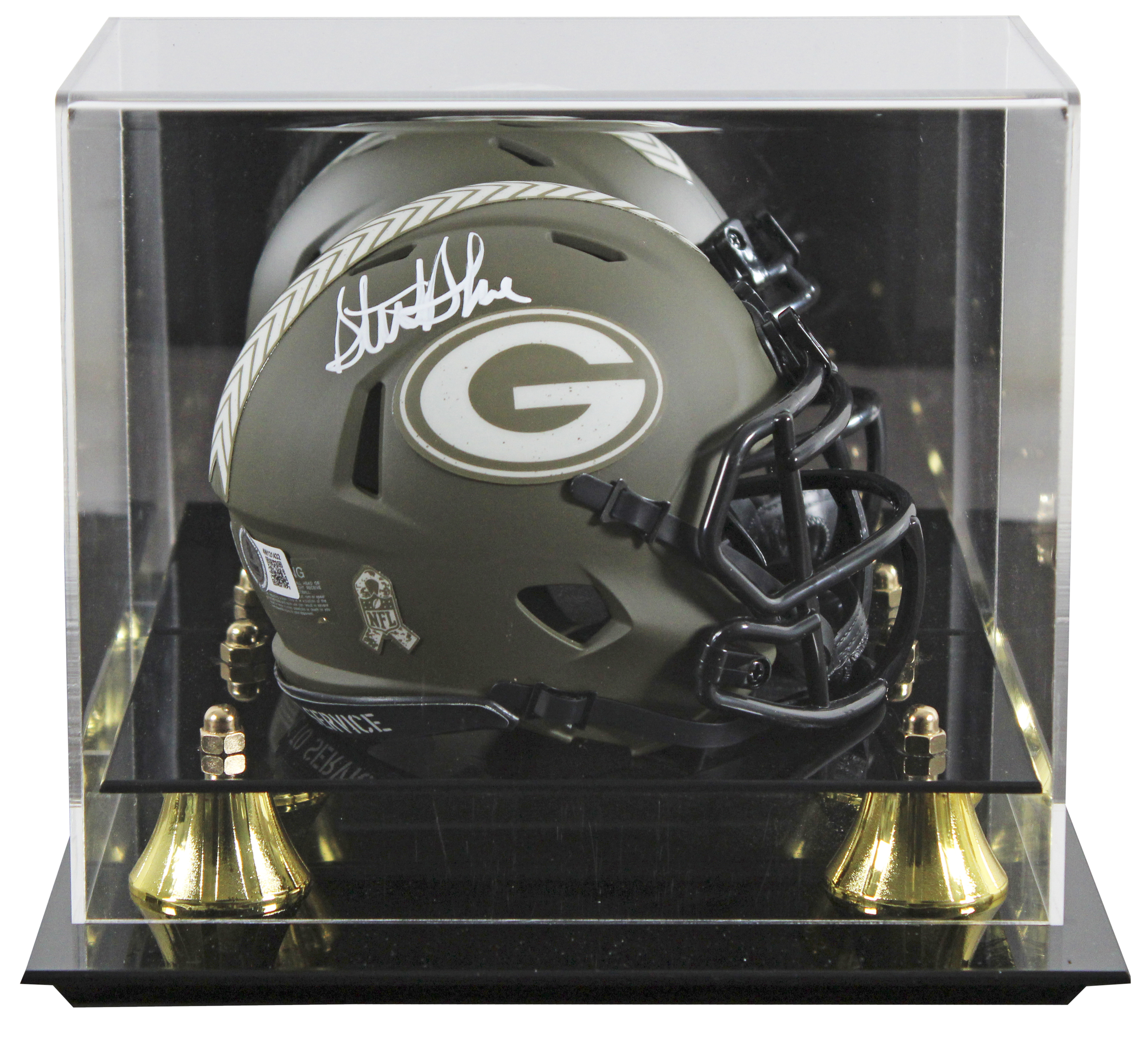 This Autographed Alternate Salute To Service Speed Mini Helmet W/ Uv Mirrored Back Acrylic Display Case has been Personally Signed by Sterling Sharpe of the Green Bay Packers. This item is 100% Authentic to include a hologram by Beckett Authentication Services. This item will come with an affixed Beckett Authentication Services (BAS) authentication sticker, which includes a scannable QR code to verify authenticity. Please note that Beckett no longer provides serial-numbered COA cards, and the attached BAS sticker will serve as the complete authentication for this item. This is a BAS Witnessed Protection Program item which means a Beckett Authentication Service representative was present when this item was being signed. We conducted an autograph signing with Sterling Sharpe where multiples of the same item were signed. While the photographs are representative of this item, the size, placement and strength of the signature may vary. Each item is hand signed, therefore, each autograph is unique. This item can be verified through BAS Witnessed.