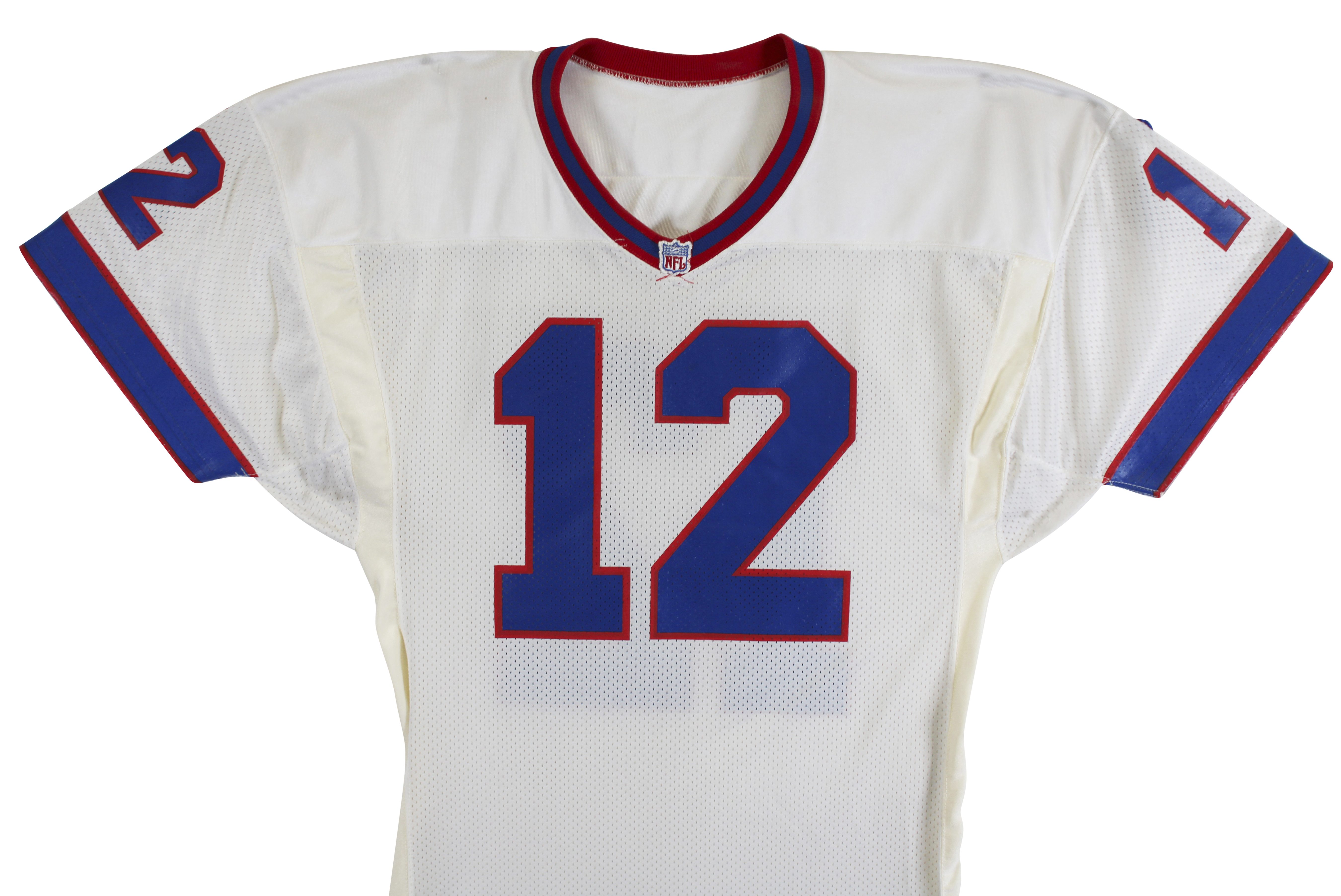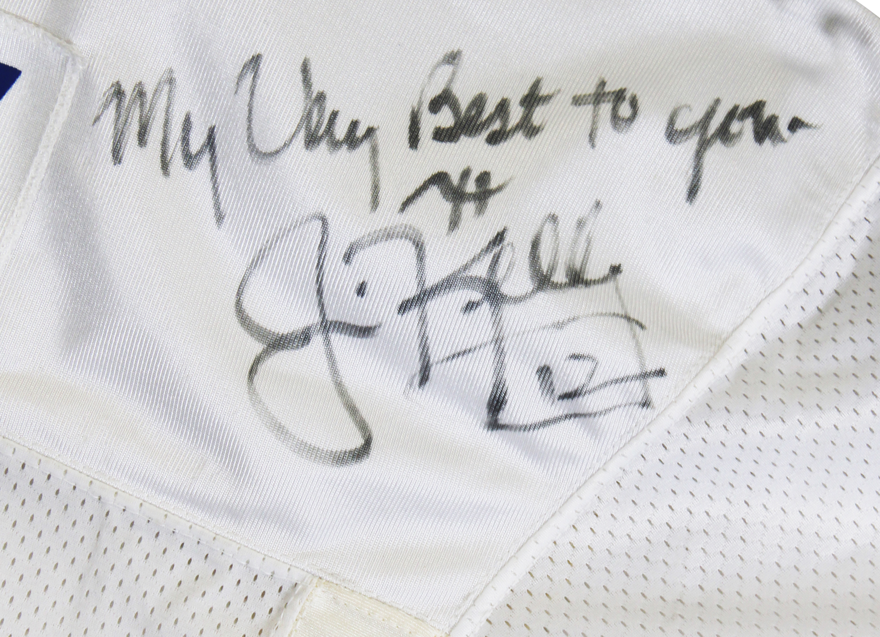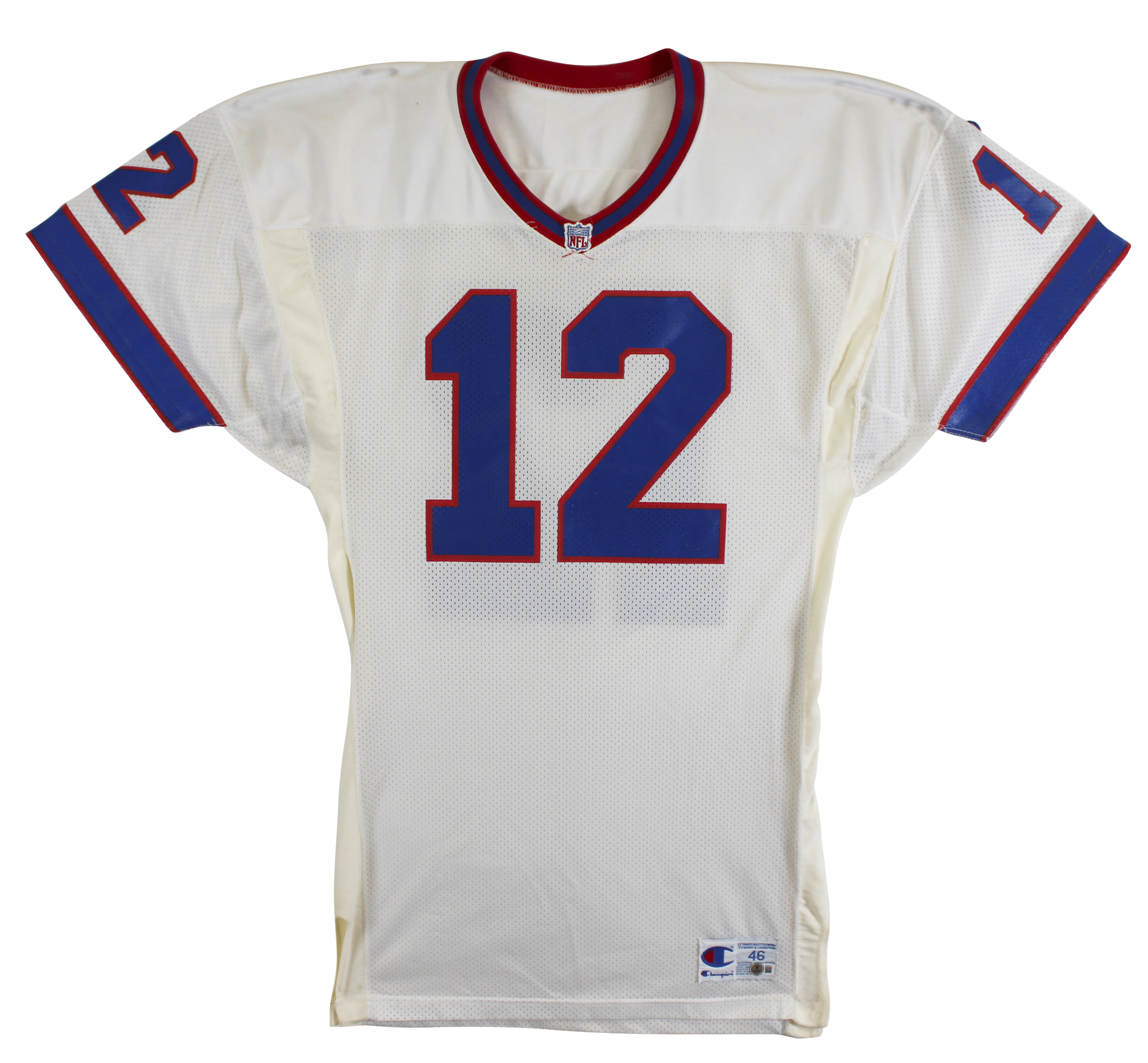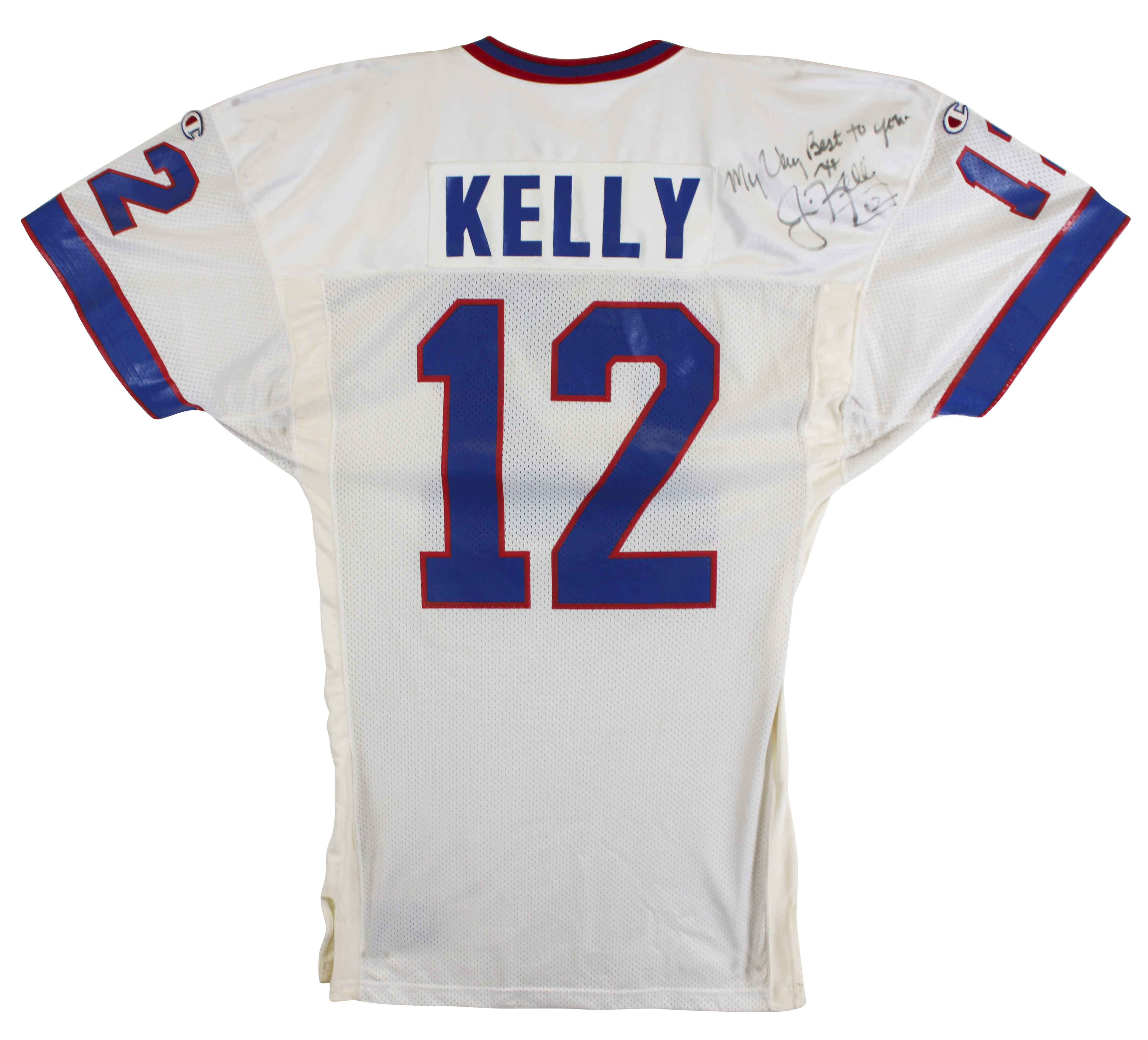 This Autographed White Champion Size 46 Jersey with the inscription of "My Very Best To You" has been Personally Signed by Jim Kelly of the Buffalo Bills. This item is 100% Authentic to include a hologram by Beckett Authentication Services. This item will come with an affixed Beckett Authentication Services (BAS) authentication sticker, which includes a scannable QR code to verify authenticity. Please note that Beckett no longer provides serial-numbered COA cards, and the attached BAS sticker will serve as the complete authentication for this item. The authenticity can be verified on Beckett Authentication Services website. There is no paperwork on the game issue however the tagging matches known exemplars, due to that and the provenance of the item we do believe it is in fact game issued.