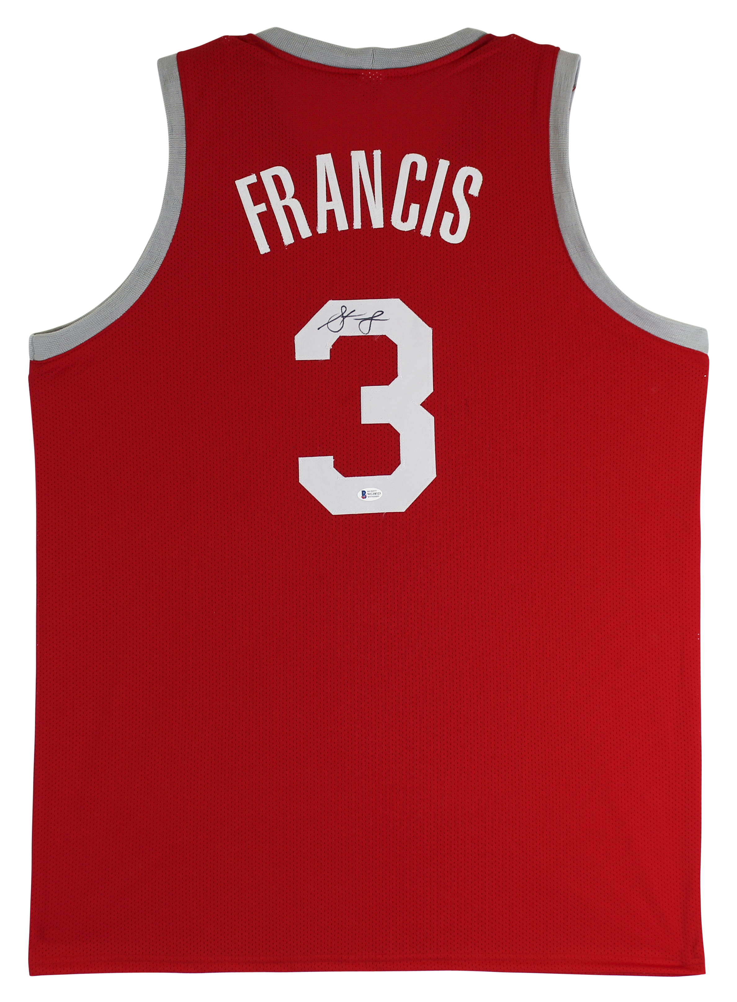 This Autographed Red Pro Style Jersey has been Personally Signed by Steve Francis of the Houston Rockets. This item is 100% Authentic to include a hologram by Beckett Authentication Services. This item will come with the new Beckett Authentication hologram that has a scannable QR code rather than the traditional COA. If you would like to have a COA, you are welcome to reach out to Beckett for a printed certification once you receive your item. This is a BAS Witnessed Protection Program item which means a Beckett Authentication Service representative was present when this item was being signed. This is a stock item. We conducted an autograph signing with Steve Francis and we have several of these available. The one you will receive will be of equal quality to the one pictured. This item can be verified through BAS Witnessed. This is a X-Large sized, non-branded, custom-stitched Jersey.