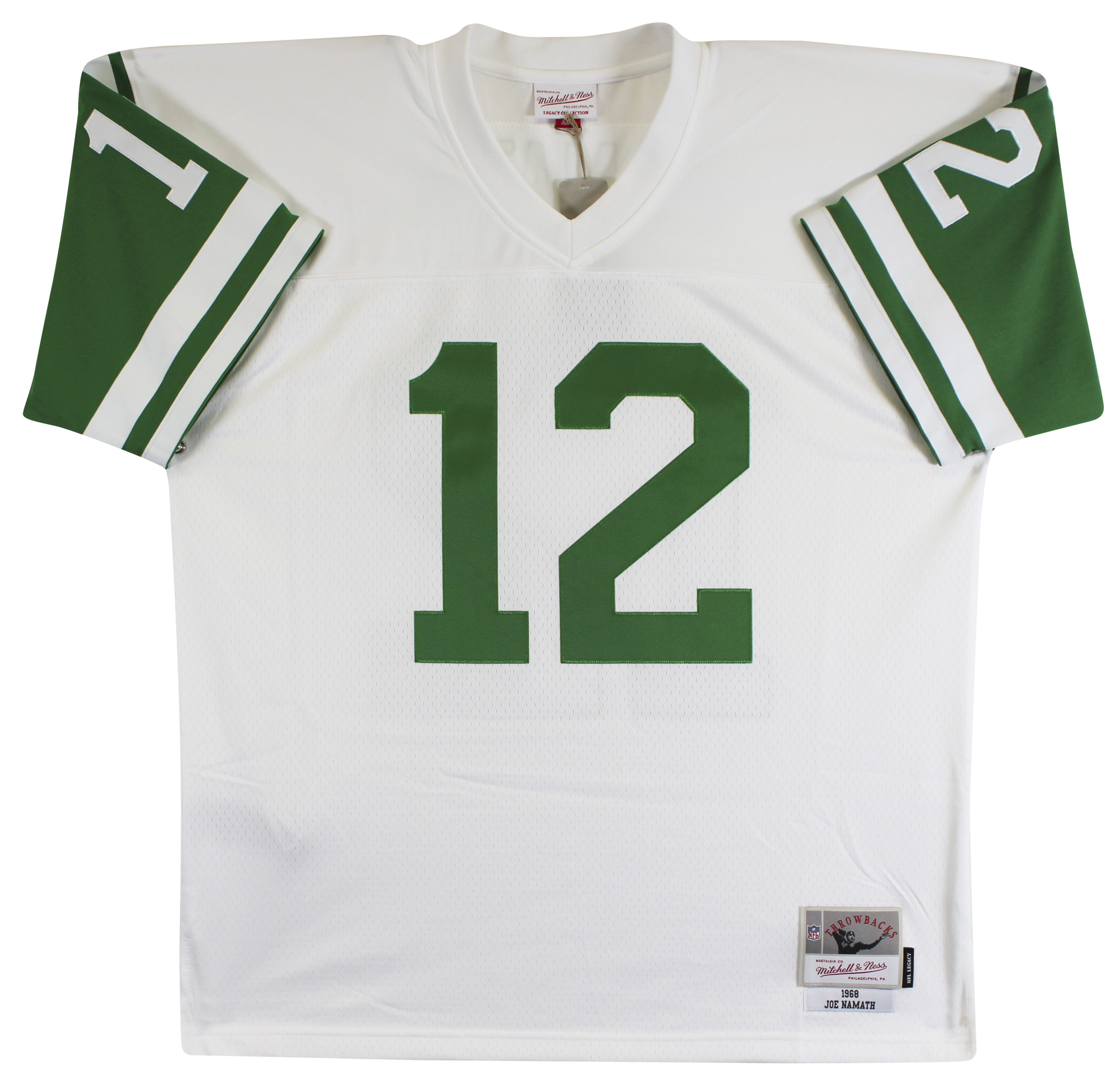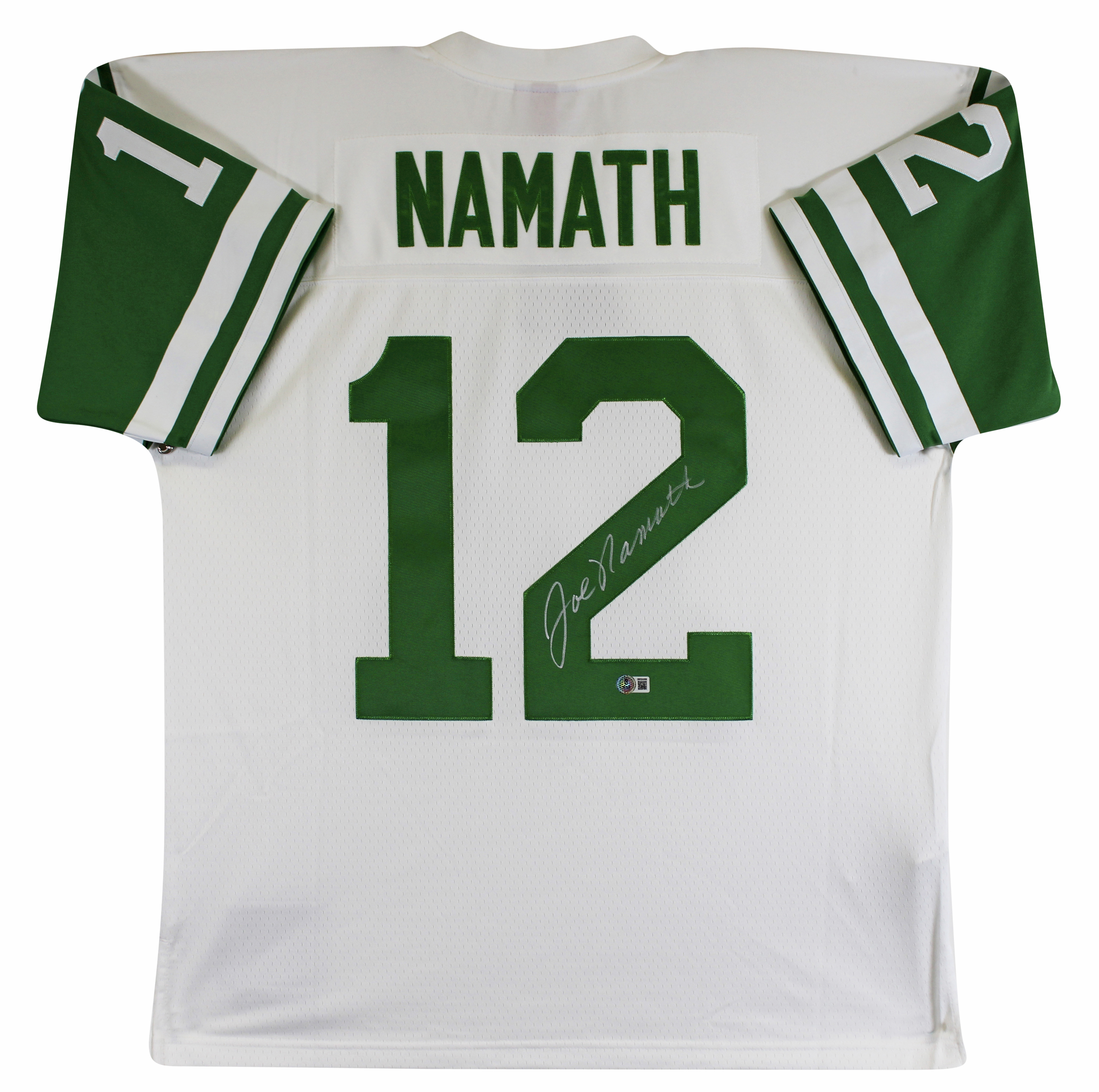 This Autographed White Mitchell & Ness Jersey has been Personally Signed by Joe Namath of the New York Jets. This item is 100% Authentic to include a hologram by Beckett Authentication Services. This item will come with an affixed Beckett Authentication Services (BAS) authentication sticker, which includes a scannable QR code to verify authenticity. Please note that Beckett no longer provides serial-numbered COA cards, and the attached BAS sticker will serve as the complete authentication for this item. This is a BAS Witnessed Protection Program item which means a Beckett Authentication Service representative was present when this item was being signed. We conducted an autograph signing with Joe Namath where multiples of the same item were signed. While the photographs are representative of this item, the size, placement and strength of the signature may vary. Each item is hand signed, therefore, each autograph is unique. This item can be verified through BAS Witnessed. This is a X-Large sized, non-branded, custom-stitched Jersey.