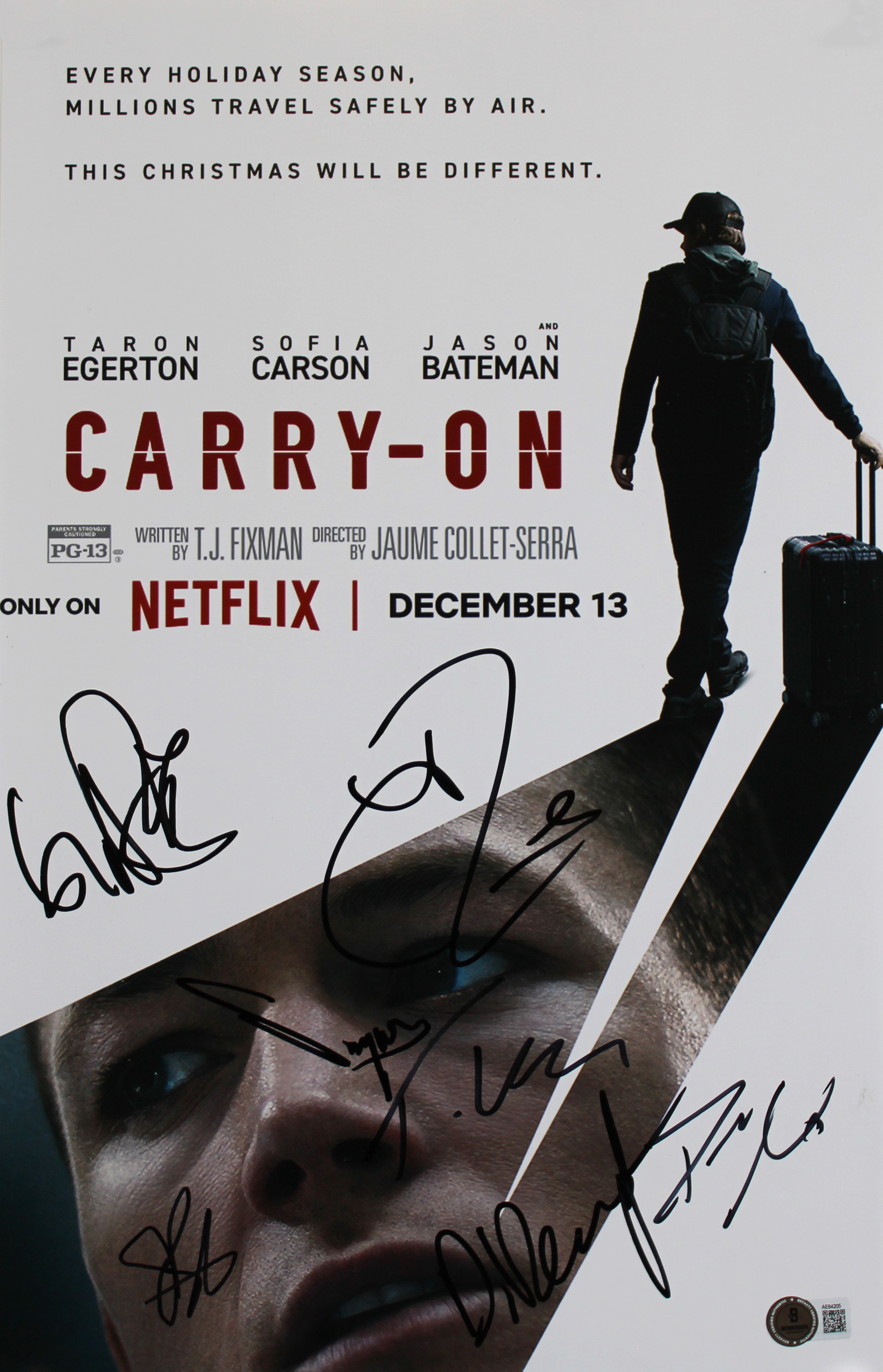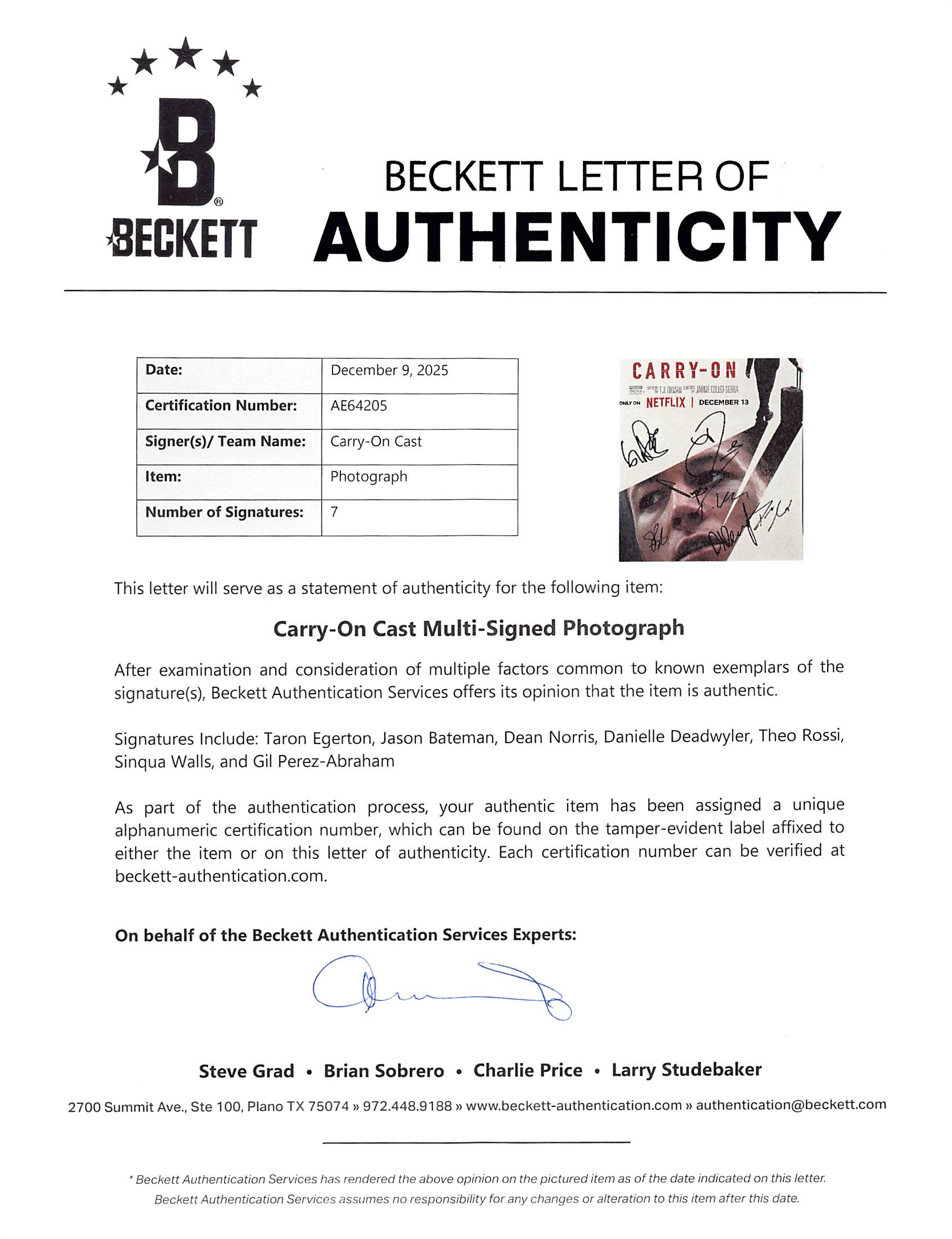 This Autographed 11x17 Photo has been Personally Signed by Taron Egerton, Jason Bateman, Dean Norris, Danielle Deadwyler, Theo Rossi, Sinqua Walls & Gil Perez-Abraham of Carry On. This item is 100% Authentic to include a Certificate of Authenticity (COA) / hologram by Beckett Authentication Services.The authenticity can be verified on Beckett Authentication Services website. This photo has some dimpling from handling and age.