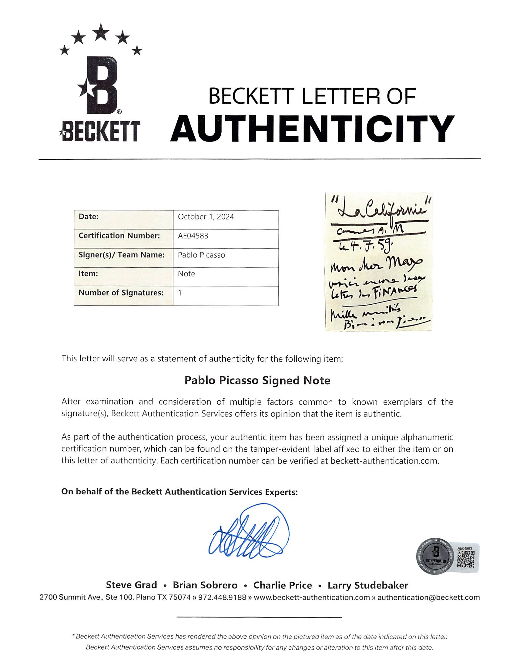 This Autographed & Handwritten 8.25x10.5 Letter has been Personally Signed by Pablo Picasso. This item is 100% Authentic to include a Certificate of Authenticity (COA) / hologram by Beckett Authentication Services. The authenticity can be verified on Beckett Authentication Services website. Handwritten letter in a bold black ink, in French. Addressed from Picasso's home in Villa La Californie, Cannes, a handwritten letter to his friend and financial advisor Max Pellequer, in full (translated): ���������La Californie - Cannes - the 4/7/59 - My dear Max - Here are more letters from finance, best wishes to you, Picasso.���������