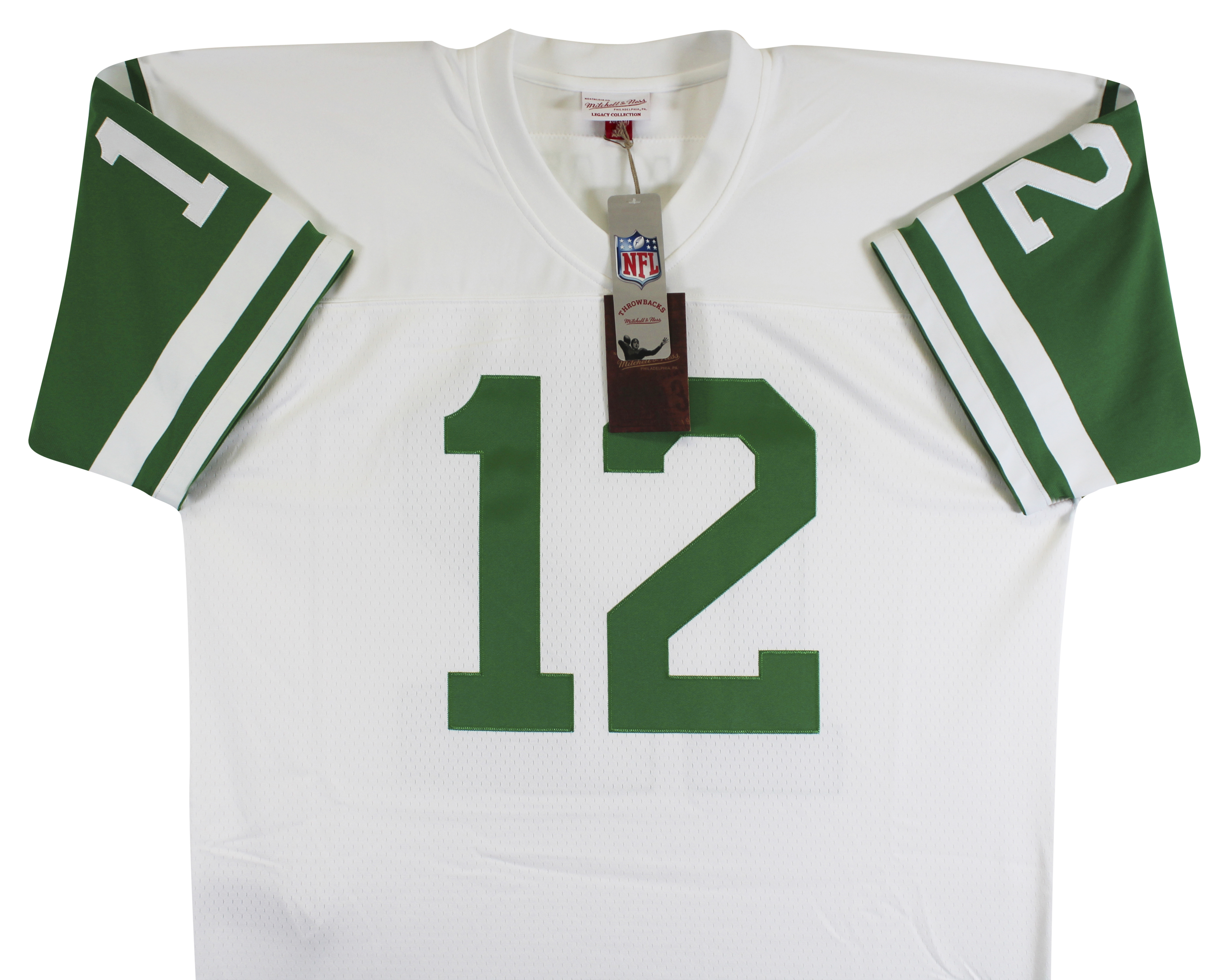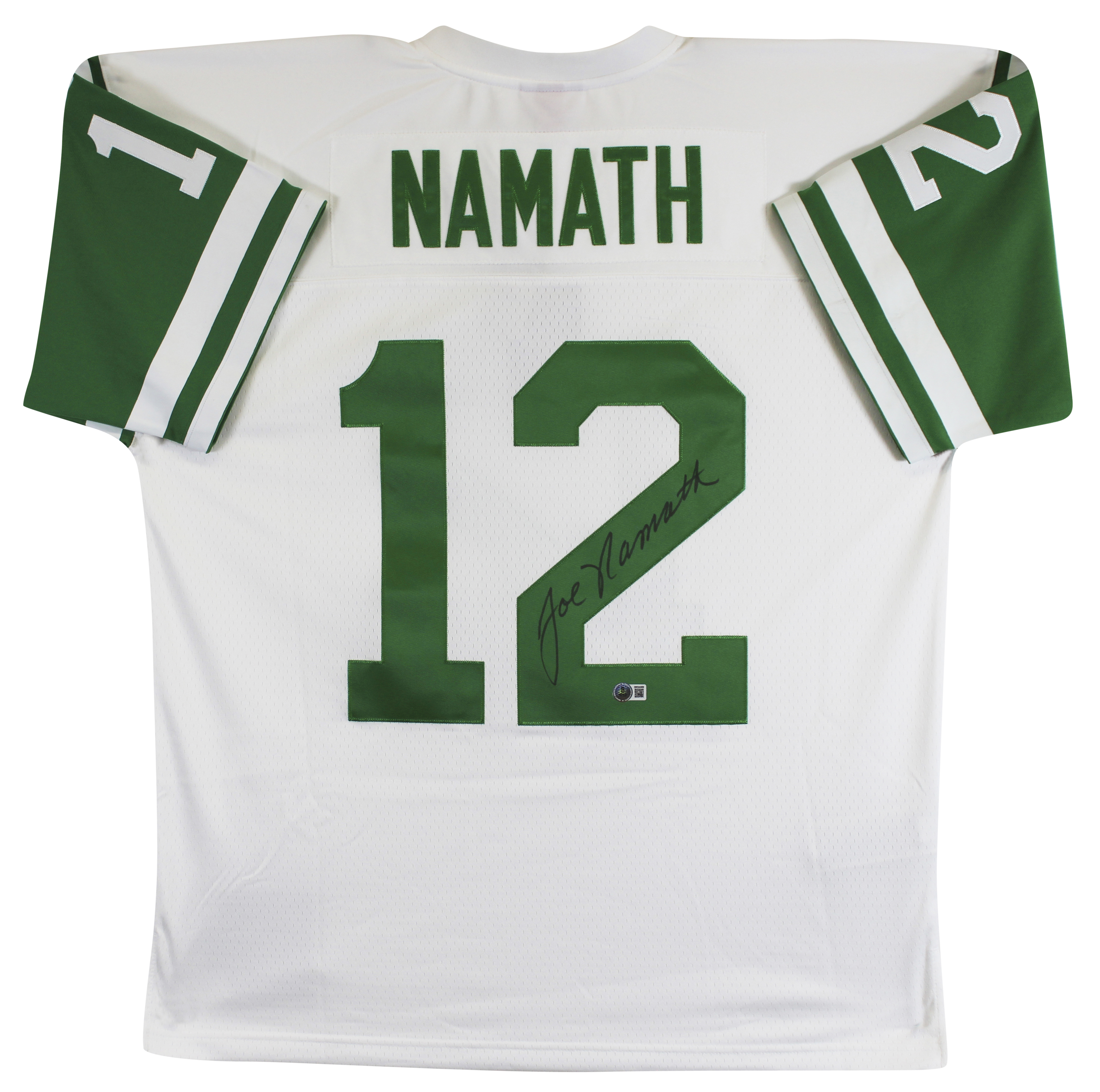 This Autographed White Mitchell & Ness Jersey has been Personally Signed by Joe Namath of the New York Jets. This item is 100% Authentic to include a hologram by Beckett Authentication Services. This item will come with an affixed Beckett Authentication Services (BAS) authentication sticker, which includes a scannable QR code to verify authenticity. Please note that Beckett no longer provides serial-numbered COA cards, and the attached BAS sticker will serve as the complete authentication for this item. This is a BAS Witnessed Protection Program item which means a Beckett Authentication Service representative was present when this item was being signed. The authenticity can be verified on Beckett Authentication Services website. This is a X-Large sized, non-branded, custom-stitched Jersey.