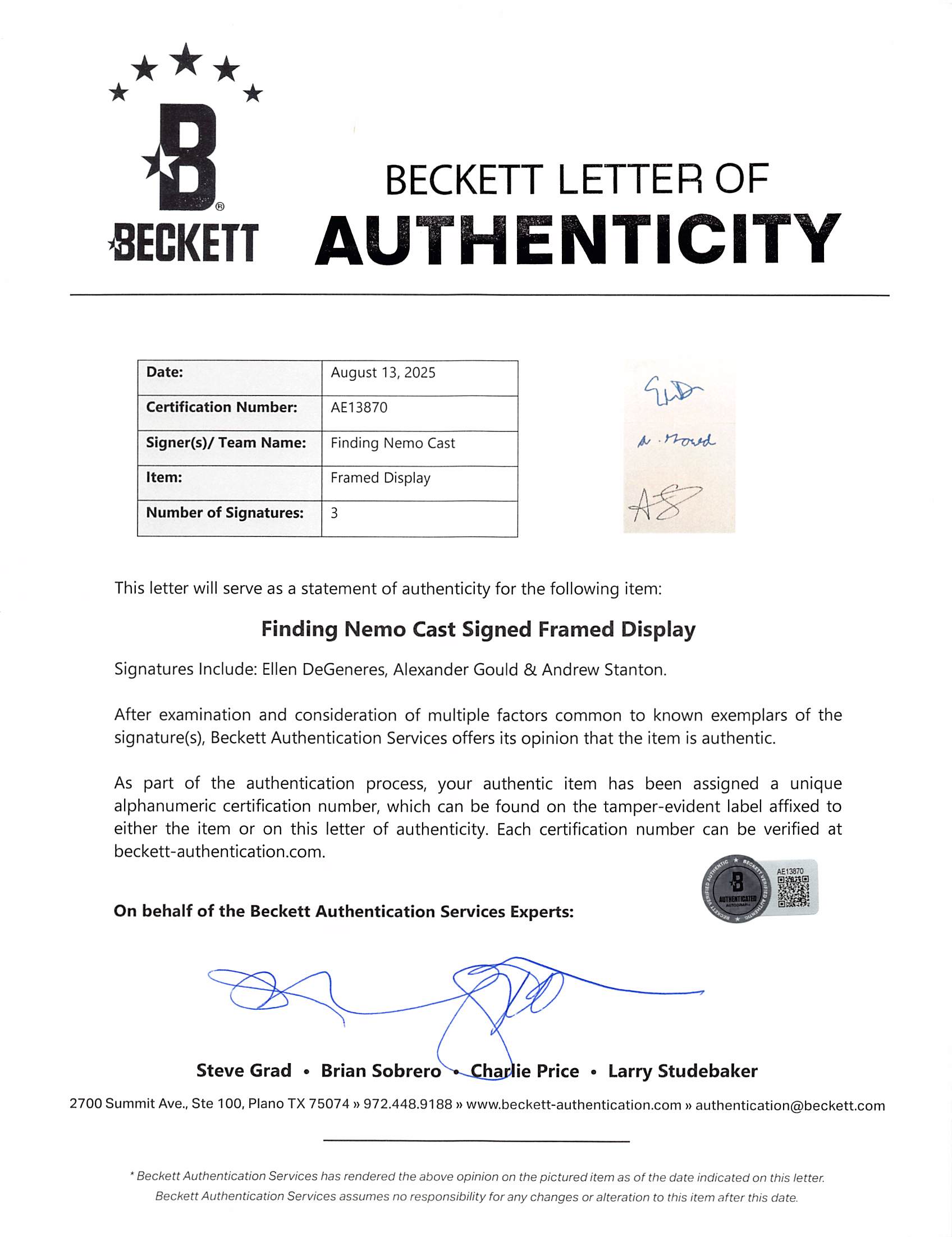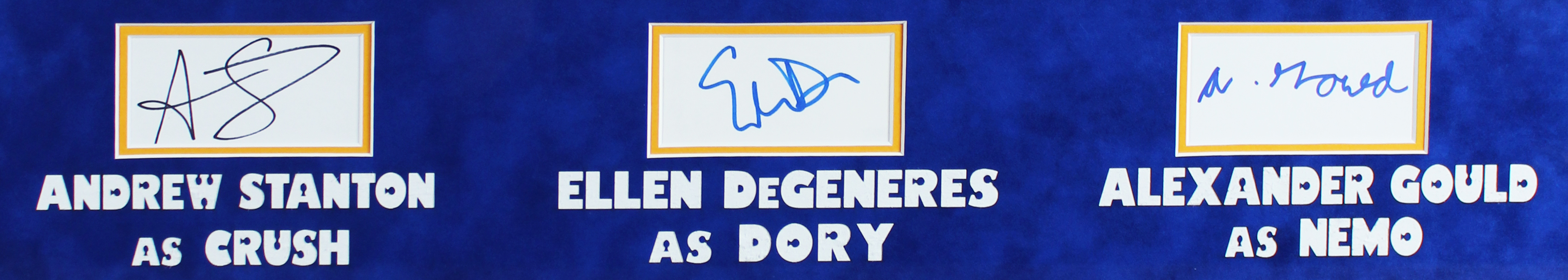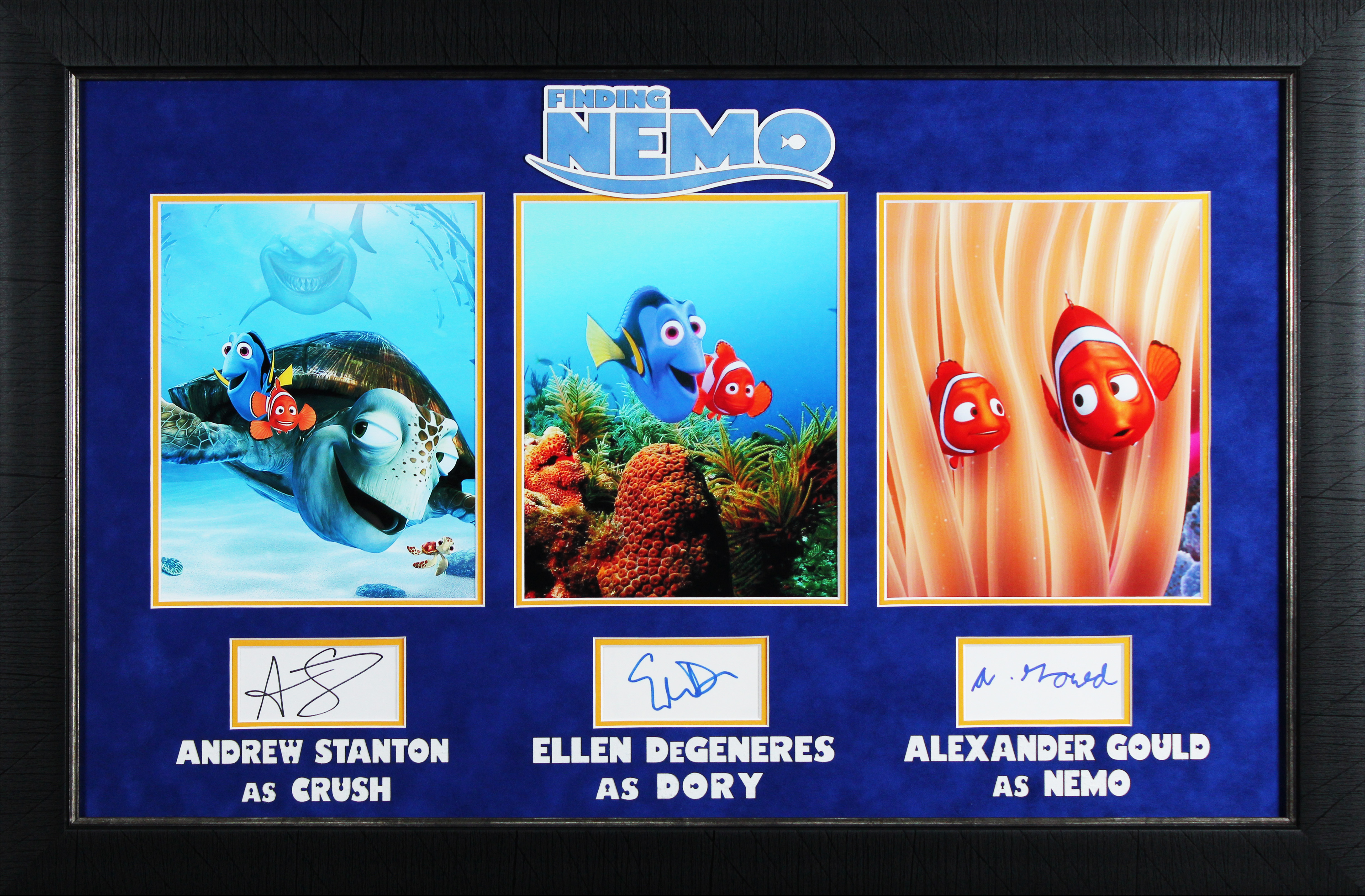 This Autographed Framed Display has been Personally Signed by Andrew Stanton, Ellen DeGeneres & Alexander Gould of Finding Nemo. This item is 100% Authentic to include a Certificate of Authenticity (COA) / hologram by Beckett Authentication Services. The authenticity can be verified on Beckett Authentication Services website. This item has been professionally framed to overall dimensions of approximately 21.5 x 32.5 inches.