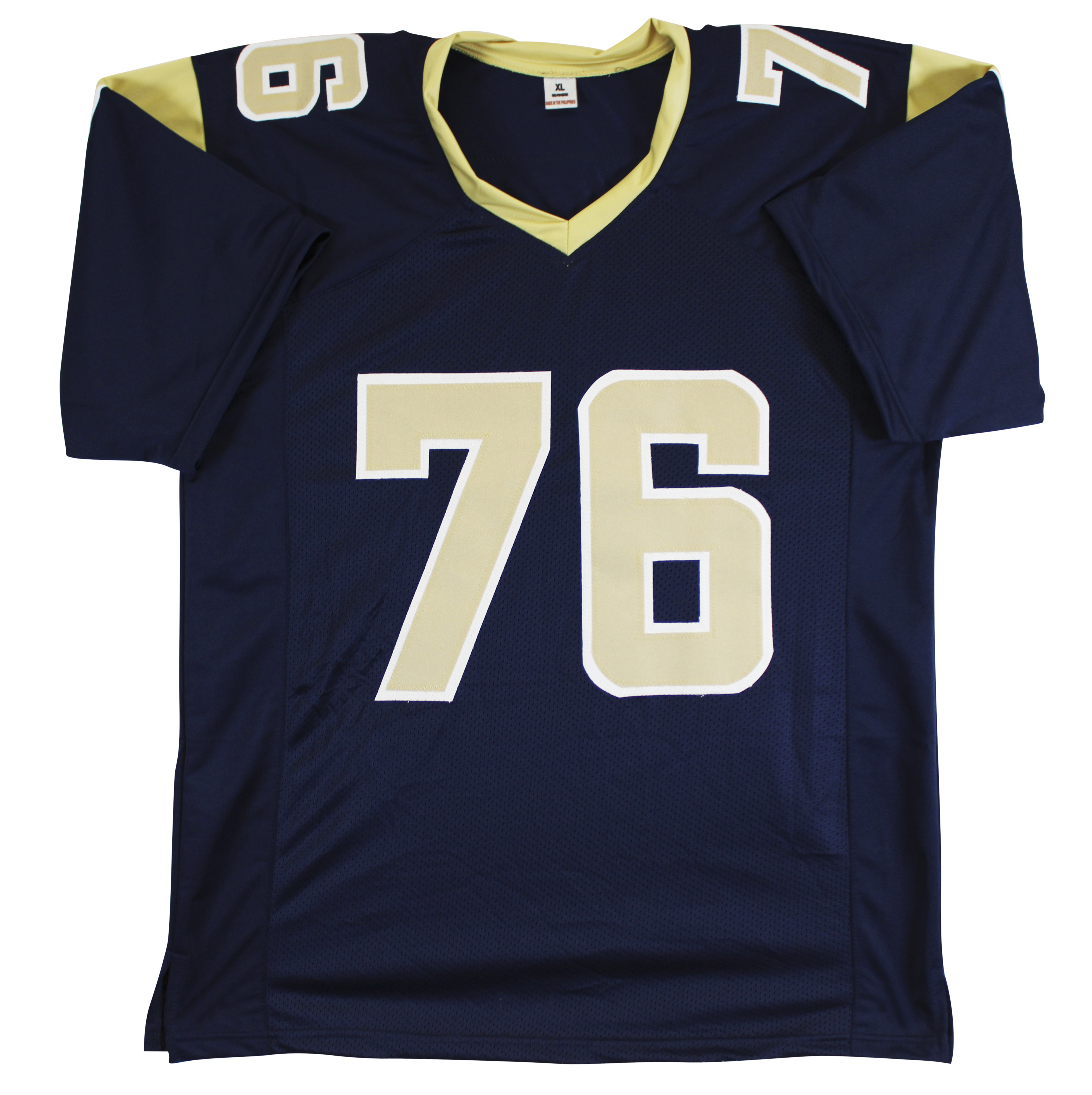 This Autographed Navy Pro Style Jersey has been Personally Signed by Orlando Pace of the St. Louis Rams. This item is 100% Authentic to include a hologram by Beckett Authentication Services. This item will come with an affixed Beckett Authentication Services (BAS) authentication sticker, which includes a scannable QR code to verify authenticity. Please note that Beckett no longer provides serial-numbered COA cards, and the attached BAS sticker will serve as the complete authentication for this item. We conducted an autograph signing with Orlando Pace where multiples of the same item were signed. While the photographs are representative of this item, the size, placement and strength of the signature may vary. Each item is hand signed, therefore, each autograph is unique. This item can be verified through BAS. This is a X-Large sized Jersey.