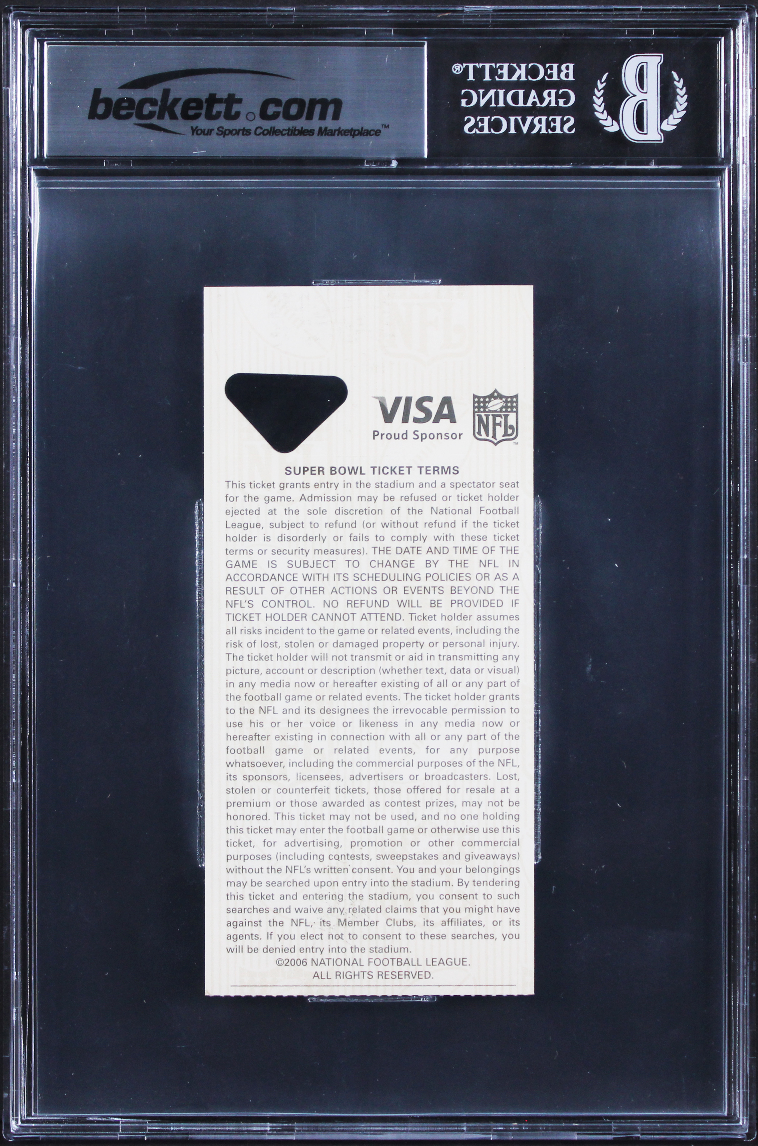 This Autographed February 5, 2006 Super Bowl XL Ticket Stub with the inscription of "SB XL MVP" has been Personally Signed by Hines Ward of the Pittsburgh Steelers. This item is 100% Authentic, it comes slabbed and authenticated by Beckett Authentication Services. We conducted an autograph signing with Hines Ward where multiples of the same item were signed. While the photographs are representative of this item, the size, placement and strength of the signature may vary. Each item is hand signed, therefore, each autograph is unique. This item can be verified through BAS Slabbed.