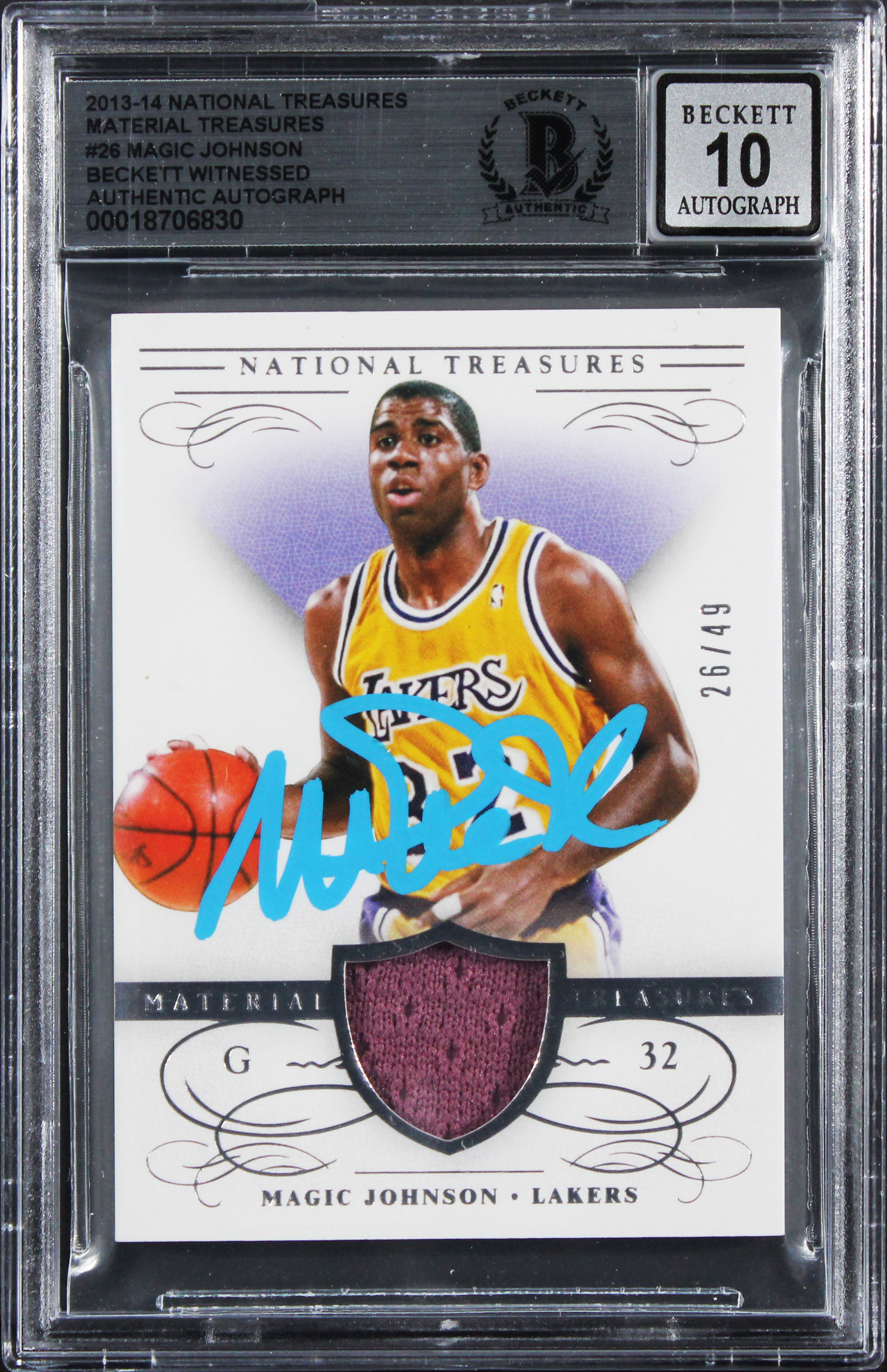 This Autographed Auto Graded Gem MInt 10! 2013 National Treasures Material Treasures #26 #26/49 Card has been Personally Signed by Magic Johnson of the Los Angeles Lakers. This item is 100% Authentic, it comes slabbed and authenticated by Beckett Authentication Services. The authenticity can be verified on Beckett Authentication Services website.