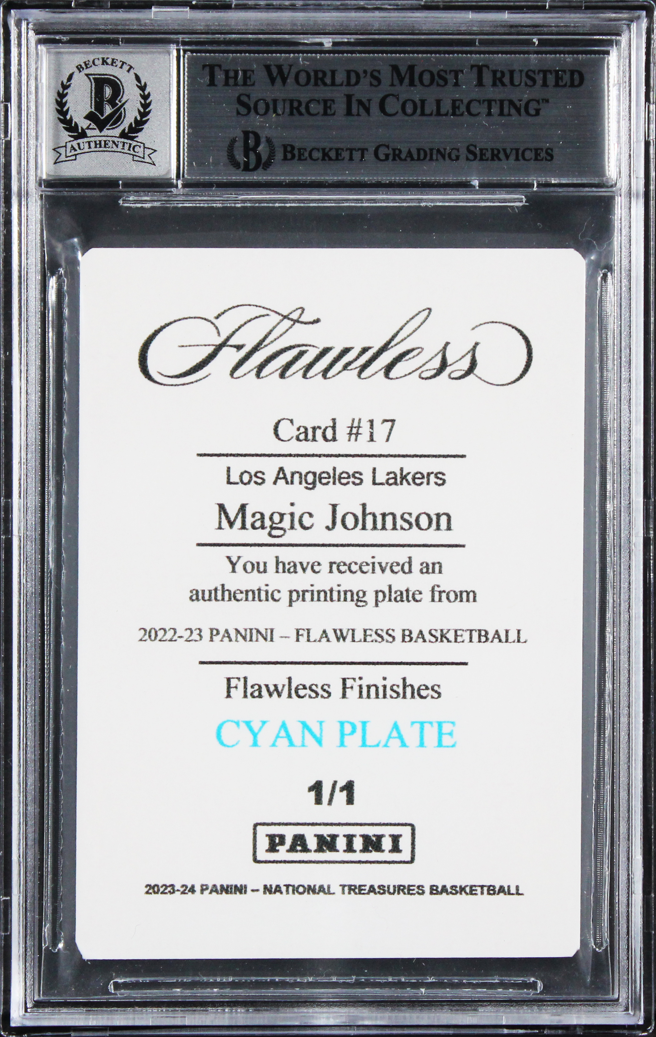 This Autographed Auto Graded Gem MInt 10! 2022 Panini Flawless Finishes Printing Plates Cyan #17 Card with the inscription of "HOF 02" has been Personally Signed by Magic Johnson of the Los Angeles Lakers. This item is 100% Authentic, it comes slabbed and authenticated by Beckett Authentication Services. The authenticity can be verified on Beckett Authentication Services website.