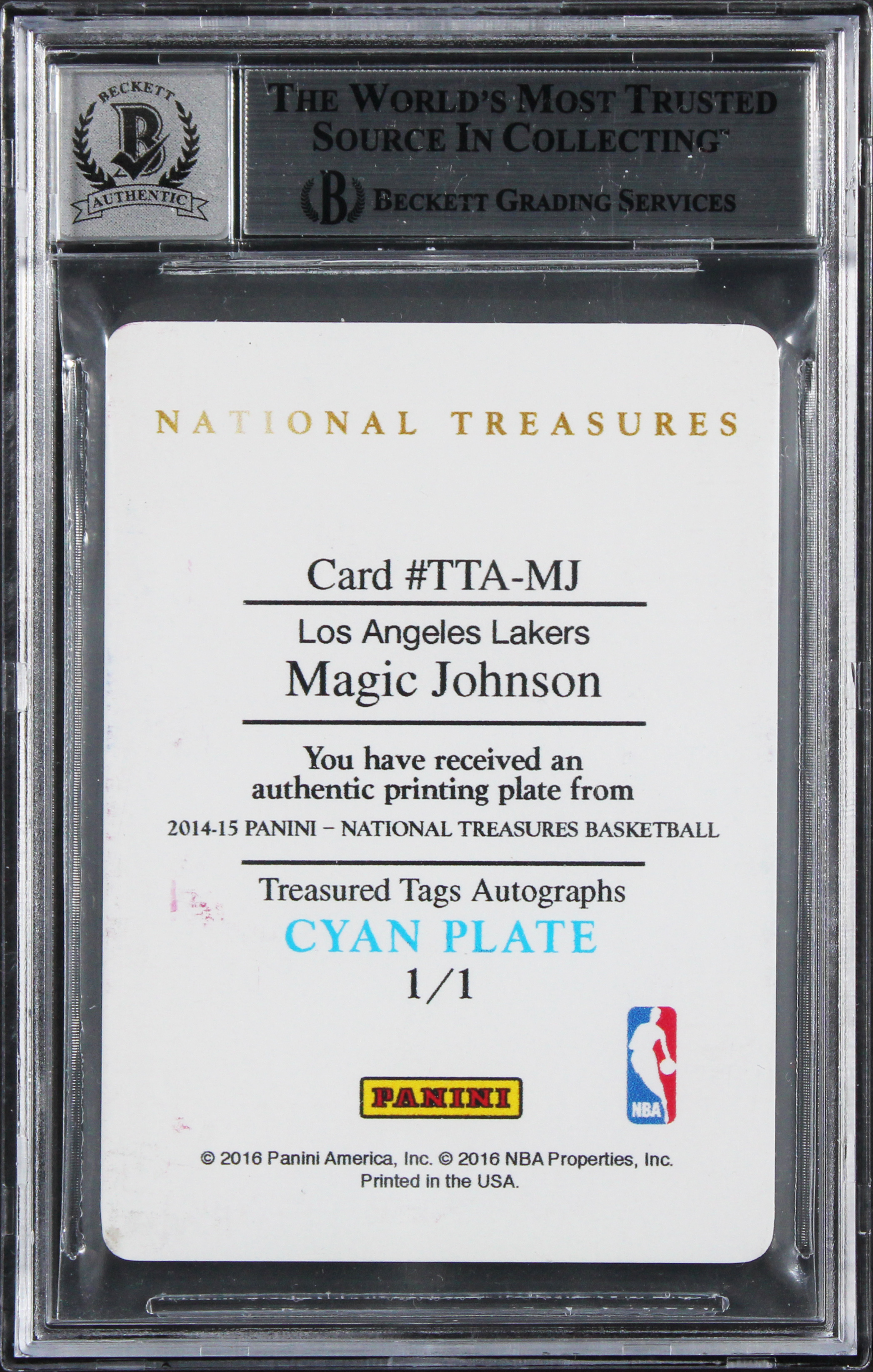 This Autographed Auto Graded Gem MInt 10! 2014 National Treasures Treasured Tags Autographs Printing Plates Cyan #TTAMJ Card with the inscription of "HOF 02" has been Personally Signed by Magic Johnson of the Los Angeles Lakers. This item is 100% Authentic, it comes slabbed and authenticated by Beckett Authentication Services. The authenticity can be verified on Beckett Authentication Services website.