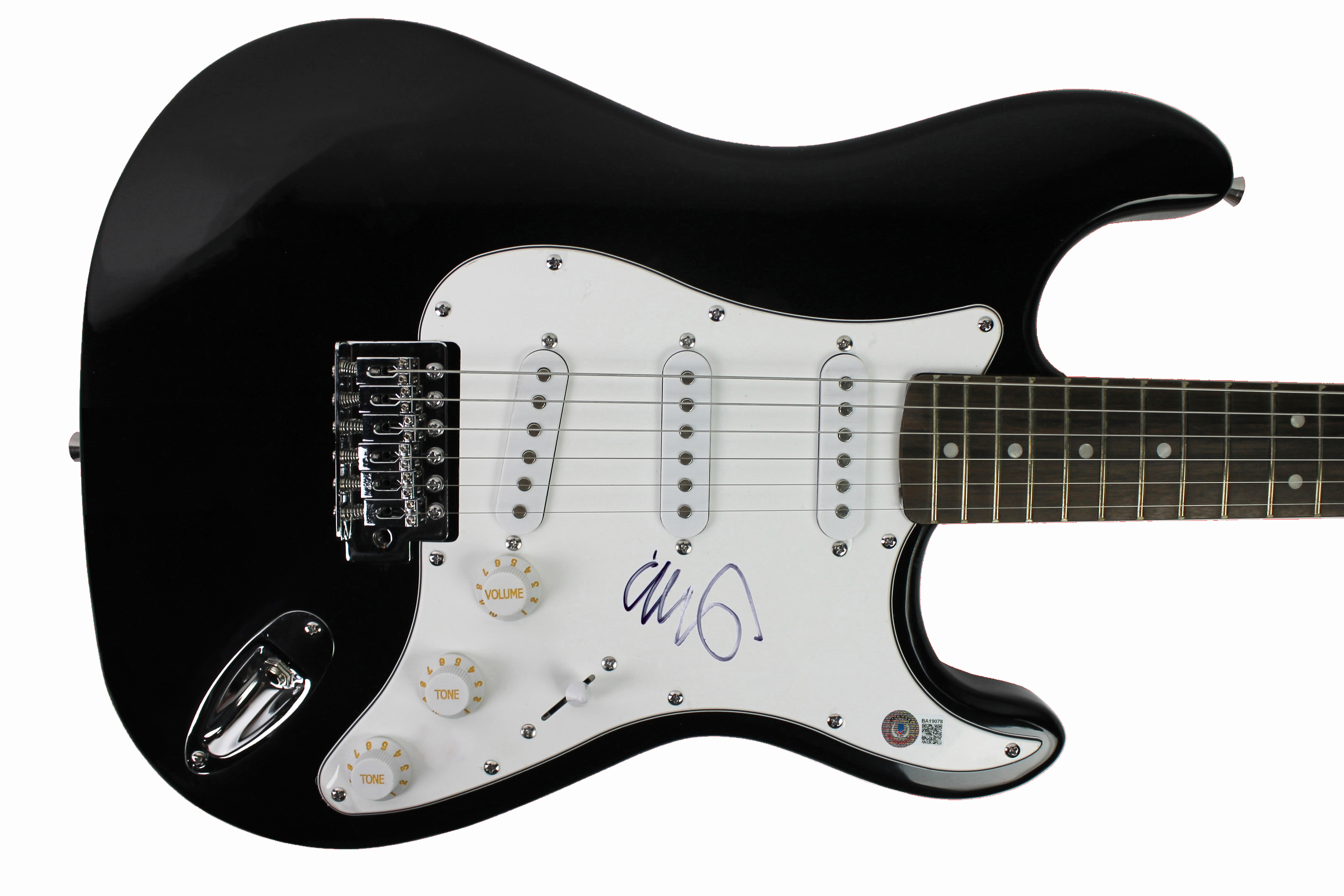 This Autographed Black Electric Guitar has been Personally Signed by Chris Martin of Coldplay. This item is 100% Authentic to include a hologram by Beckett Authentication Services. This item will come with an affixed Beckett Authentication Services (BAS) authentication sticker, which includes a scannable QR code to verify authenticity. Please note that Beckett no longer provides serial-numbered COA cards, and the attached BAS sticker will serve as the complete authentication for this item.The authenticity can be verified on Beckett Authentication Services website. The signature is slightly smeared. Please refer to pictures for item's condition.