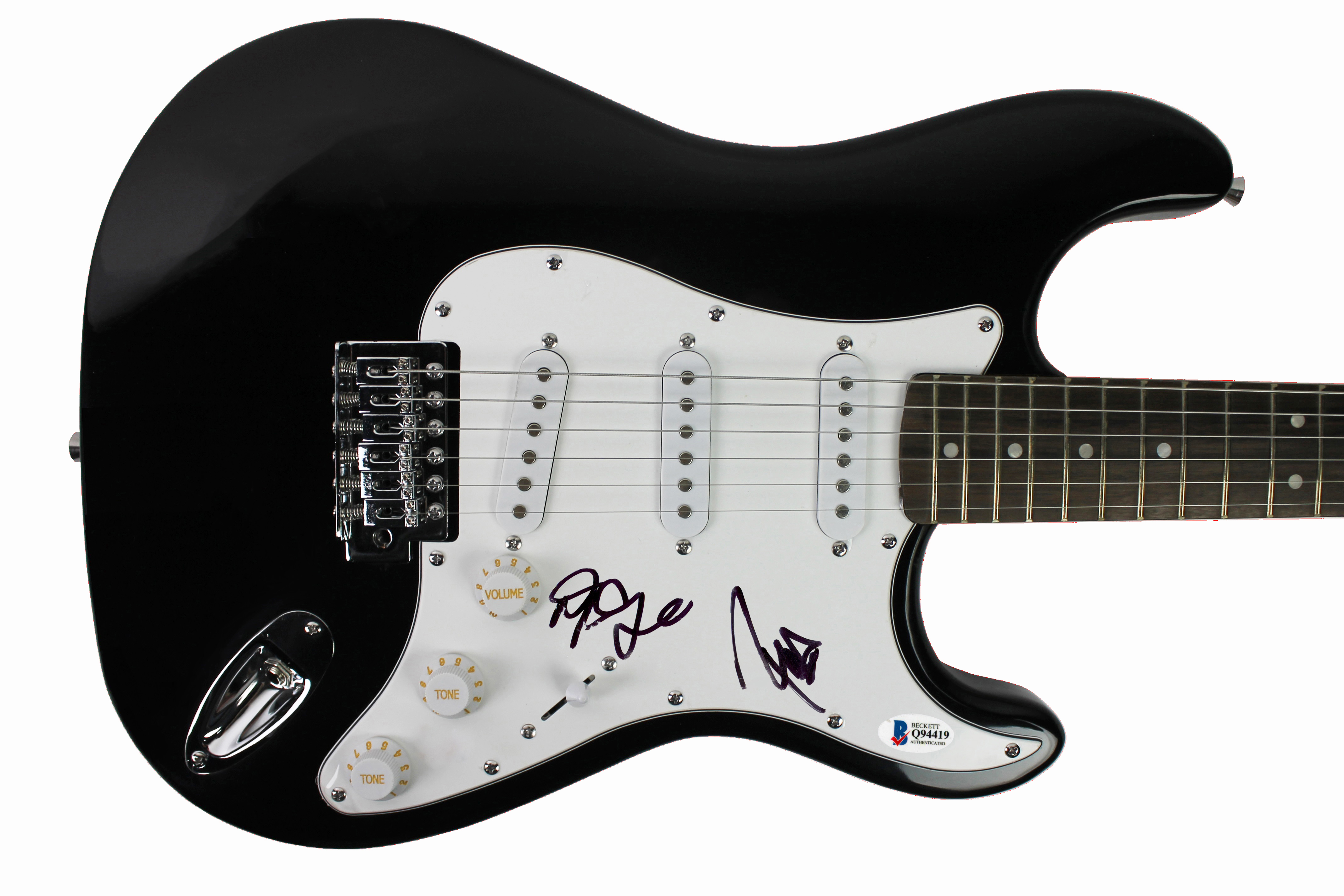 This Autographed Black Electric Guitar has been Personally Signed by Robert DeLeo & Dean DeLeo of Stone Temple Pilots. This item is 100% Authentic to include a Certificate of Authenticity (COA) / hologram by Beckett Authentication Services.The authenticity can be verified on Beckett Authentication Services website. This guitar will not come with its matching Beckett COA card, but its authenticity can still be searched and verified in Beckett's database. The signature is slightly smeared. Please refer to pictures for item's condition.