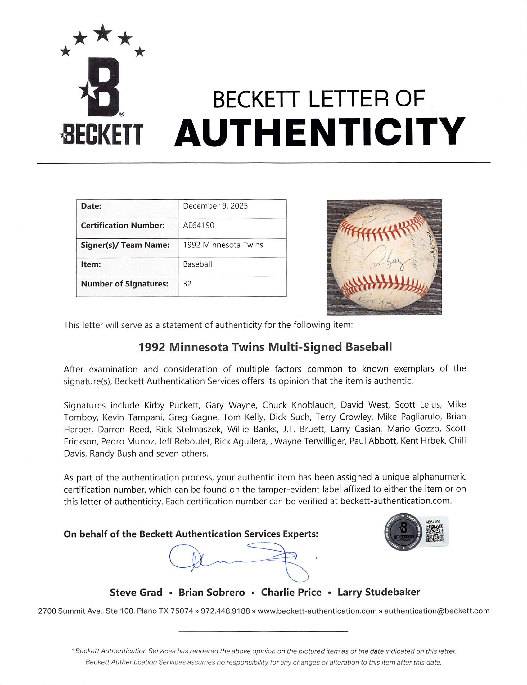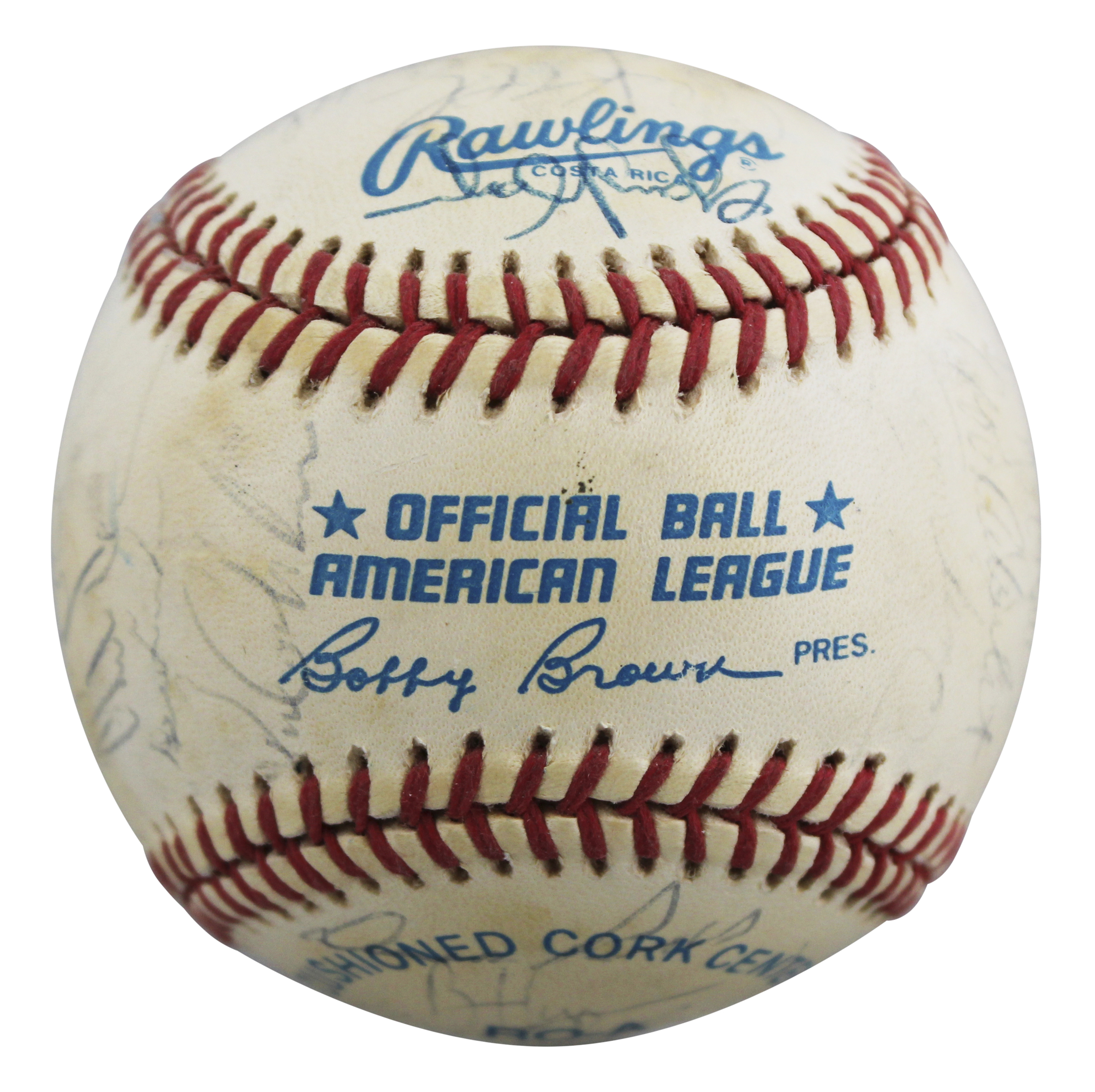 This Autographed Rawlings Official American League Baseball Bobby Brown Baseball has been Personally Signed by Kirby Puckett, Gary Wayne, Chuck Knoblauch, David West, Scott Leius, Mike Tomboy, Kevin Tampani, Greg Gagne, Tom Kelly, Dick Such, Terry Crowley, Mike Pagliarulo, Brian Harper, Darren Reed, Rick Stelmaszek, Willie Banks, J.T. Bruett, Larry Casian, Mario Gozzo, Scott Erickson, Pedro Munoz, Jeff Reboulet, Rick Aguilera, Wayne Terwilliger, Paul Abbott, Kent Hrbek, Chili Davis, Randy Bush, & 7 others of the Minnesota Twins. This item is 100% Authentic to include a Certificate of Authenticity (COA) / hologram by Beckett Authentication Services. The authenticity can be verified on Beckett Authentication Services website.