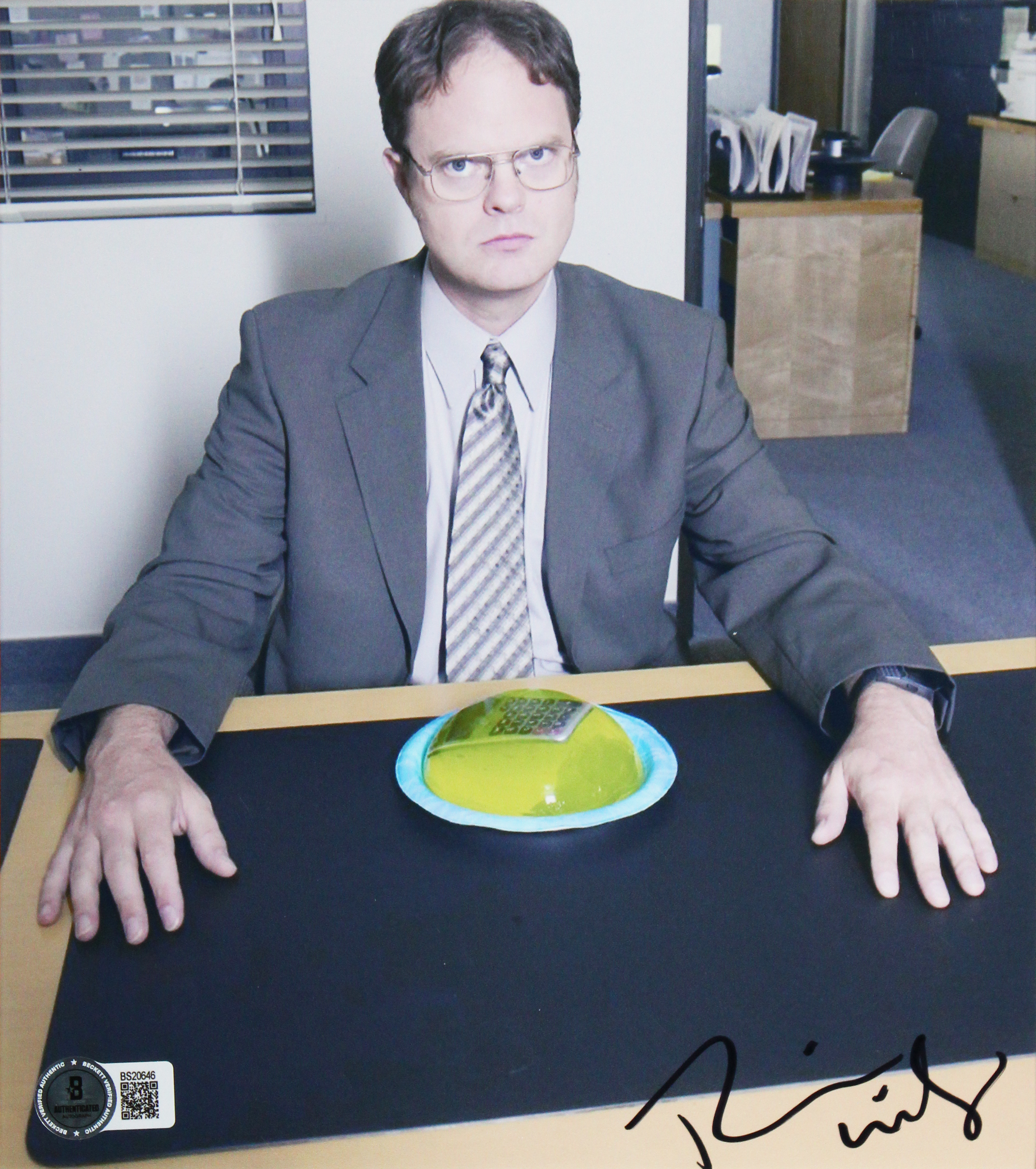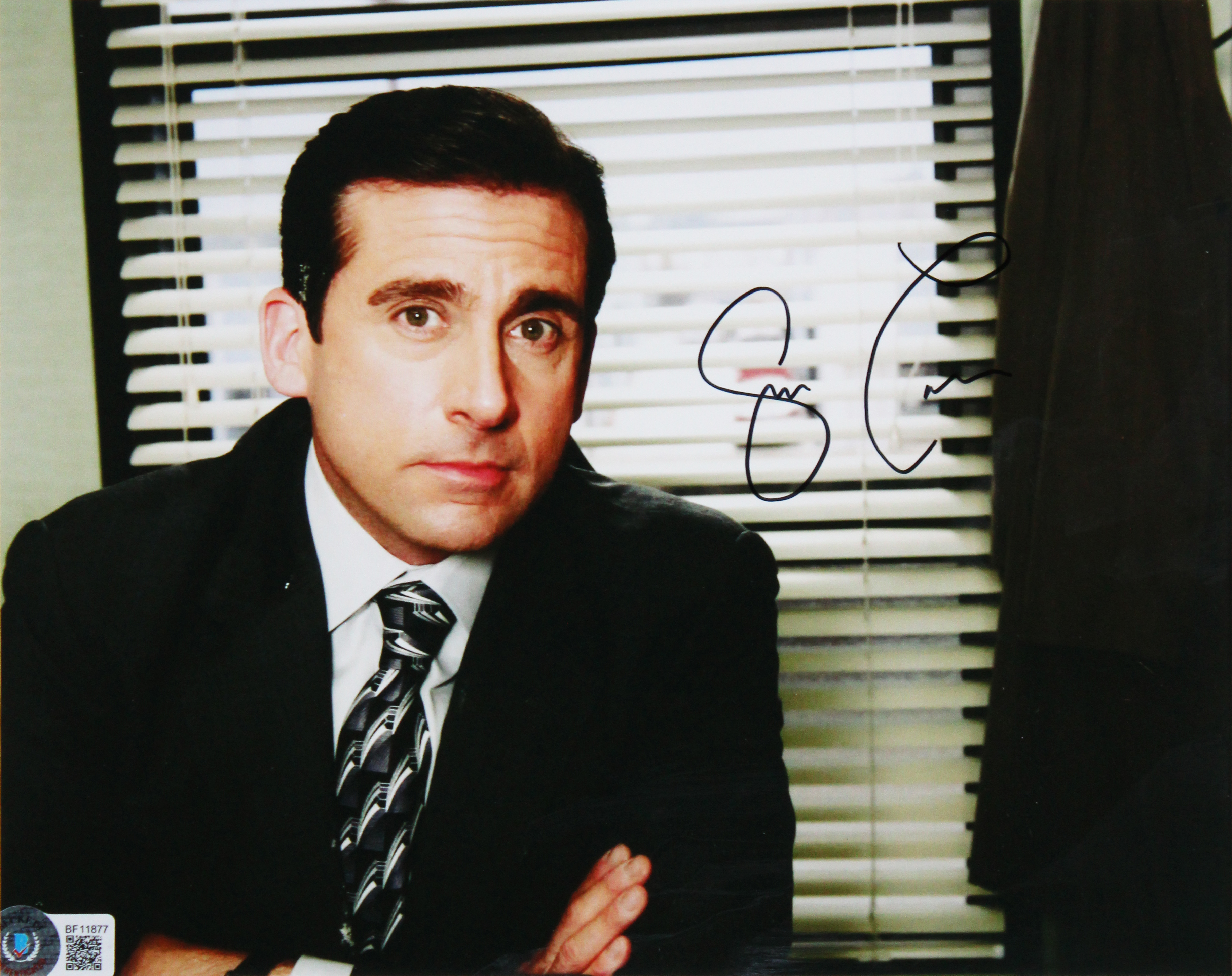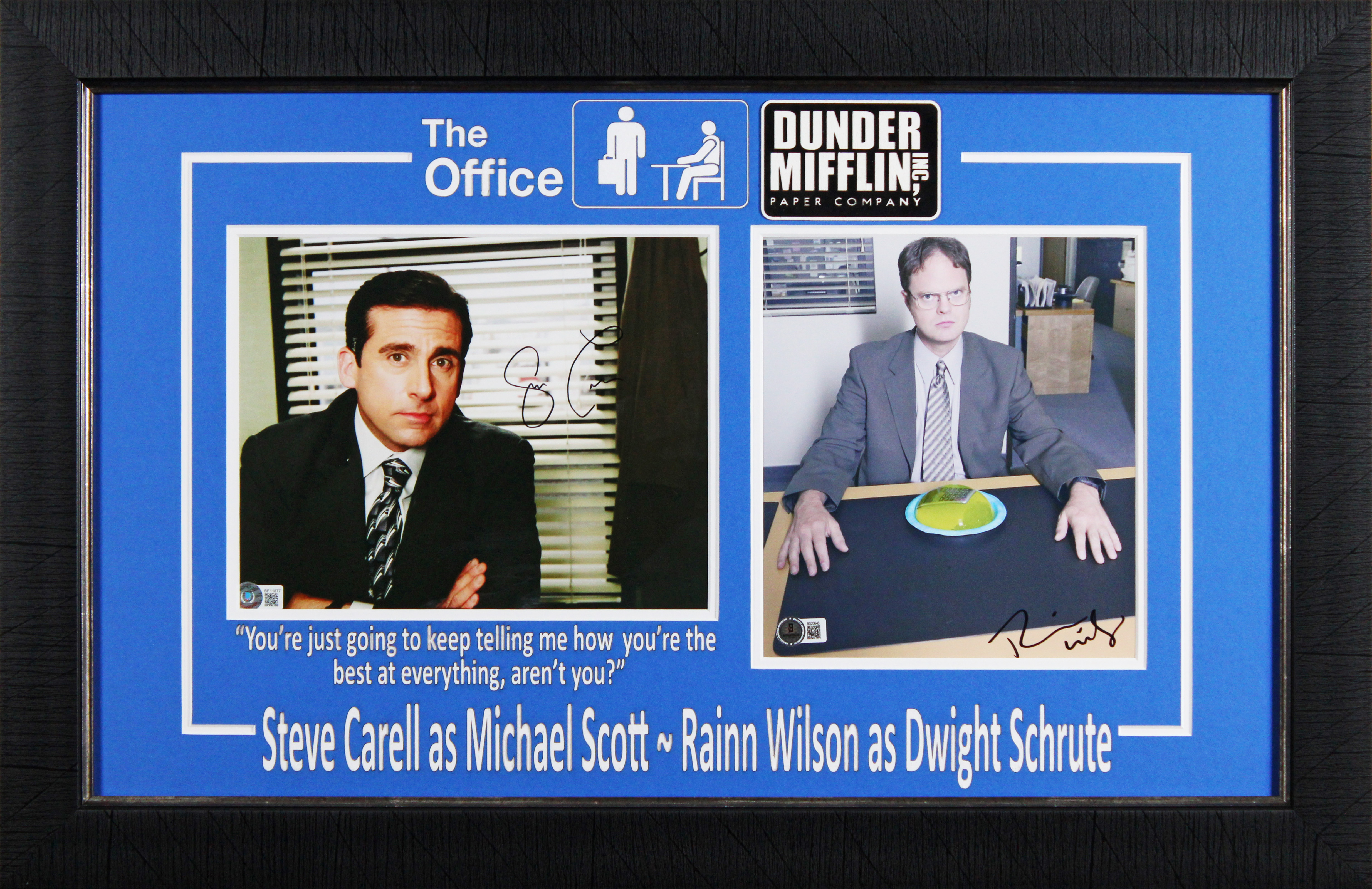 This Autographed 8x10 Framed Photo has been Personally Signed by Steve Carell & Rainn Wilson of The Office. This item is 100% Authentic to include a hologram by Beckett Authentication Services. This item will come with an affixed Beckett Authentication Services (BAS) authentication sticker, which includes a scannable QR code to verify authenticity. Please note that Beckett no longer provides serial-numbered COA cards, and the attached BAS sticker will serve as the complete authentication for this item. The authenticity can be verified on Beckett Authentication Services website. This item has been professionally framed to overall dimensions of approximately 18.5 x 28.5 inches.