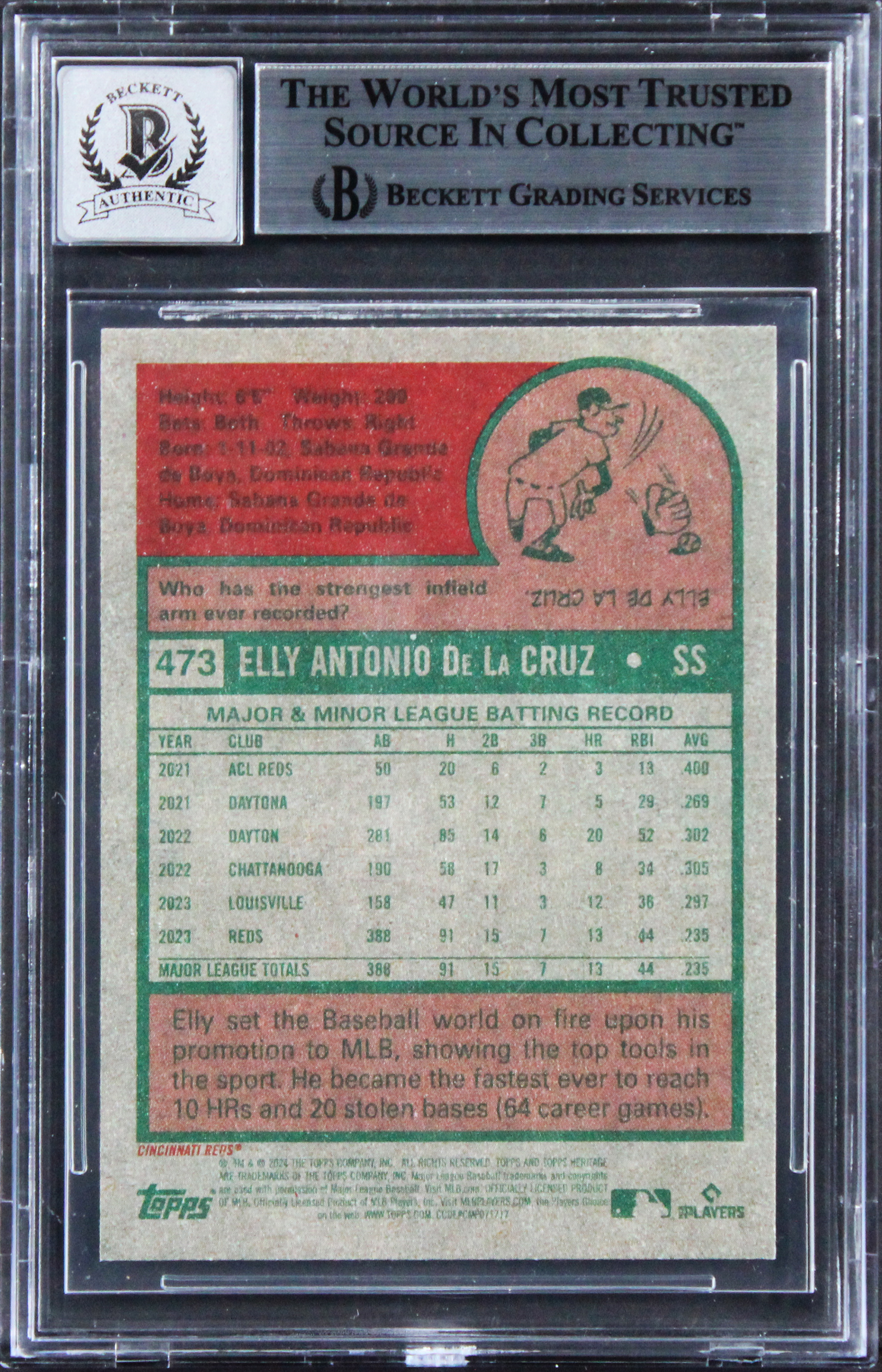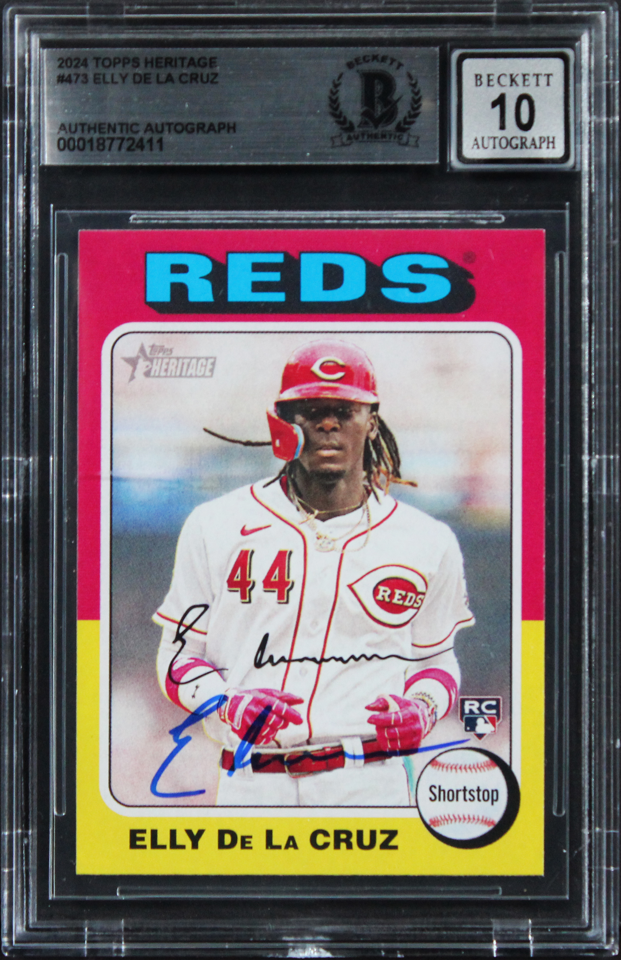 This Autographed Auto Graded Gem Mint 10! 2024 Topps Heritage #473 Rookie Card has been Personally Signed by Elly De La Cruz of the Cincinnatti Reds. This item is 100% Authentic, it comes slabbed and authenticated by Beckett Authentication Services. We have multiples of this same item. While the photographs are representative of this item, the size and placement of the signature may vary. Each item is hand signed, therefore, each autograph is unique.