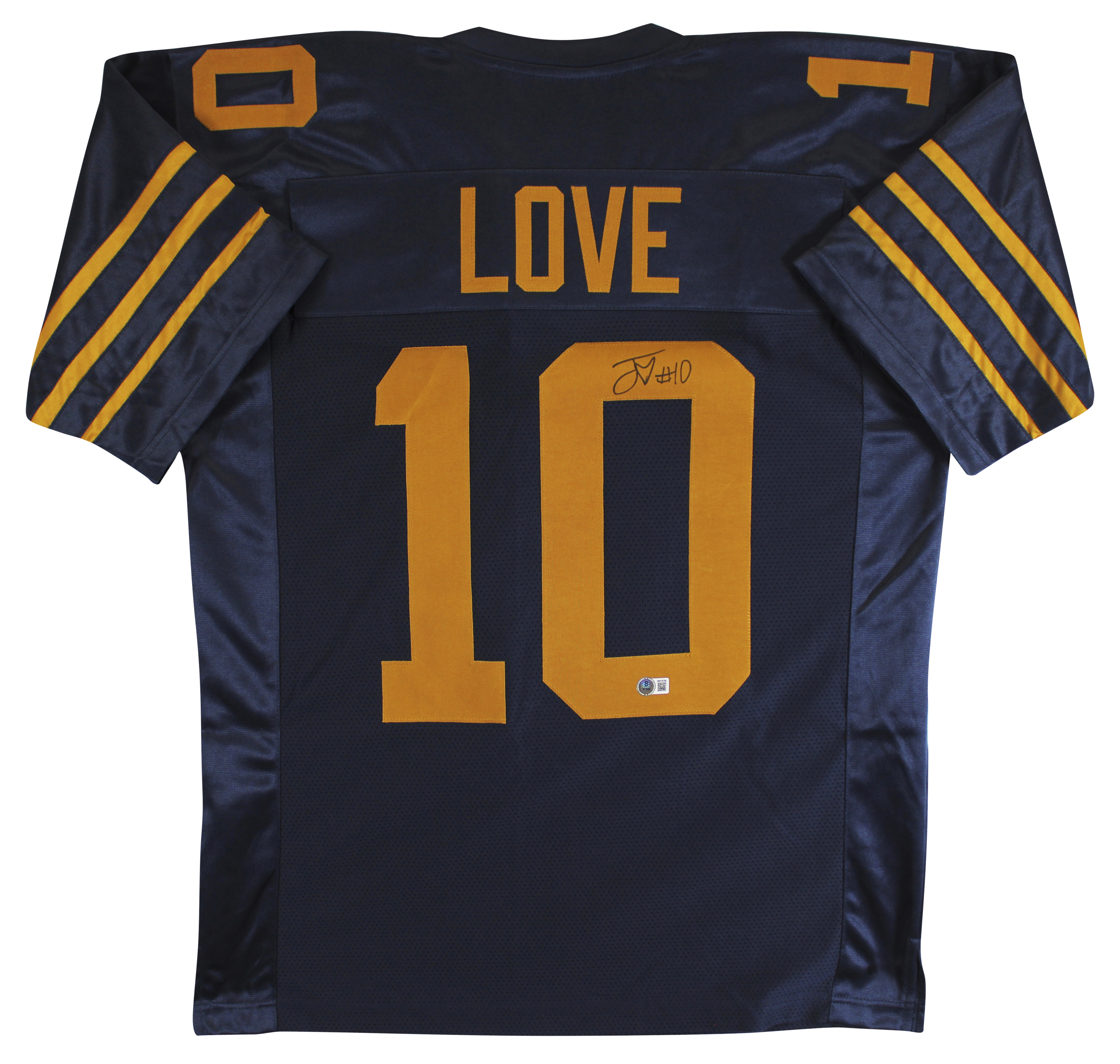 This Autographed Navy Throwback Pro Style Jersey has been Personally Signed by Jordan Love of the Green Bay Packers. This item is 100% Authentic to include a hologram by Beckett Authentication Services. This item will come with an affixed Beckett Authentication Services (BAS) authentication sticker, which includes a scannable QR code to verify authenticity. Please note that Beckett no longer provides serial-numbered COA cards, and the attached BAS sticker will serve as the complete authentication for this item. This is a BAS Witnessed Protection Program item which means a Beckett Authentication Service representative was present when this item was being signed. The authenticity can be verified on Beckett Authentication Services website. This is a X-Large sized, non-branded, custom-stitched Jersey.