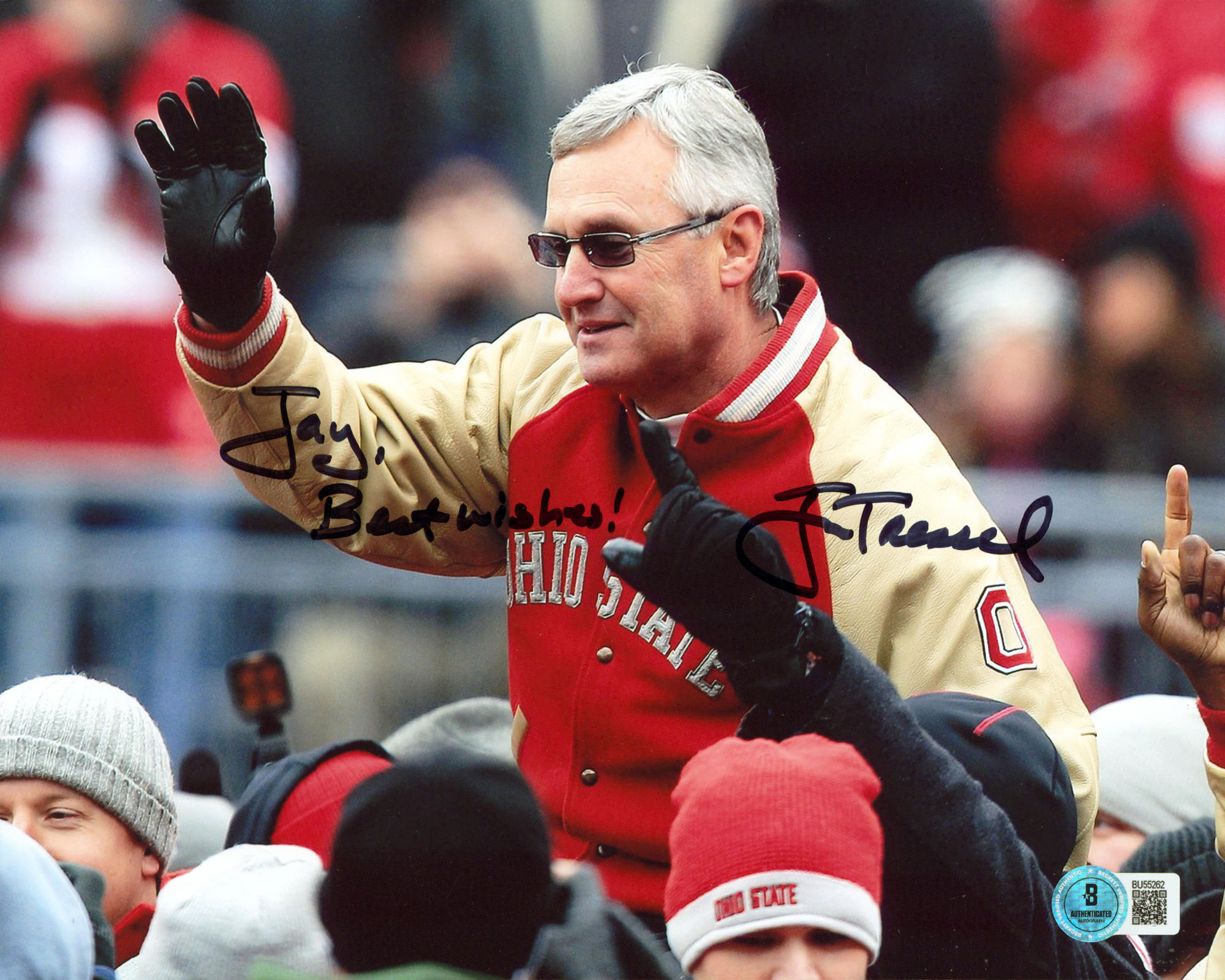 This Autographed Horizontal 8x10 Photo with the inscription of "Jay, Best Wishes!" has been Personally Signed by Jim Tressel of the Ohio State Buckeyes. This item is 100% Authentic to include a hologram by Beckett Authentication Services. This item will come with an affixed Beckett Authentication Services (BAS) authentication sticker, which includes a scannable QR code to verify authenticity. Please note that Beckett no longer provides serial-numbered COA cards, and the attached BAS sticker will serve as the complete authentication for this item. The authenticity can be verified on Beckett Authentication Services website.