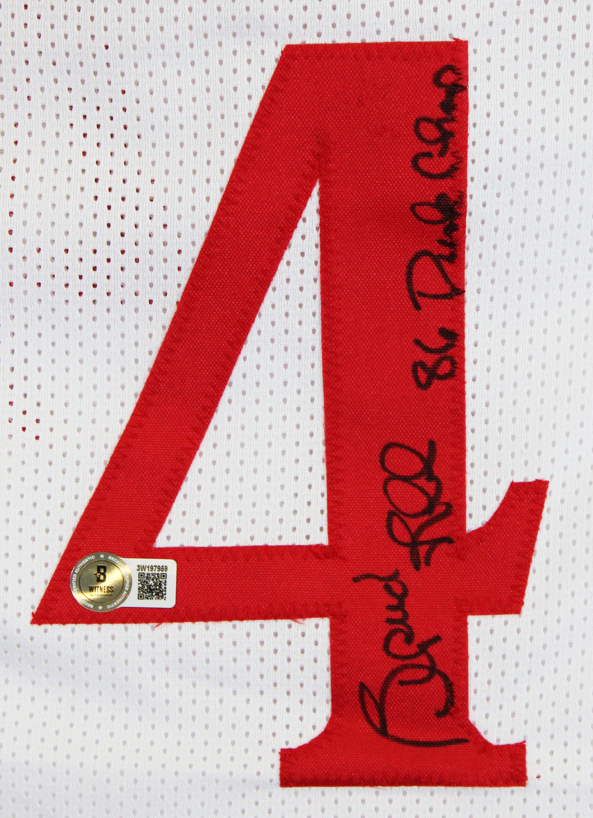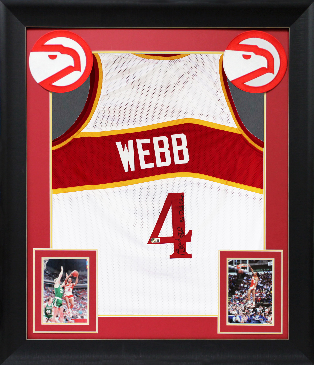This Autographed White Pro Style Framed Jersey with the inscription of "86 Dunk Champ" has been Personally Signed by Spud Webb of the Atlanta Hawks. This item is 100% Authentic to include a hologram by Beckett Authentication Services. This item will come with an affixed Beckett Authentication Services (BAS) authentication sticker, which includes a scannable QR code to verify authenticity. Please note that Beckett no longer provides serial-numbered COA cards, and the attached BAS sticker will serve as the complete authentication for this item. This is a BAS Witnessed Protection Program item which means a Beckett Authentication Service representative was present when this item was being signed. We conducted an autograph signing with Spud Webb where multiples of the same item were signed. While the photographs are representative of this item, the size, placement and strength of the signature may vary. Each item is hand signed, therefore, each autograph is unique. This item can be verified through BAS Witnessed. This item has been professionally framed to overall dimensions of approximately 32 x 37 inches. This is a X-Large sized, non-branded, custom-stitched Framed Jersey. This jersey will be framed to order, it will take approximately 3-4 business days from purchase date for it to ship.
