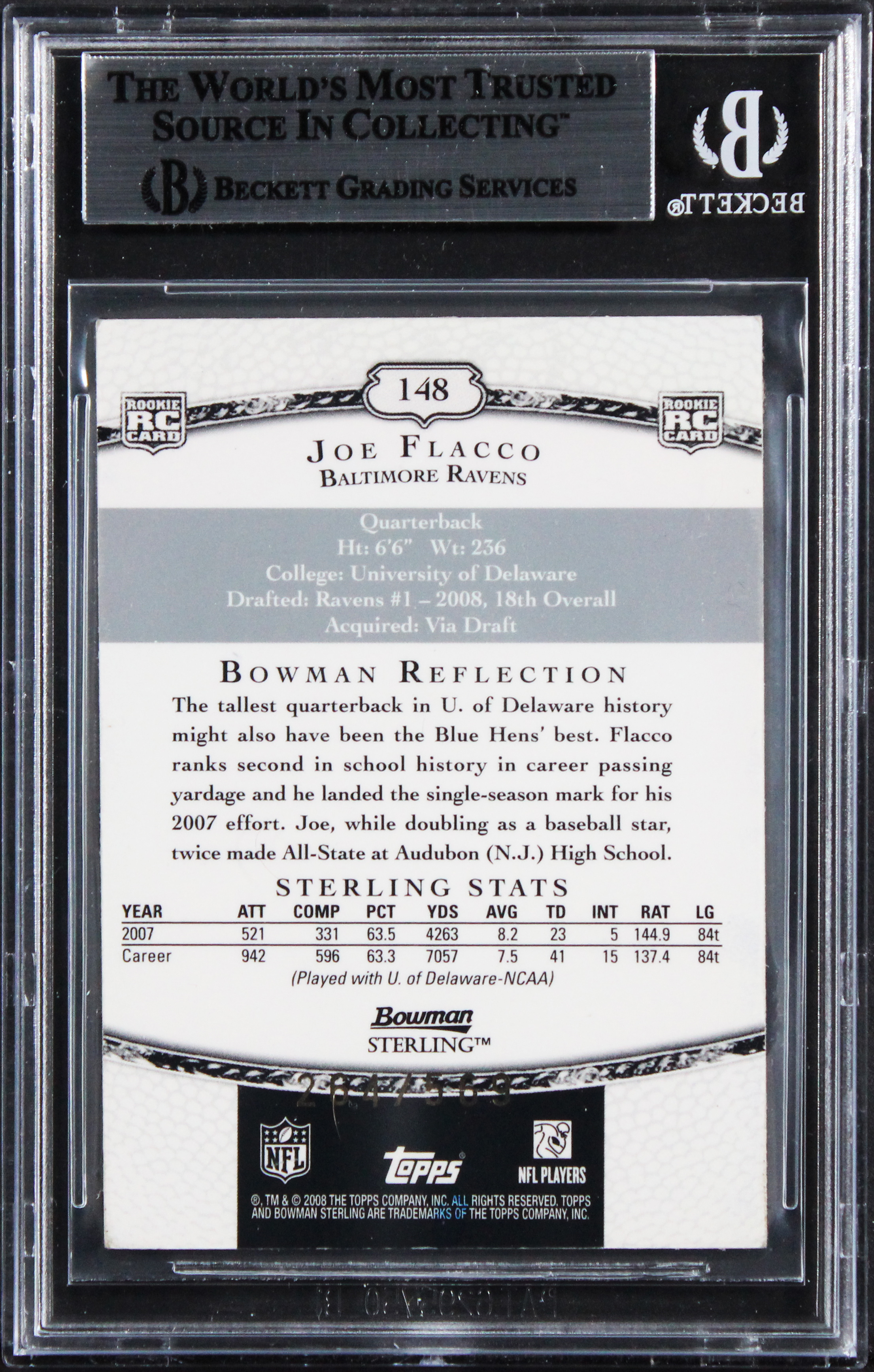 This Autographed 2008 Bowman Sterling #148A Jersey Patch Rookie 264/569 Card has been Personally Signed by Joe Flacco of the Baltimore Ravens. This item is 100% Authentic, it comes slabbed and authenticated by Beckett Authentication Services. The authenticity can be verified on Beckett Authentication Services website.