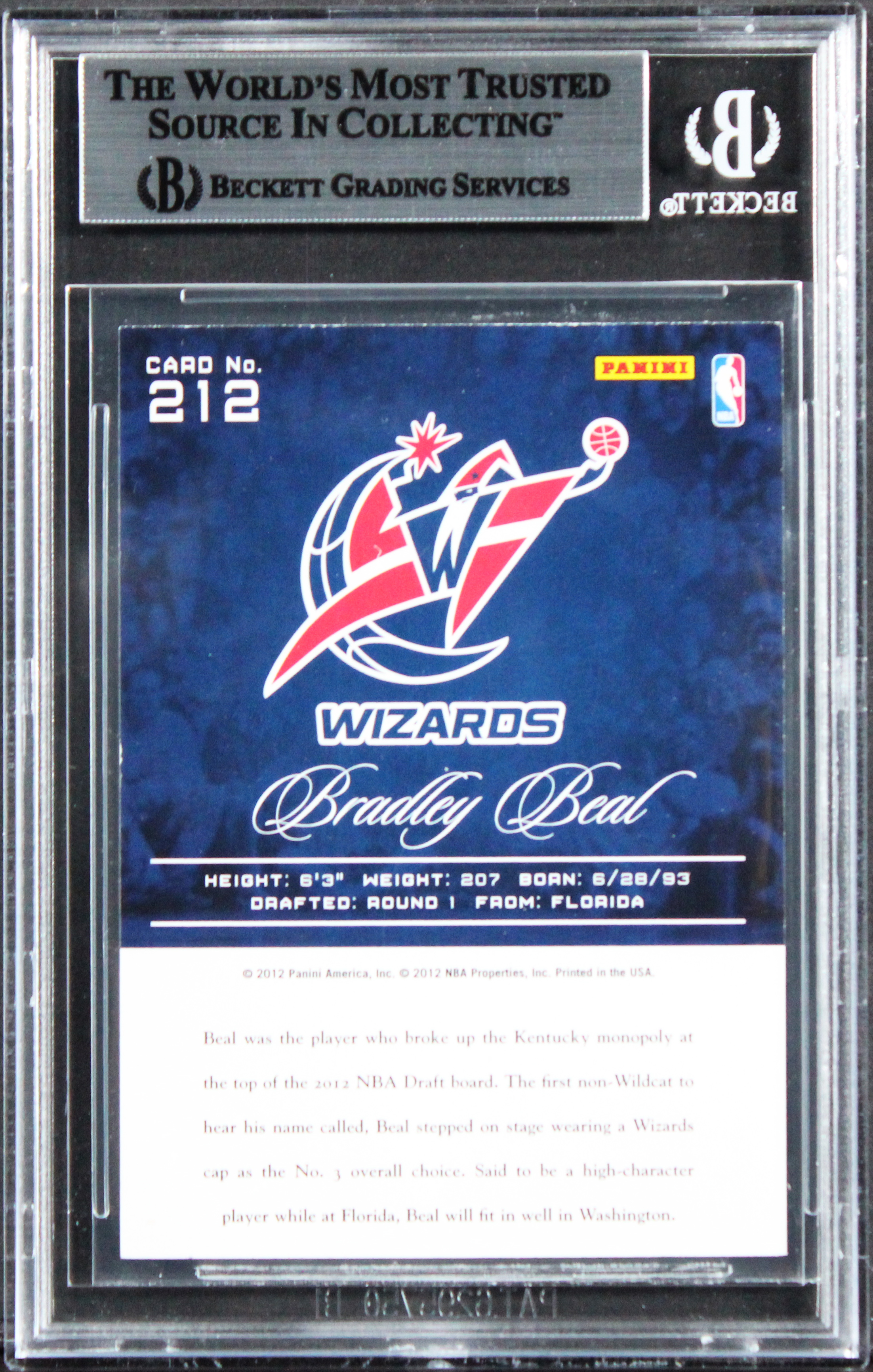 This Autographed 2012 Prestige #212 Rookie Card has been Personally Signed by Bradley Beal of the Washington Wizards. This item is 100% Authentic, it comes slabbed and authenticated by Beckett Authentication Services. The authenticity can be verified on Beckett Authentication Services website.