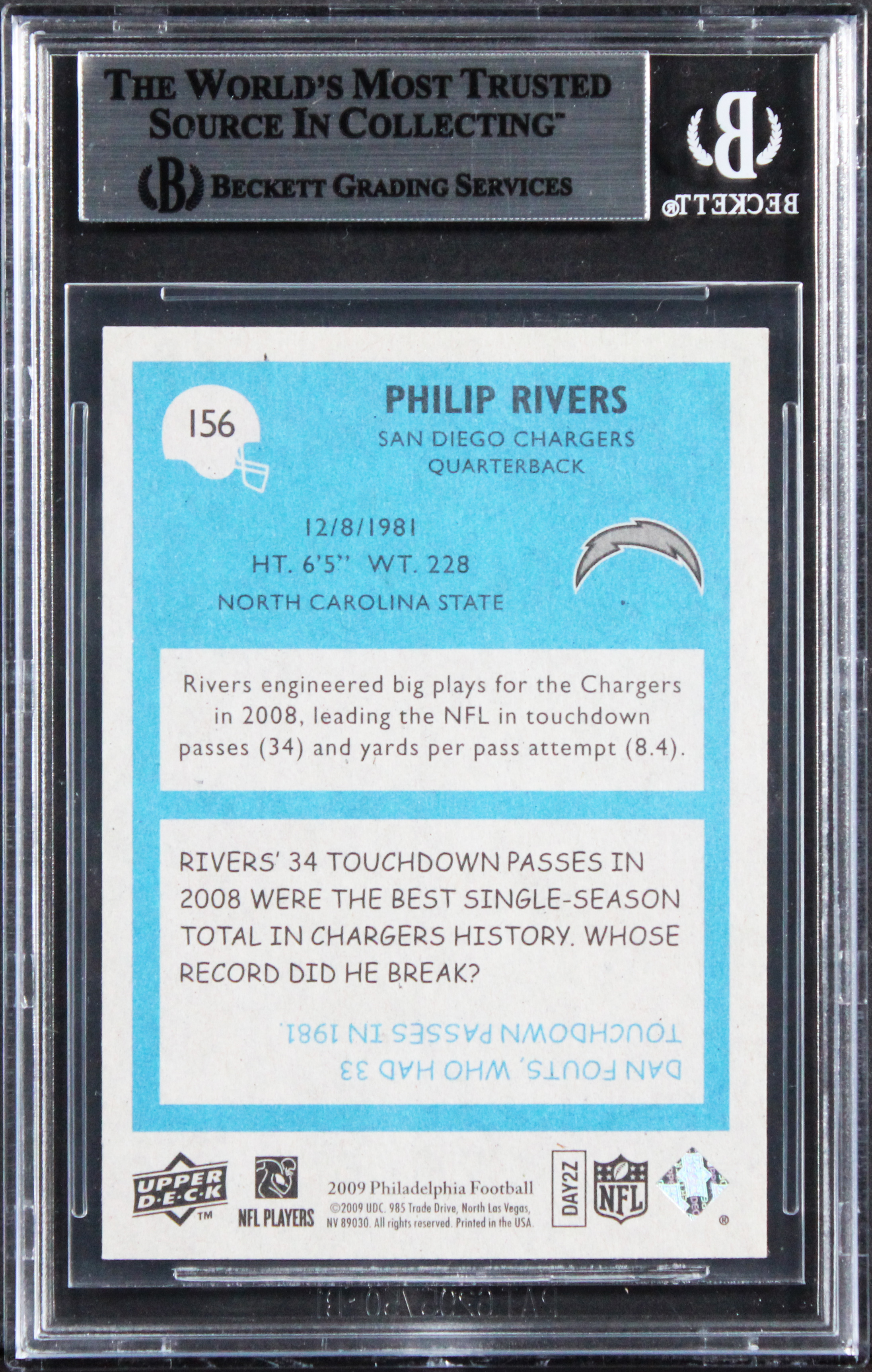 This Autographed 2009 Philadelphia #156 Card has been Personally Signed by Philip Rivers of the San Diego Chargers. This item is 100% Authentic, it comes slabbed and authenticated by Beckett Authentication Services. The authenticity can be verified on Beckett Authentication Services website.