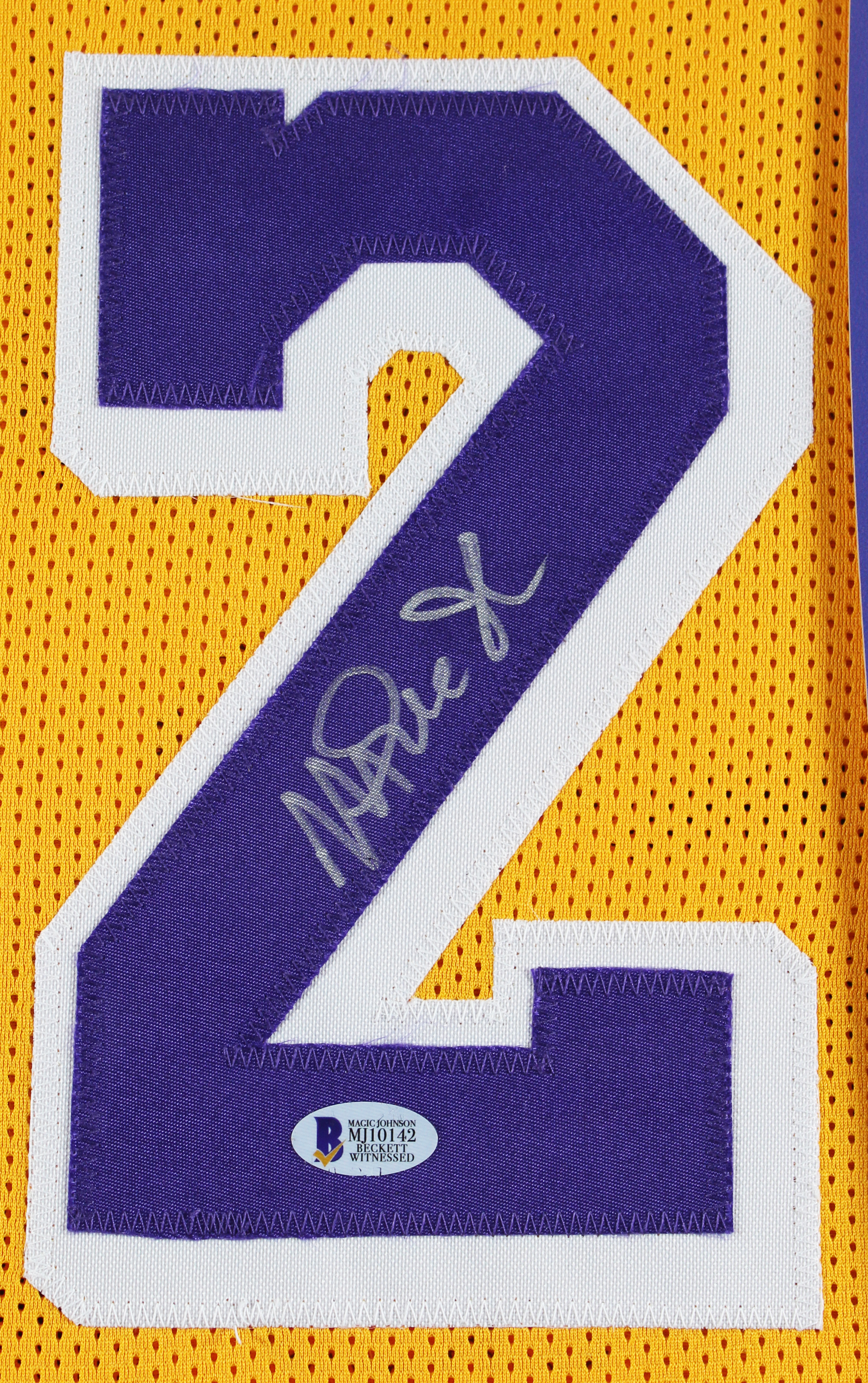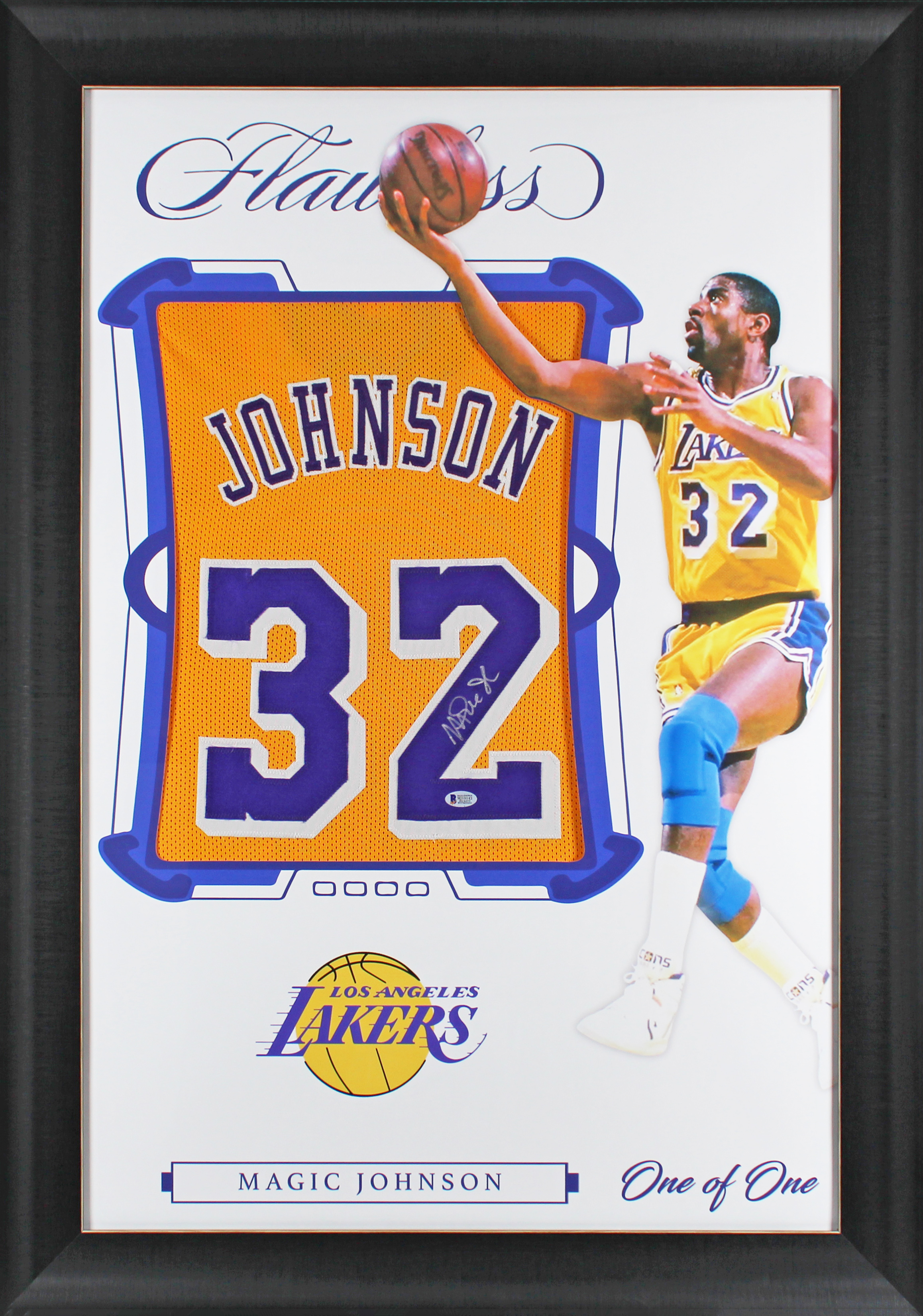 This Autographed One of One Jersey Framed Display has been Personally Signed by Magic Johnson of the Los Angeles Lakers. This item is 100% Authentic to include a hologram by Beckett Authentication Services. This item will come with an affixed Beckett Authentication Services (BAS) authentication sticker, which includes a scannable QR code to verify authenticity. Please note that Beckett no longer provides serial-numbered COA cards, and the attached BAS sticker will serve as the complete authentication for this item. This is a BAS Witnessed Protection Program item which means a Beckett Authentication Service representative was present when this item was being signed. We conducted an autograph signing with Magic Johnson where multiples of the same item were signed. While the photographs are representative of this item, the size, placement and strength of the signature may vary. Each item is hand signed, therefore, each autograph is unique. This item can be verified through BAS Witnessed. This item has been professionally framed to overall dimensions of approximately 28.5 x 40.5 inches.