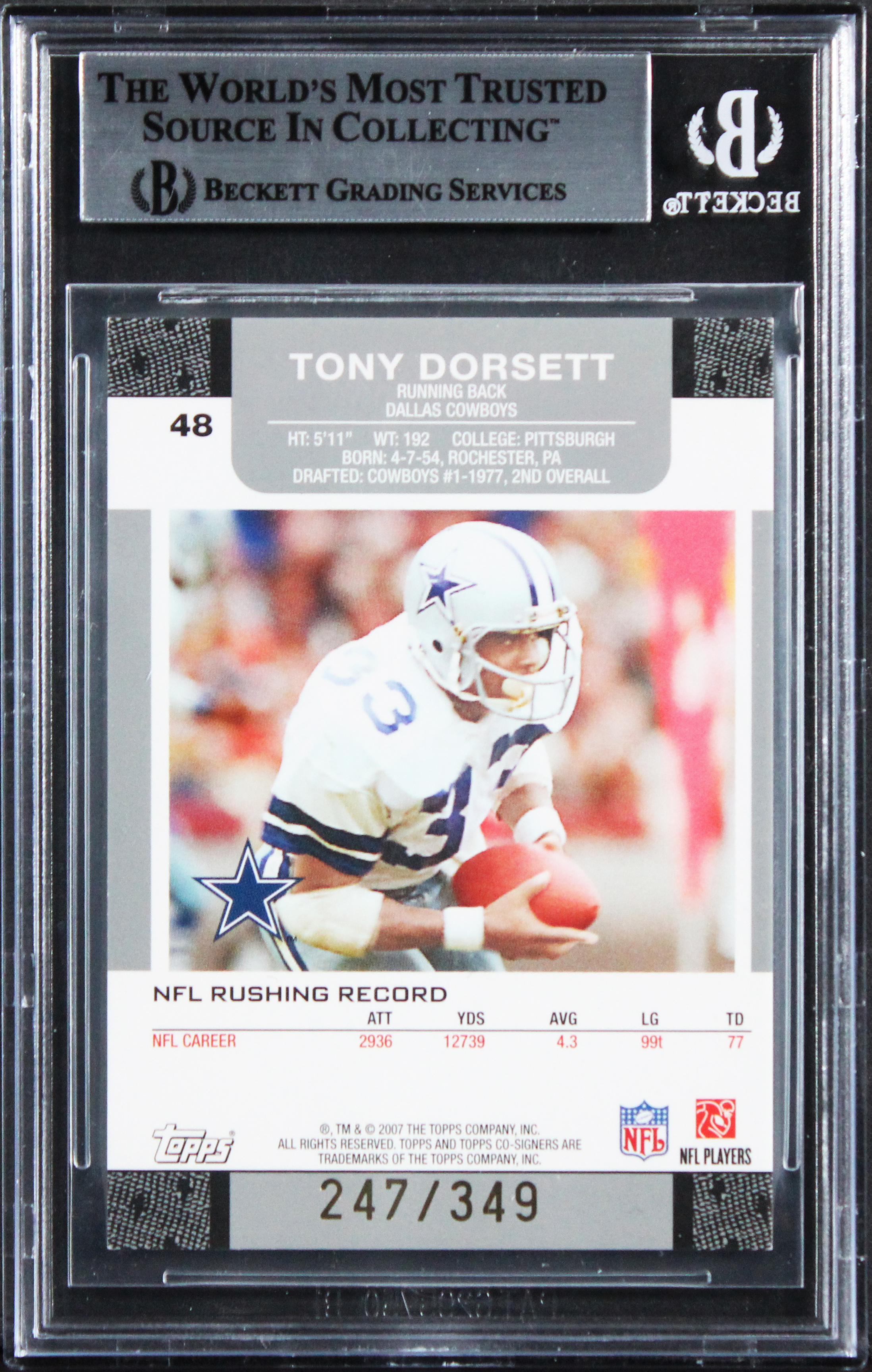 This Autographed 2007 Topps Co-Signers Changing Faces Gold Blue #48B Card has been Personally Signed by Adrian Peterson & Tony Dorsett. This item is 100% Authentic, it comes slabbed and authenticated by Beckett Authentication Services. The authenticity can be verified on Beckett Authentication Services website.