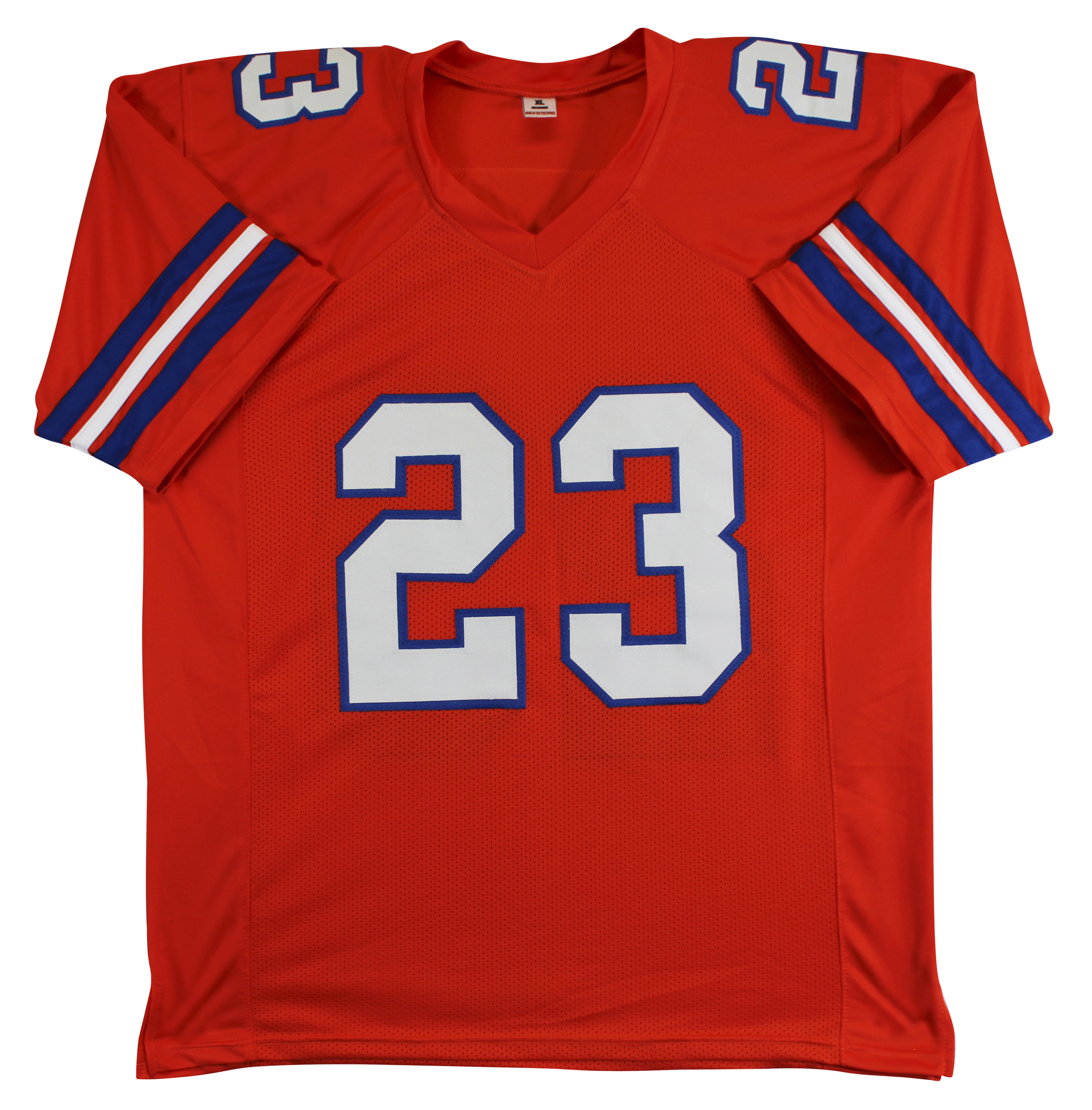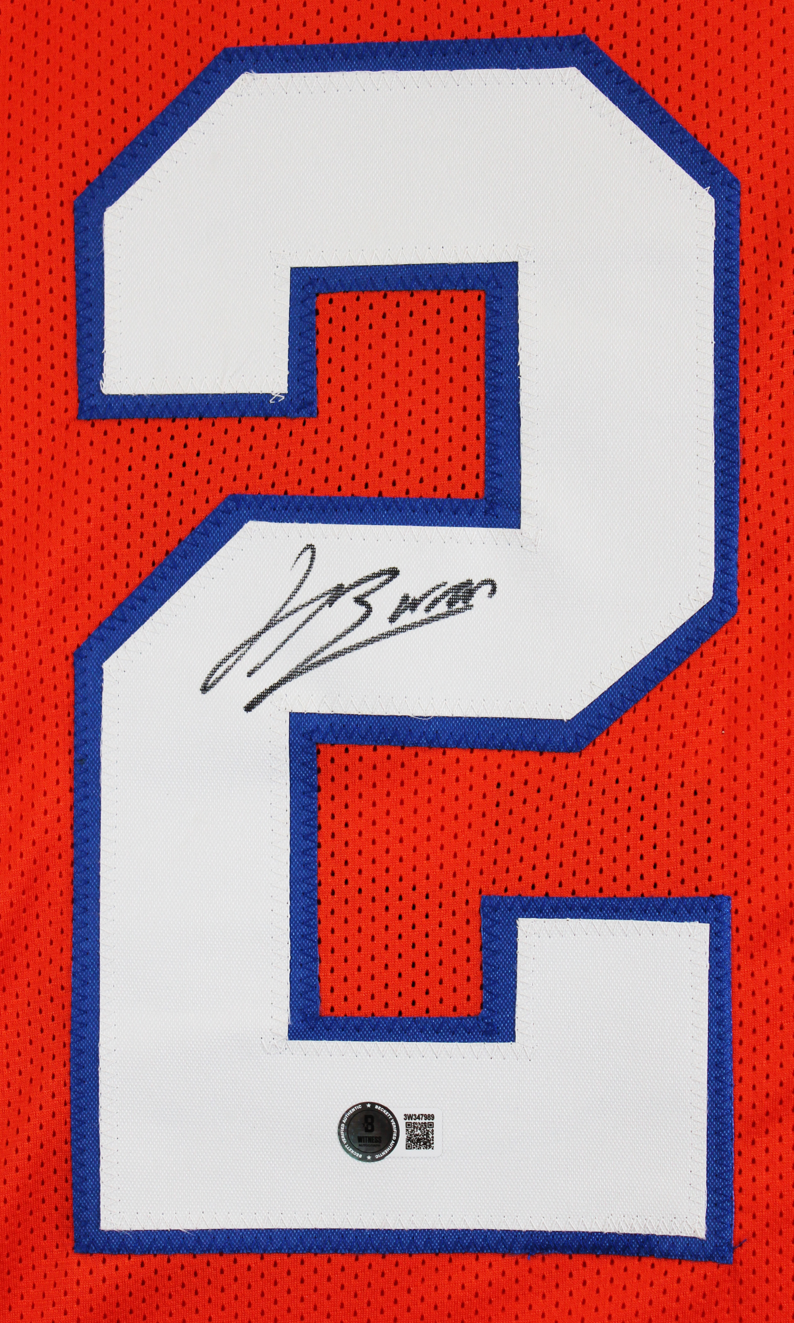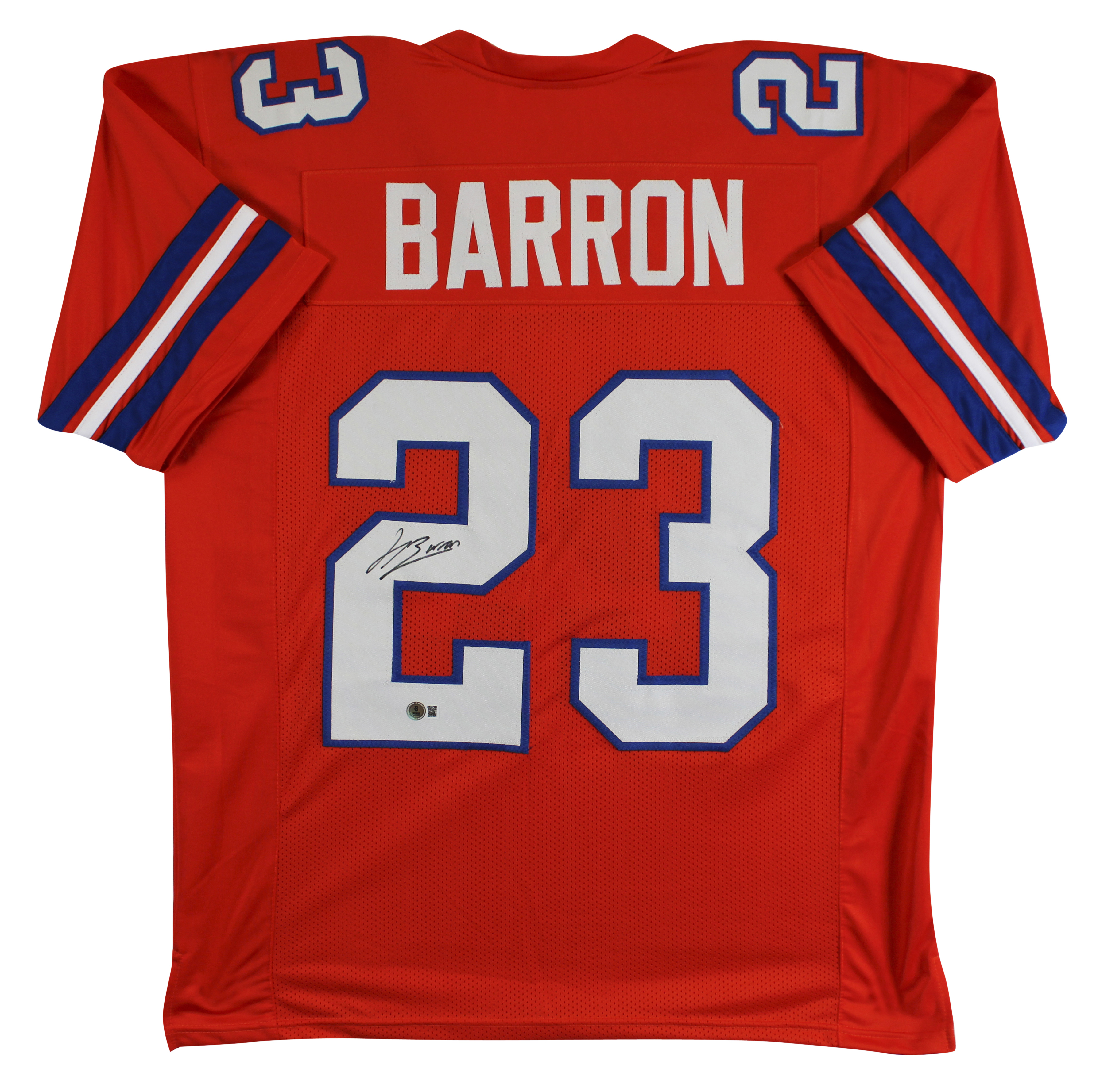 This Autographed Orange Pro Style Jersey has been Personally Signed by Jahdae Barron of the Denver Broncos. This item is 100% Authentic to include a hologram by Beckett Authentication Services. This item will come with an affixed Beckett Authentication Services (BAS) authentication sticker, which includes a scannable QR code to verify authenticity. Please note that Beckett no longer provides serial-numbered COA cards, and the attached BAS sticker will serve as the complete authentication for this item. This is a BAS Witnessed Protection Program item which means a Beckett Authentication Service representative was present when this item was being signed. We conducted an autograph signing with Jahdae Barron where multiples of the same item were signed. While the photographs are representative of this item, the size, placement and strength of the signature may vary. Each item is hand signed, therefore, each autograph is unique. This item can be verified through BAS Witnessed. This is a X-Large sized, non-branded, custom-stitched Jersey.