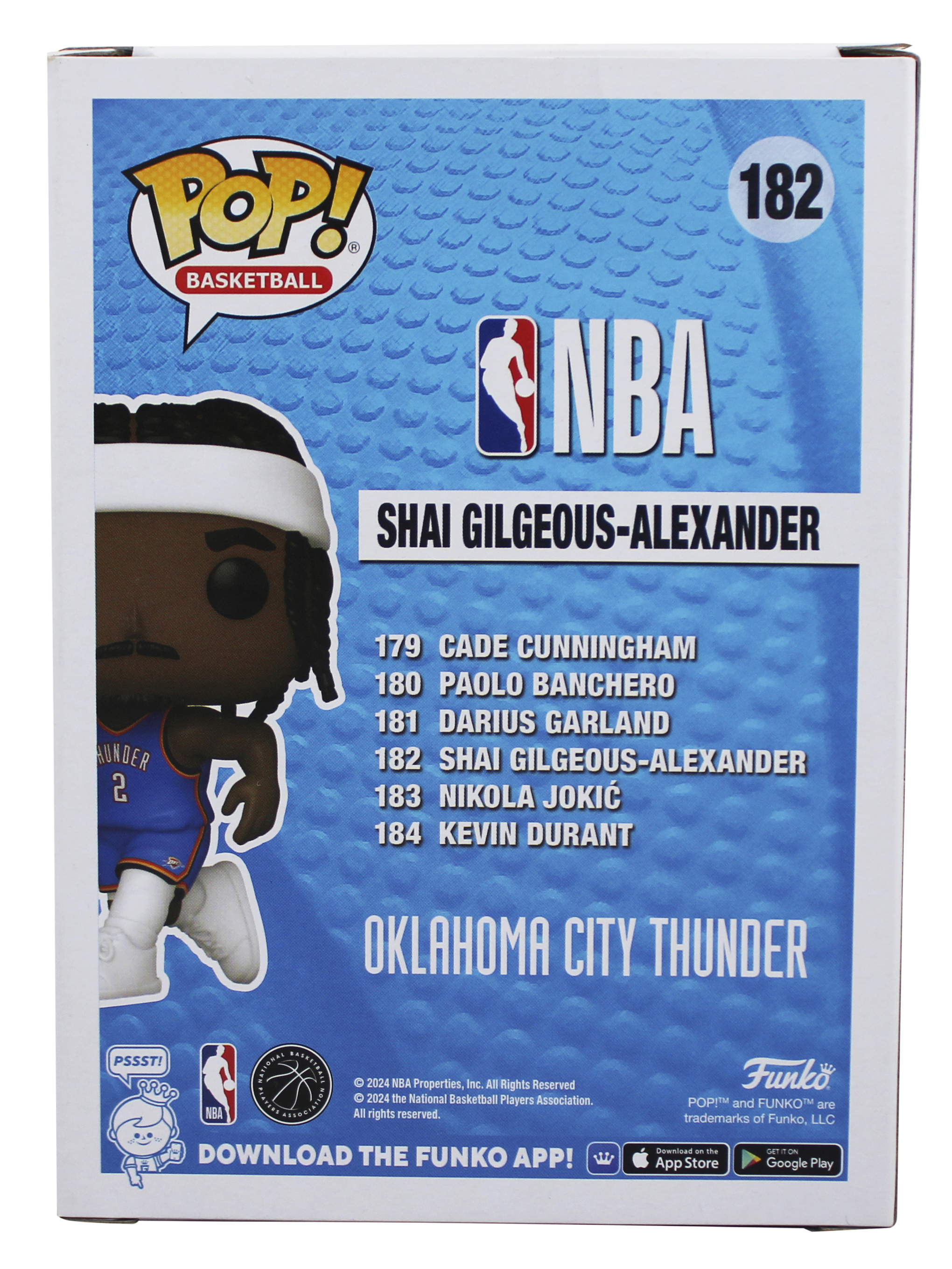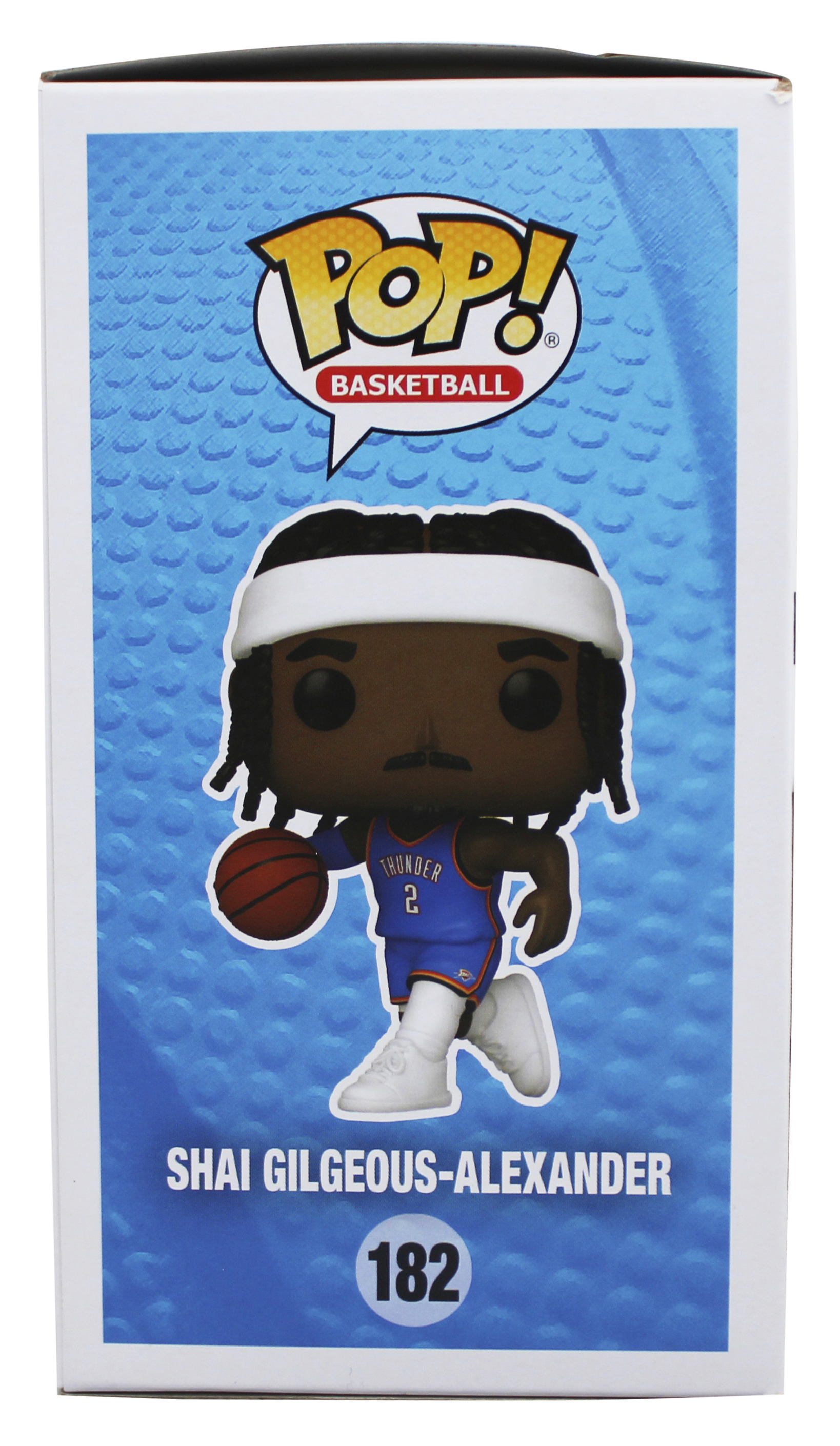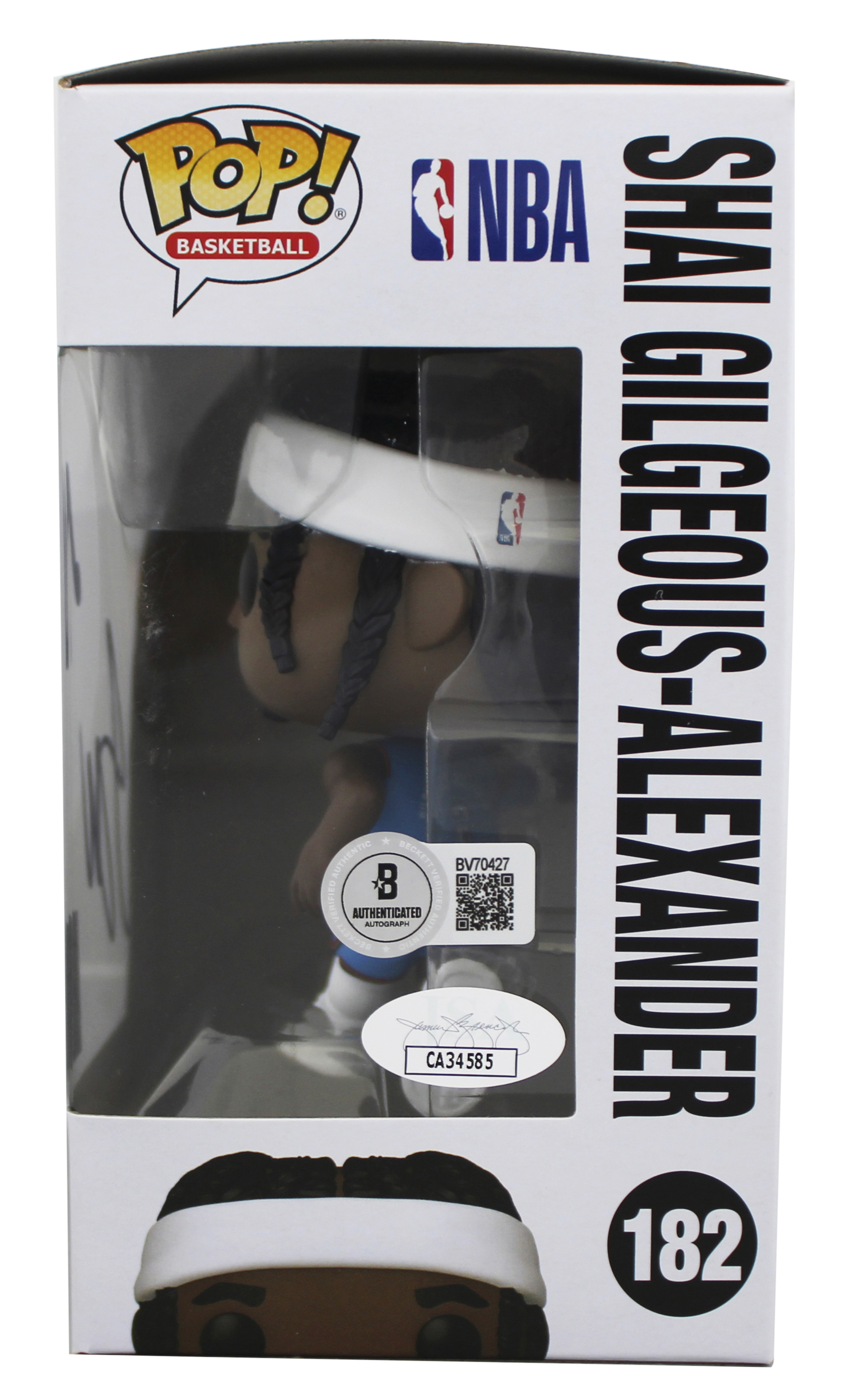 This Autographed #182 Funko Pop Vinyl Figure has been Personally Signed by Shai Gilgeous-Alexander of the Oklahoma City Thunder. This item is 100% Authentic to include a hologram by Beckett Authentication Services. This item will come with an affixed Beckett Authentication Services (BAS) authentication sticker, which includes a scannable QR code to verify authenticity. Please note that Beckett no longer provides serial-numbered COA cards, and the attached BAS sticker will serve as the complete authentication for this item. The authenticity can be verified on Beckett Authentication Services website. This item will ship in a Pop! Protector, please refer to the photos for condition of the item prior to purchase. There is some light damage to the box of the Funko. This Funko was previously authenticated by JSA, but it will not come with its matching JSA card. Its authenticity can still be searched in JSA's database.