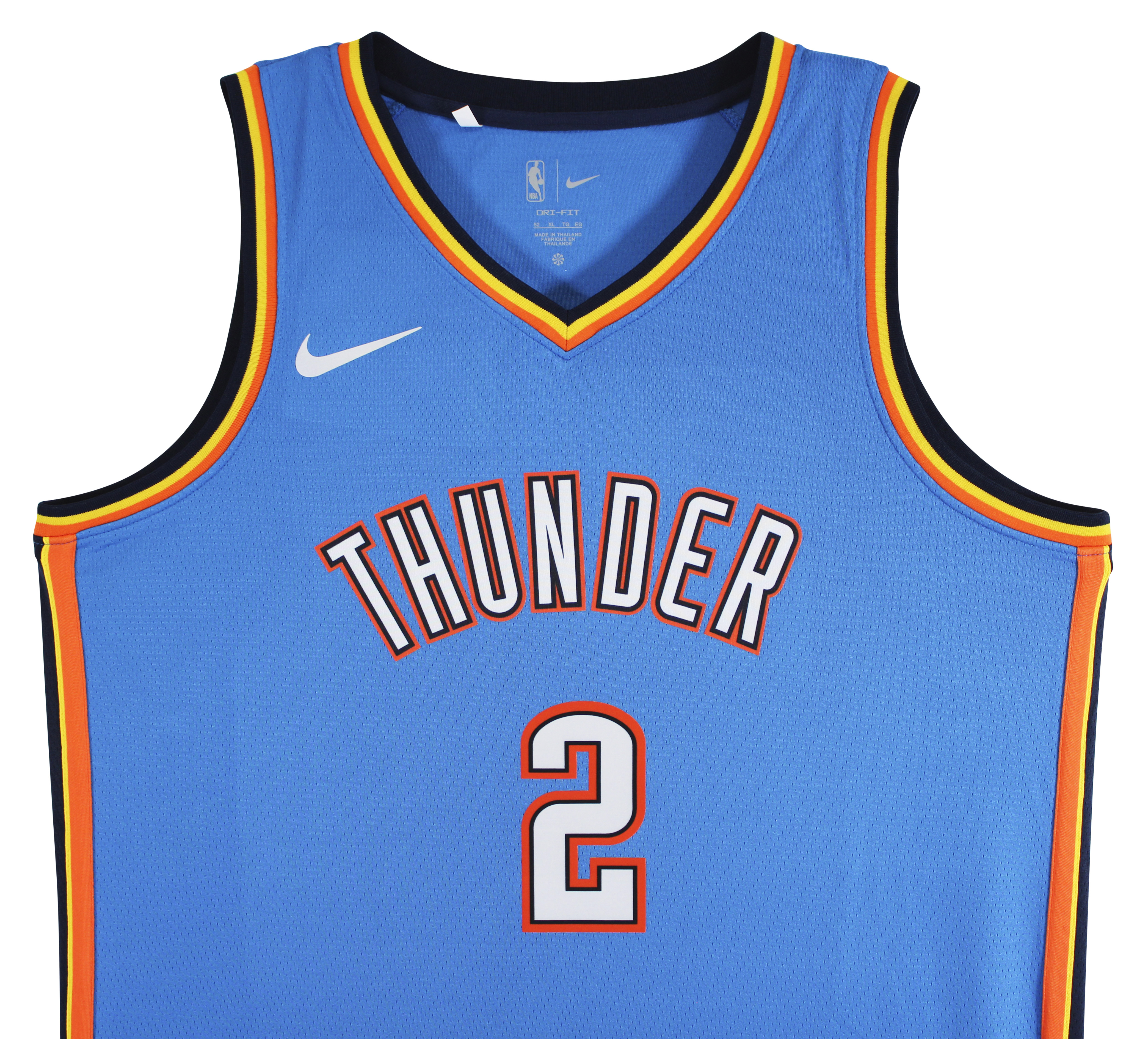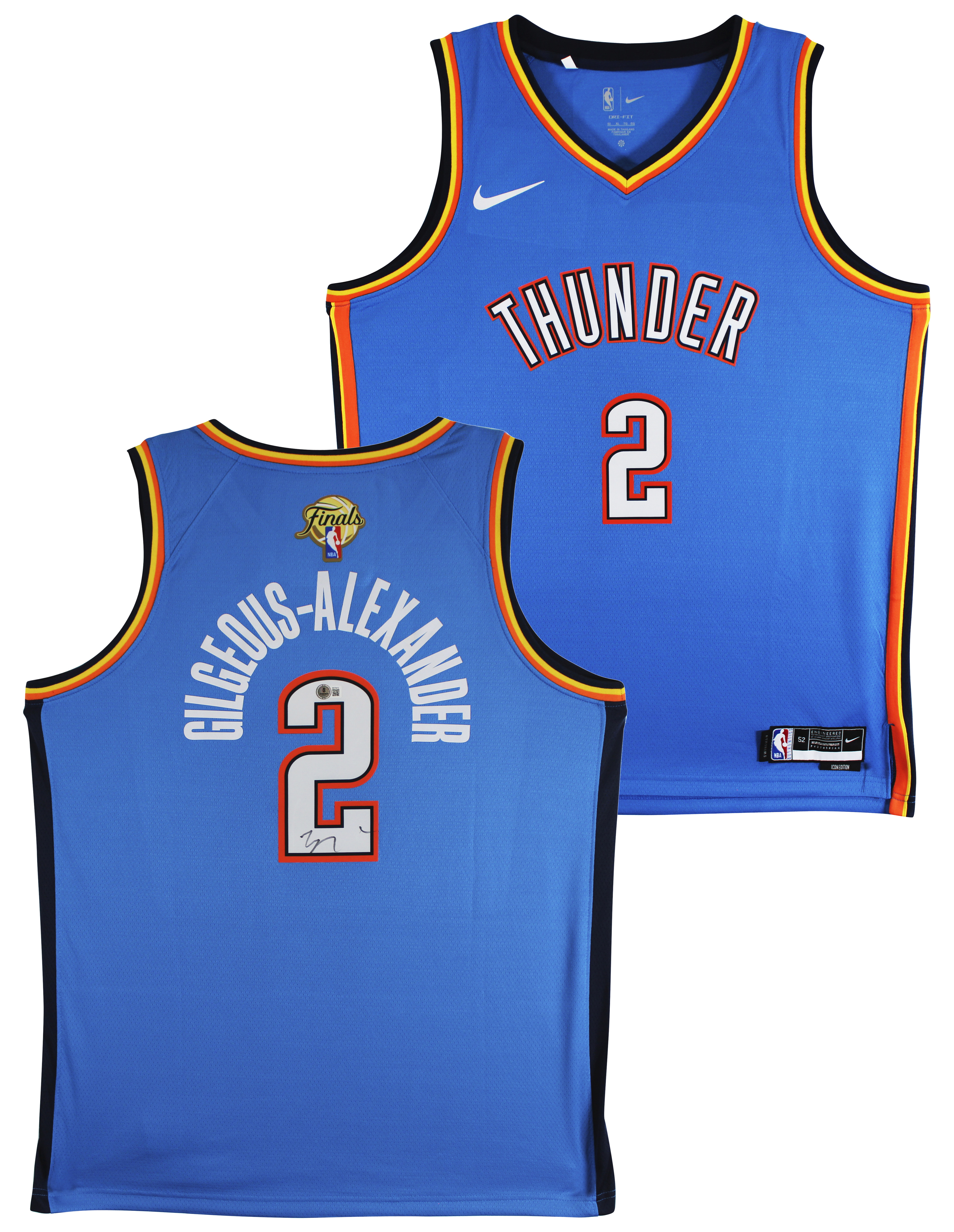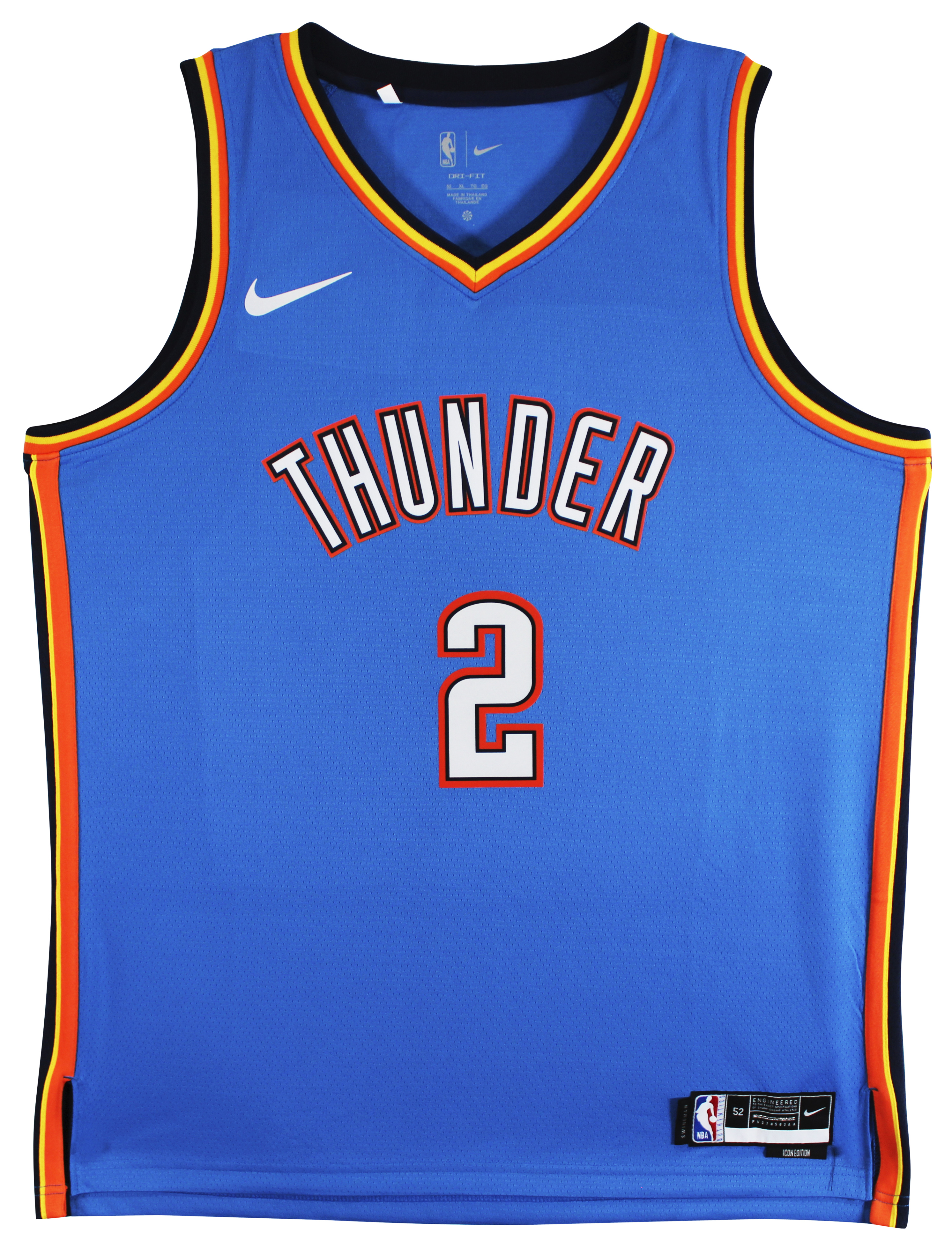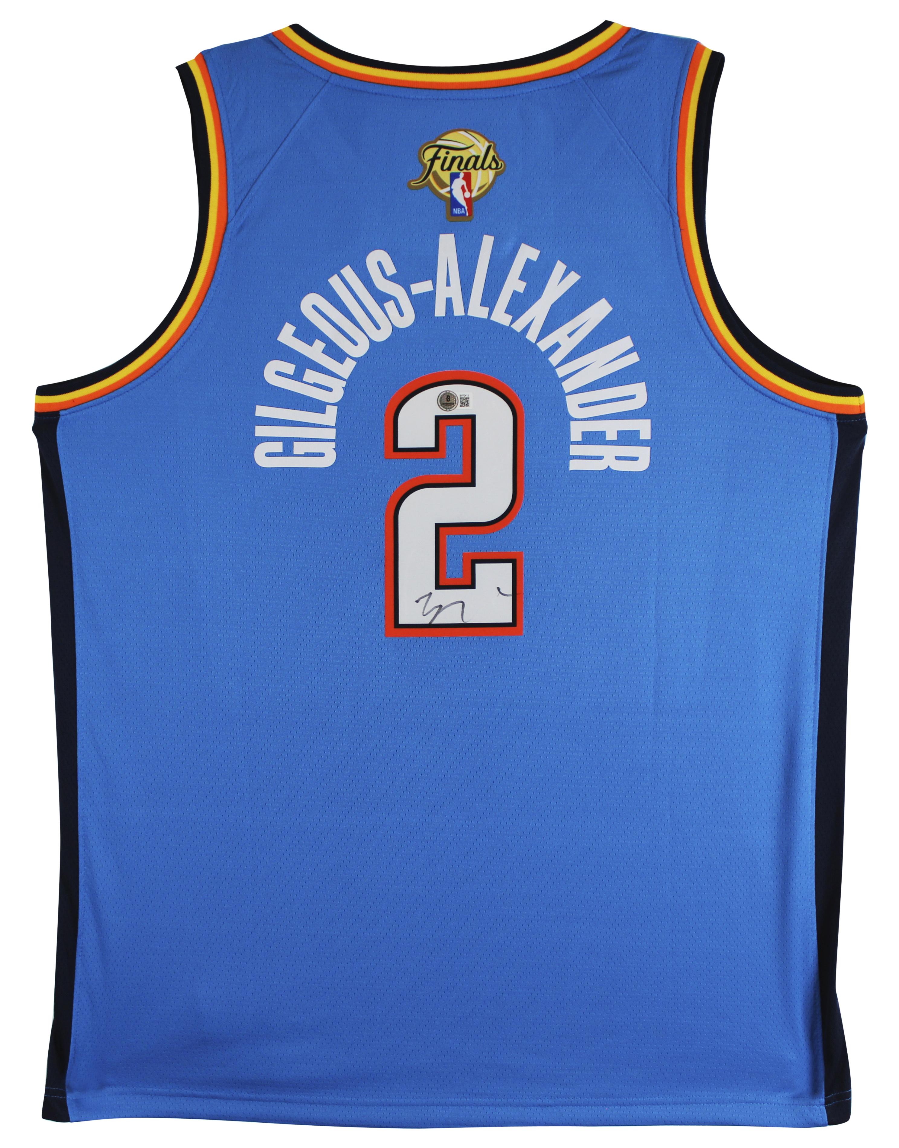 This Autographed Blue Nike Icon NBA Finals Edition Swingman Jersey has been Personally Signed by Shai Gilgeous-Alexander of the Oklahoma City Thunder. This item is 100% Authentic to include a hologram by Beckett Authentication Services. This item will come with an affixed Beckett Authentication Services (BAS) authentication sticker, which includes a scannable QR code to verify authenticity. Please note that Beckett no longer provides serial-numbered COA cards, and the attached BAS sticker will serve as the complete authentication for this item. The authenticity can be verified on Beckett Authentication Services website. This is a X-Large sized Jersey.
