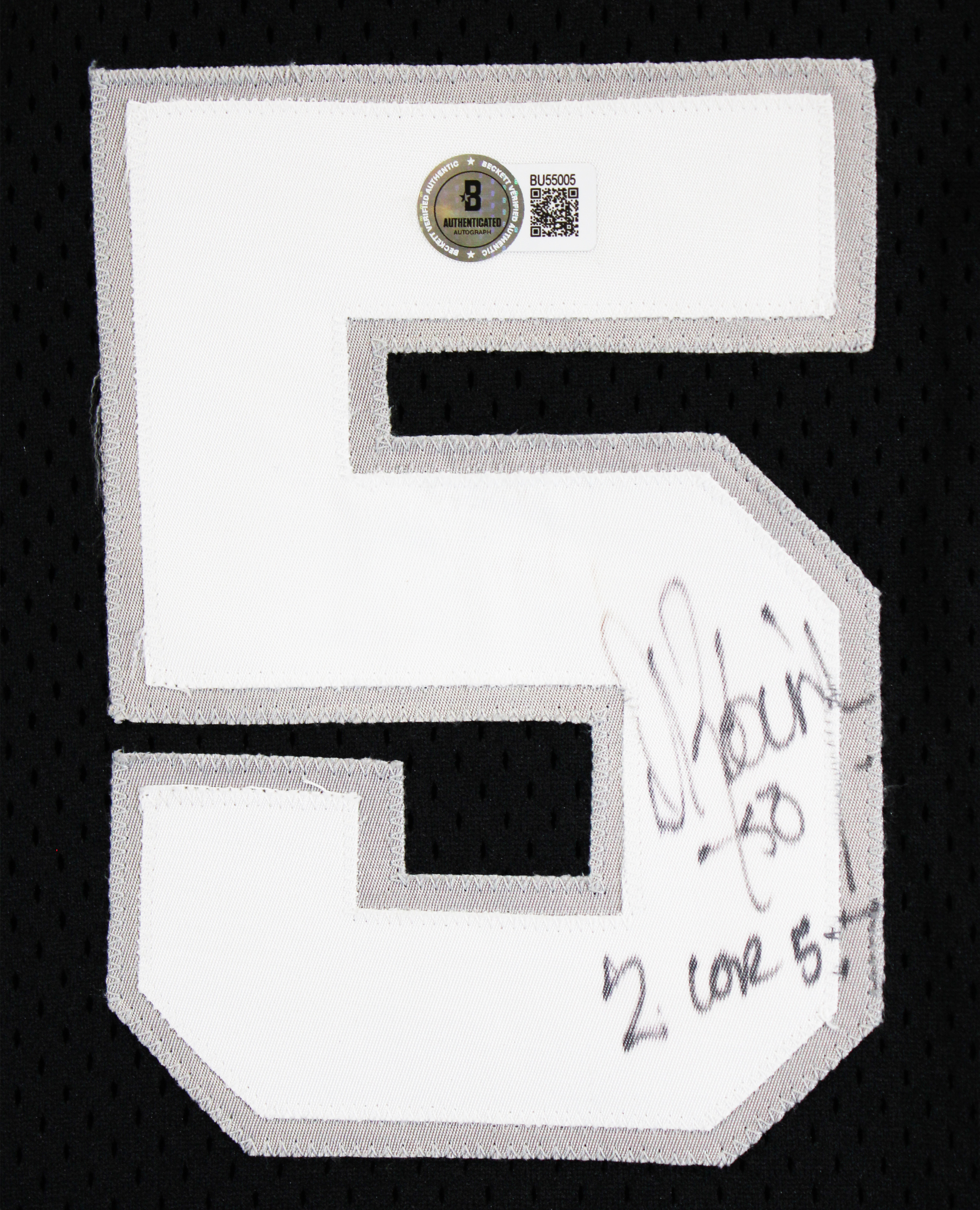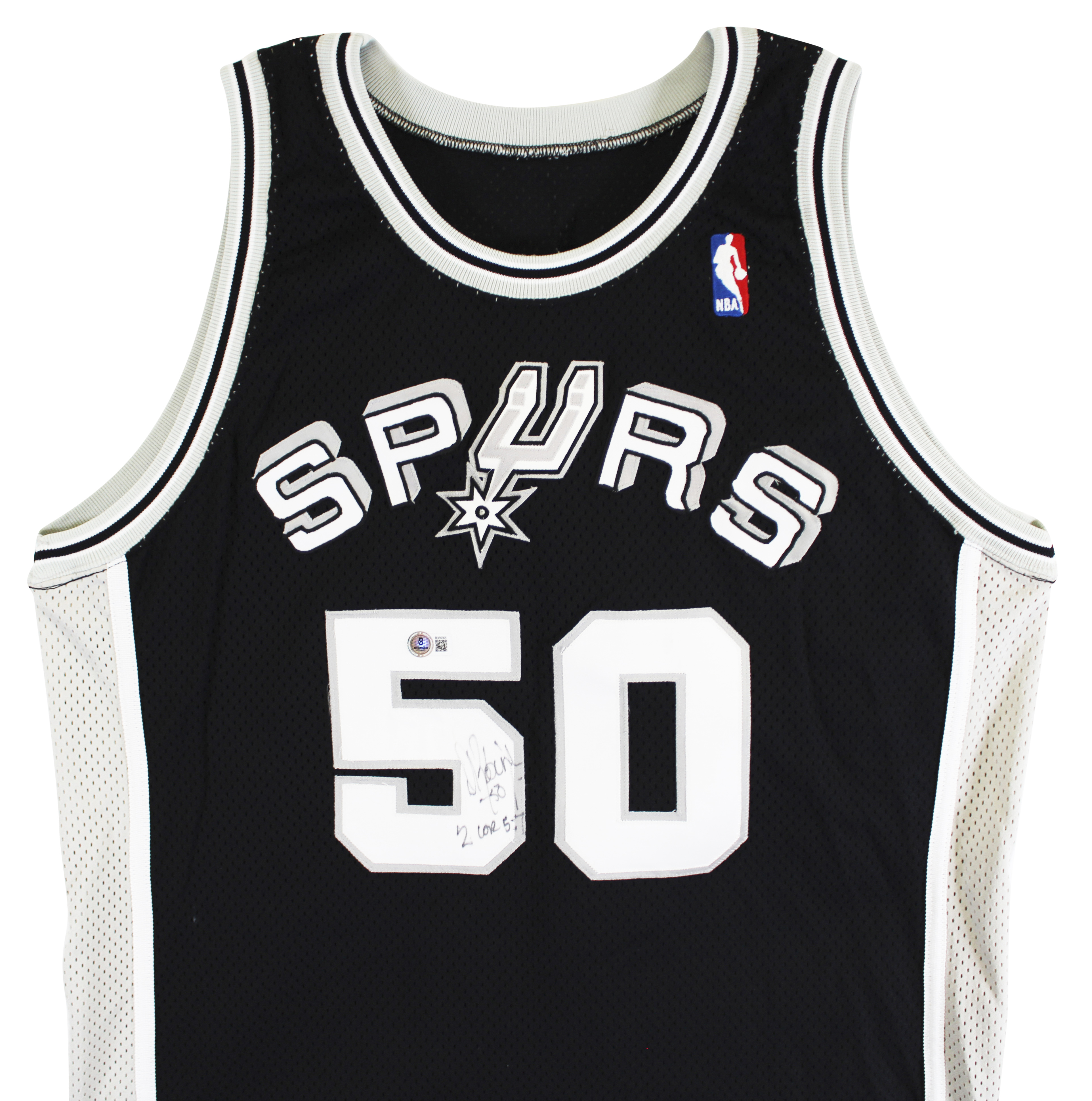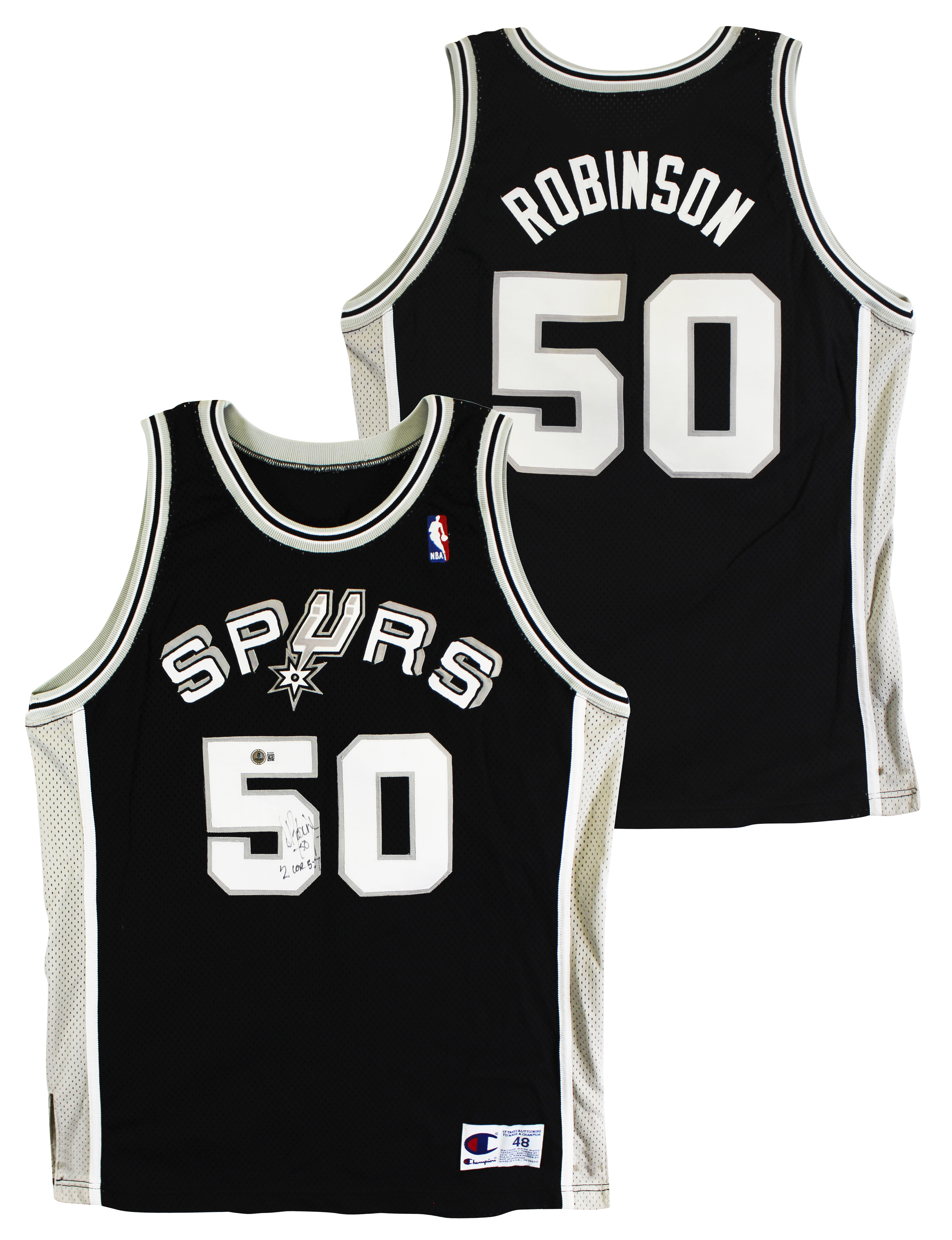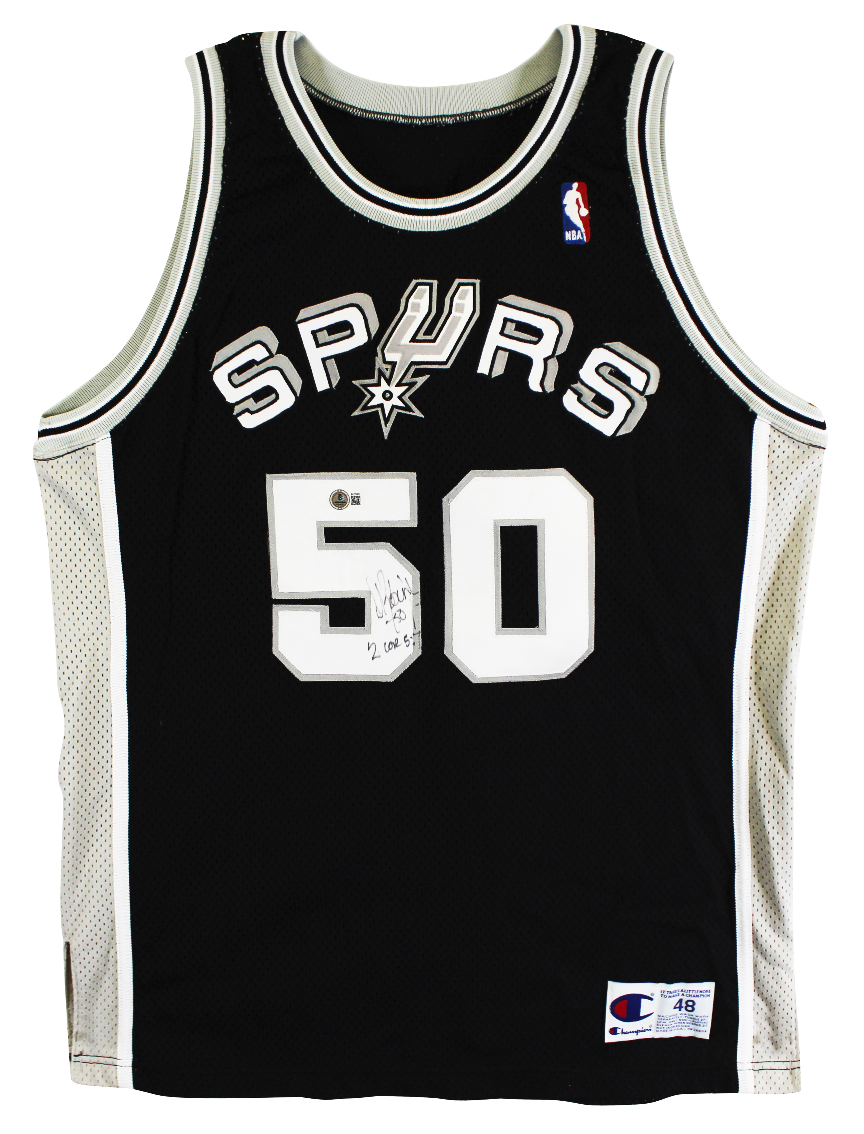 This Autographed Black Champion Size 48 Jersey with the inscription of "2 Cor 5:7" has been Personally Signed by David Robinson of the San Antonio Spurs. This item is 100% Authentic to include a hologram by Beckett Authentication Services. This item will come with an affixed Beckett Authentication Services (BAS) authentication sticker, which includes a scannable QR code to verify authenticity. Please note that Beckett no longer provides serial-numbered COA cards, and the attached BAS sticker will serve as the complete authentication for this item. The authenticity can be verified on Beckett Authentication Services website.