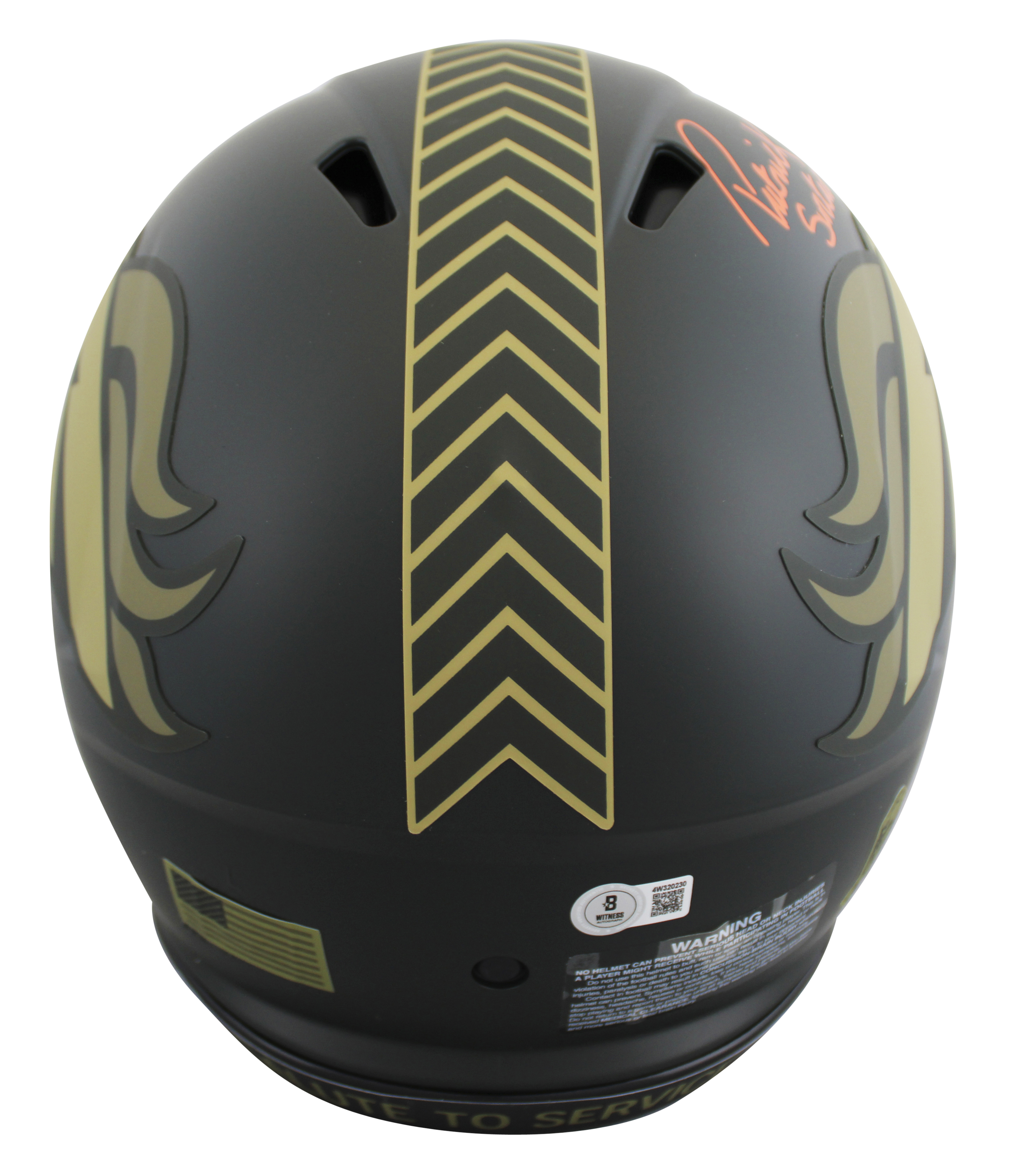 This Autographed Alternate 2025 Salute to Service IV Riddell Authentic Full Size Speed Proline Helmet with the inscription of "24 DPOY" has been Personally Signed by Patrick Surtain II of the Denver Broncos. This item is 100% Authentic to include a hologram by Beckett Authentication Services. This item will come with an affixed Beckett Authentication Services (BAS) authentication sticker, which includes a scannable QR code to verify authenticity. Please note that Beckett no longer provides serial-numbered COA cards, and the attached BAS sticker will serve as the complete authentication for this item. This is a BAS Witnessed Protection Program item which means a Beckett Authentication Service representative was present when this item was being signed. We conducted an autograph signing with Patrick Surtain II where multiples of the same item were signed. While the photographs are representative of this item, the size, placement and strength of the signature may vary. Each item is hand signed, therefore, each autograph is unique. This item can be verified through BAS Witnessed.