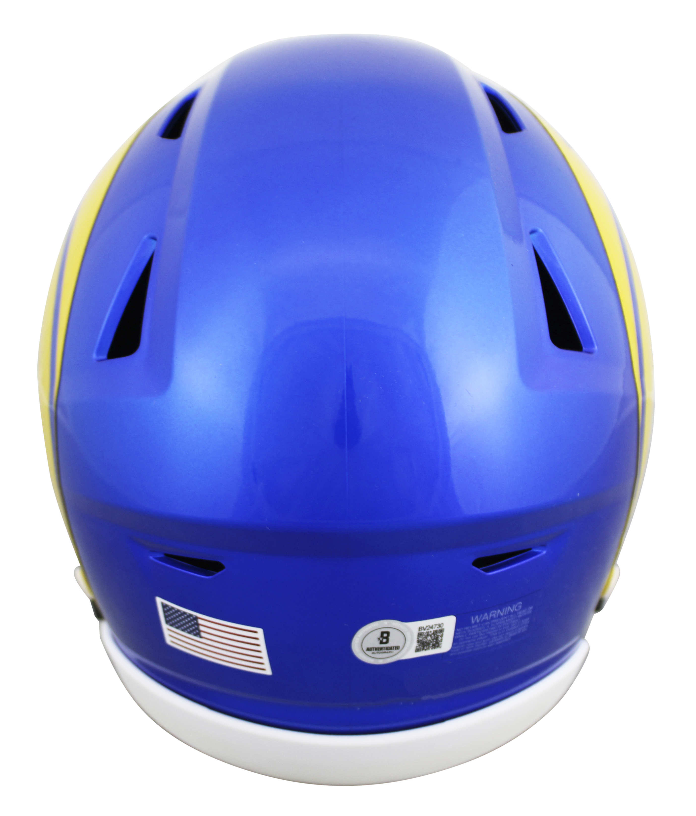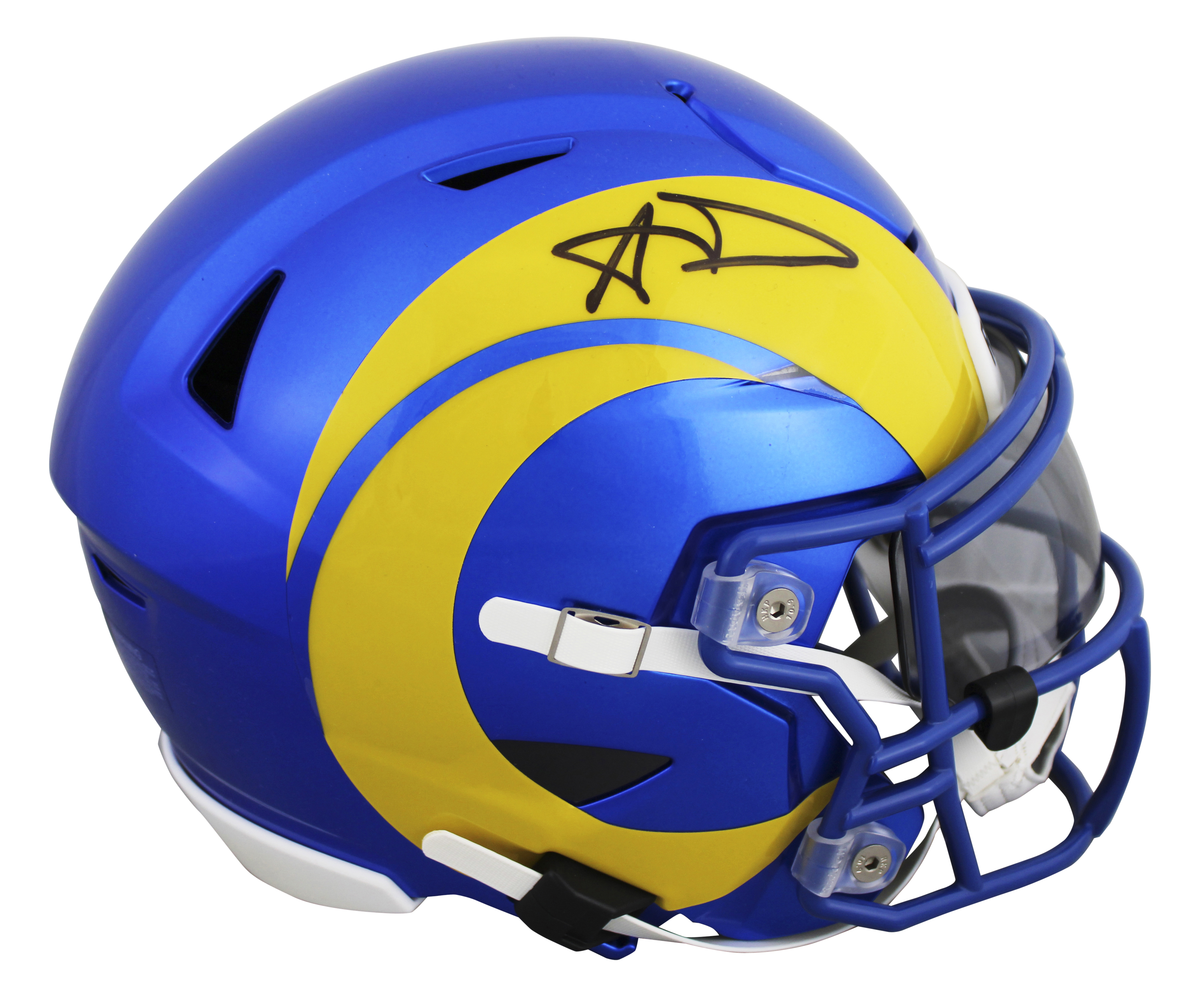 This Autographed Flex Midi Replica Mid Size Helmet has been Personally Signed by Aaron Donald of the Los Angeles Rams. This item is 100% Authentic to include a hologram by Beckett Authentication Services. This item will come with an affixed Beckett Authentication Services (BAS) authentication sticker, which includes a scannable QR code to verify authenticity. Please note that Beckett no longer provides serial-numbered COA cards, and the attached BAS sticker will serve as the complete authentication for this item. We conducted an autograph signing with Aaron Donald where multiples of the same item were signed. While the photographs are representative of this item, the size, placement and strength of the signature may vary. Each item is hand signed, therefore, each autograph is unique. This item can be verified through BAS.