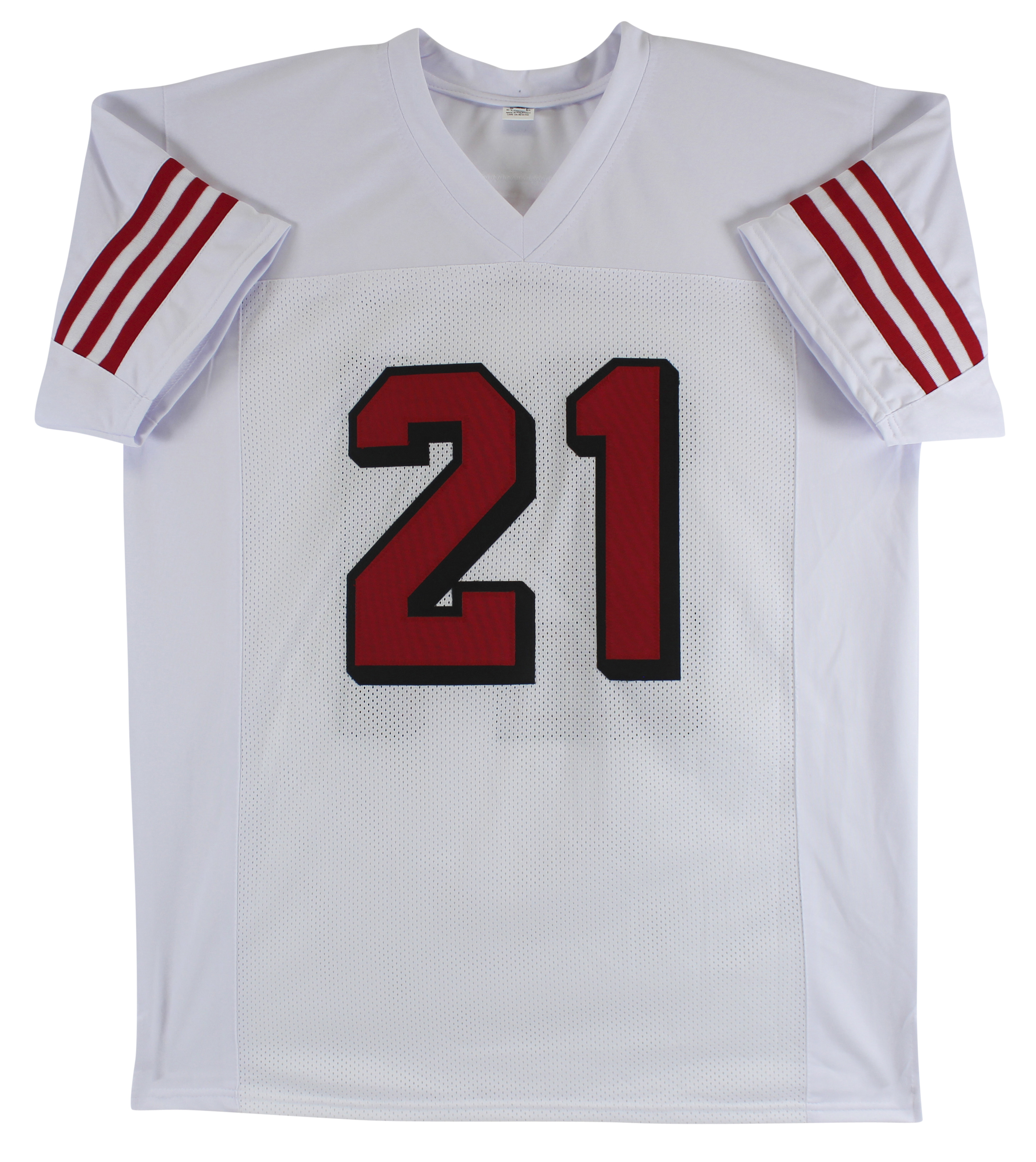 This Autographed w/ Dropshadow White Pro Style Jersey has been Personally Signed by Frank Gore of the San Francisco 49ers. This item is 100% Authentic to include a Certificate of Authenticity (COA) / hologram by Beckett Authentication Services. This is a BAS Witnessed Protection Program item which means a Beckett Authentication Service representative was present when this item was being signed. We conducted an autograph signing with Frank Gore where multiples of the same item were signed. While the photographs are representative of this item, the size, placement and strength of the signature may vary. Each item is hand signed, therefore, each autograph is unique. This item can be verified through BAS Witnessed. This is a X-Large sized, non-branded, custom-stitched Jersey.