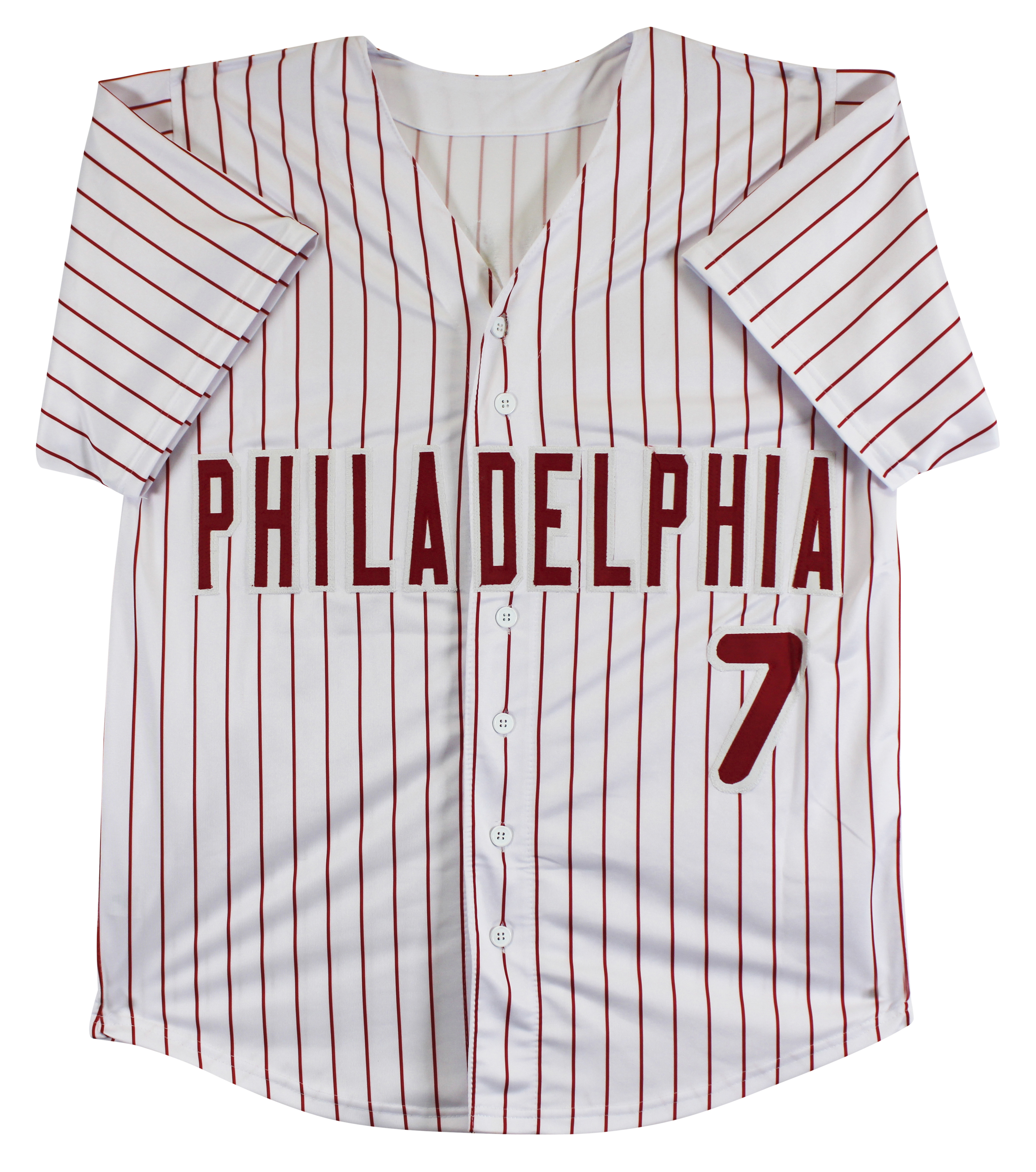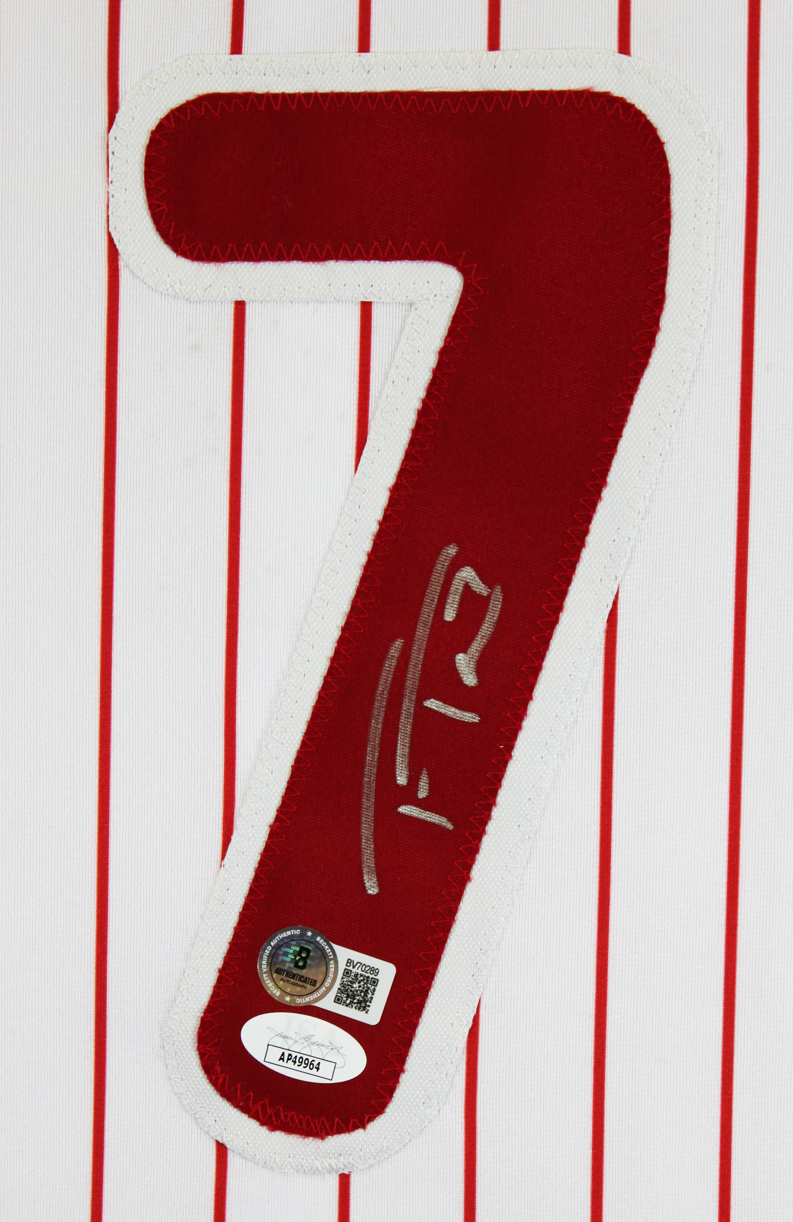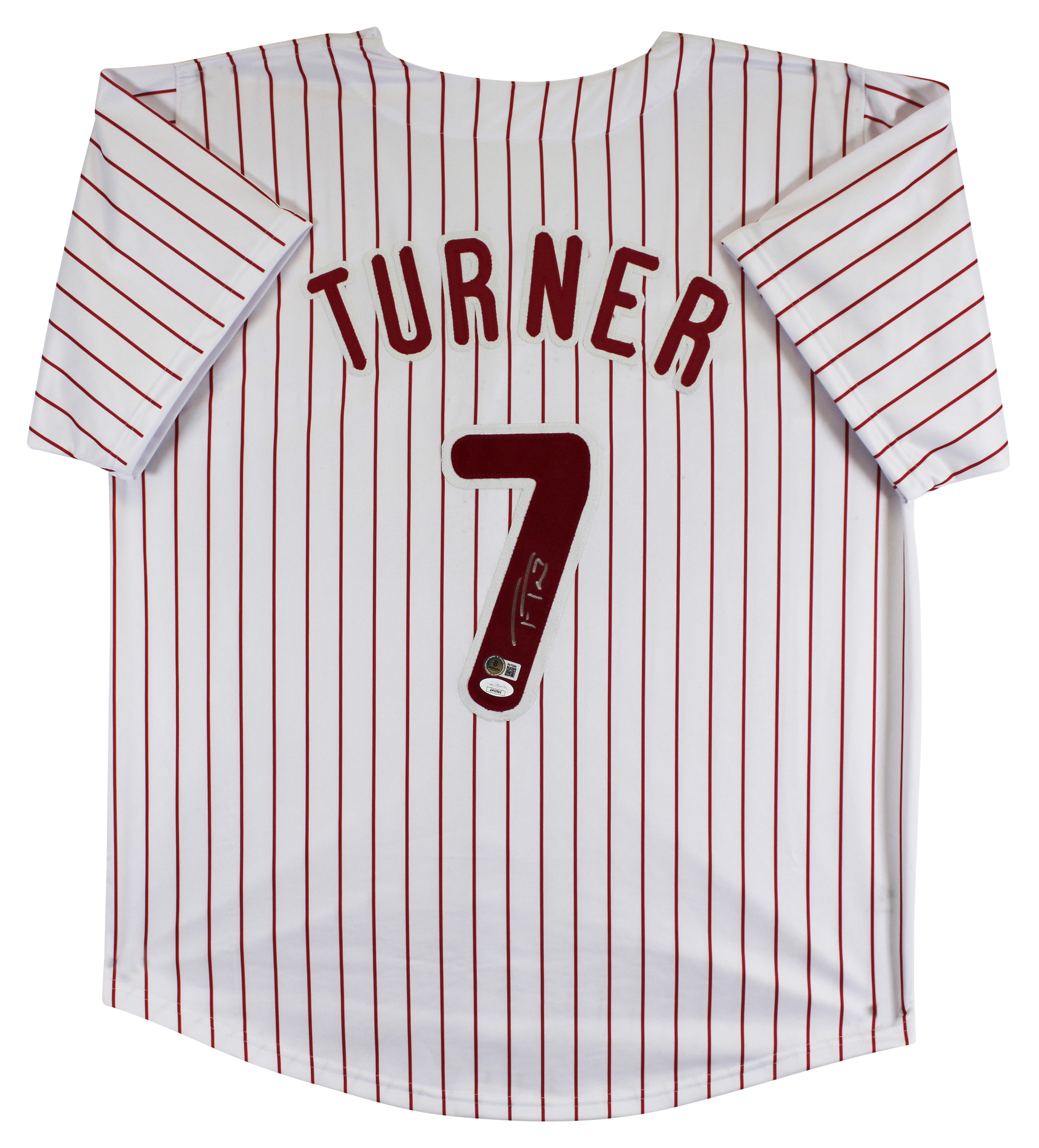 This Autographed White Pinstripe Pro Style Jersey has been Personally Signed by Trea Turner of the Philladelphia Phillies. This item is 100% Authentic to include a hologram by Beckett Authentication Services. This item will come with an affixed Beckett Authentication Services (BAS) authentication sticker, which includes a scannable QR code to verify authenticity. Please note that Beckett no longer provides serial-numbered COA cards, and the attached BAS sticker will serve as the complete authentication for this item. The authenticity can be verified on Beckett Authentication Services website. This is a X-Large sized, non-branded, custom-stitched Jersey. This jersey was also previously authenticated by JSA, however, it will not come with its matching COA card. Its authenticity can still be verified in JSA's database.