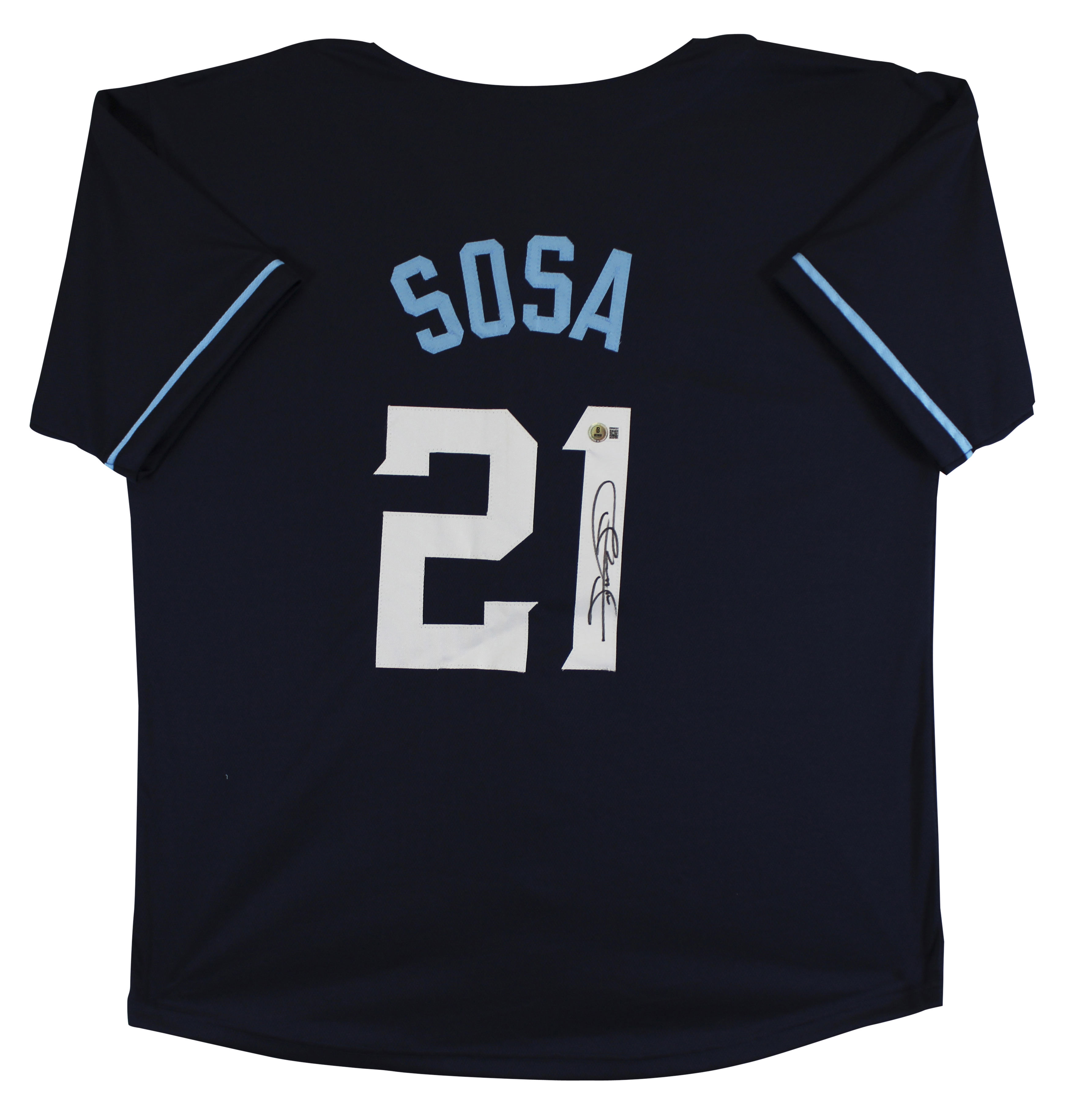 This Autographed Navy Pro Style Jersey has been Personally Signed by Sammy Sosa of the Chicago Cubs. This item is 100% Authentic to include a hologram by Beckett Authentication Services. This item will come with an affixed Beckett Authentication Services (BAS) authentication sticker, which includes a scannable QR code to verify authenticity. Please note that Beckett no longer provides serial-numbered COA cards, and the attached BAS sticker will serve as the complete authentication for this item. This is a BAS Witnessed Protection Program item which means a Beckett Authentication Service representative was present when this item was being signed. We have multiples of this same item. While the photographs are representative of this item, the size, placement and strength of the signature may vary. Each item is hand signed, therefore, each autograph is unique. This is a X-Large sized, non-branded, custom-stitched Jersey.