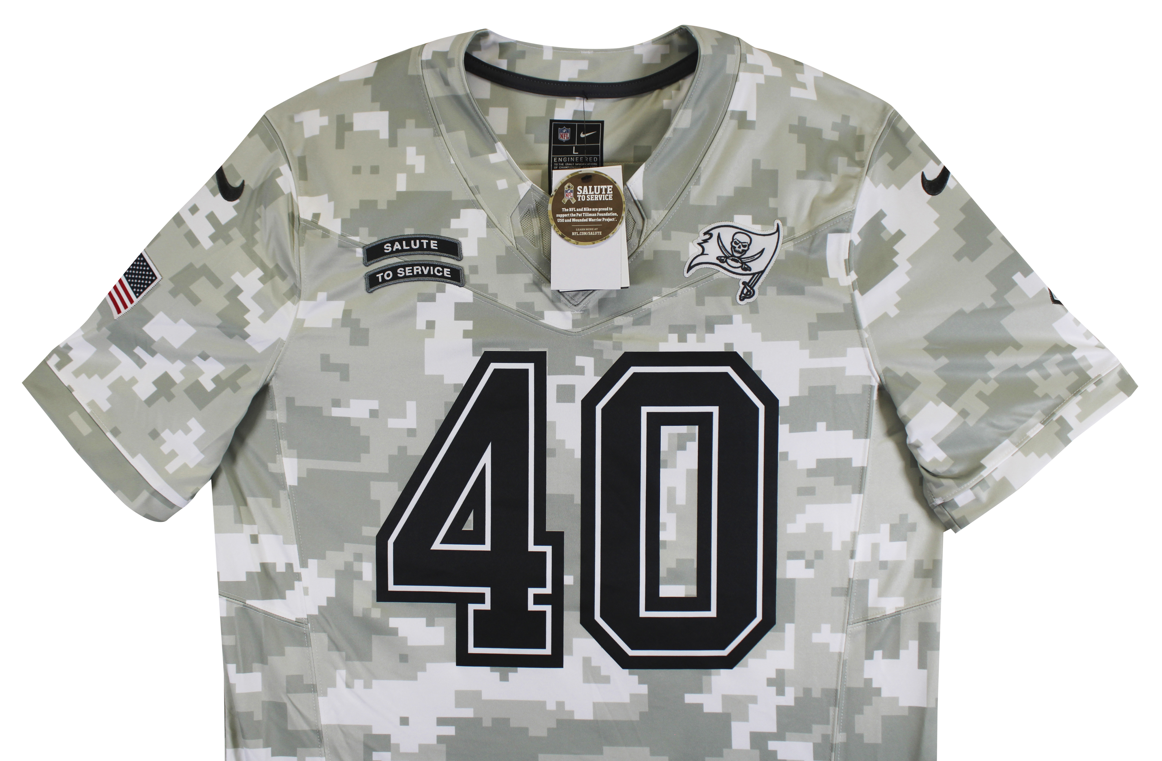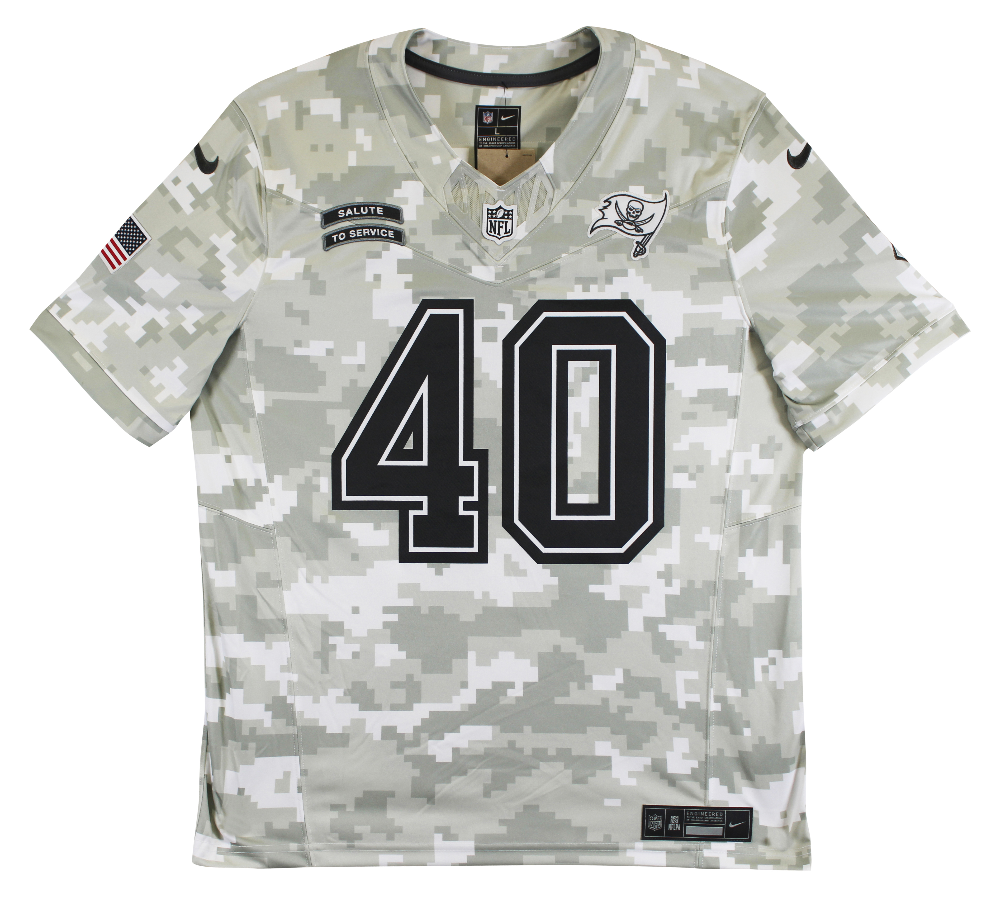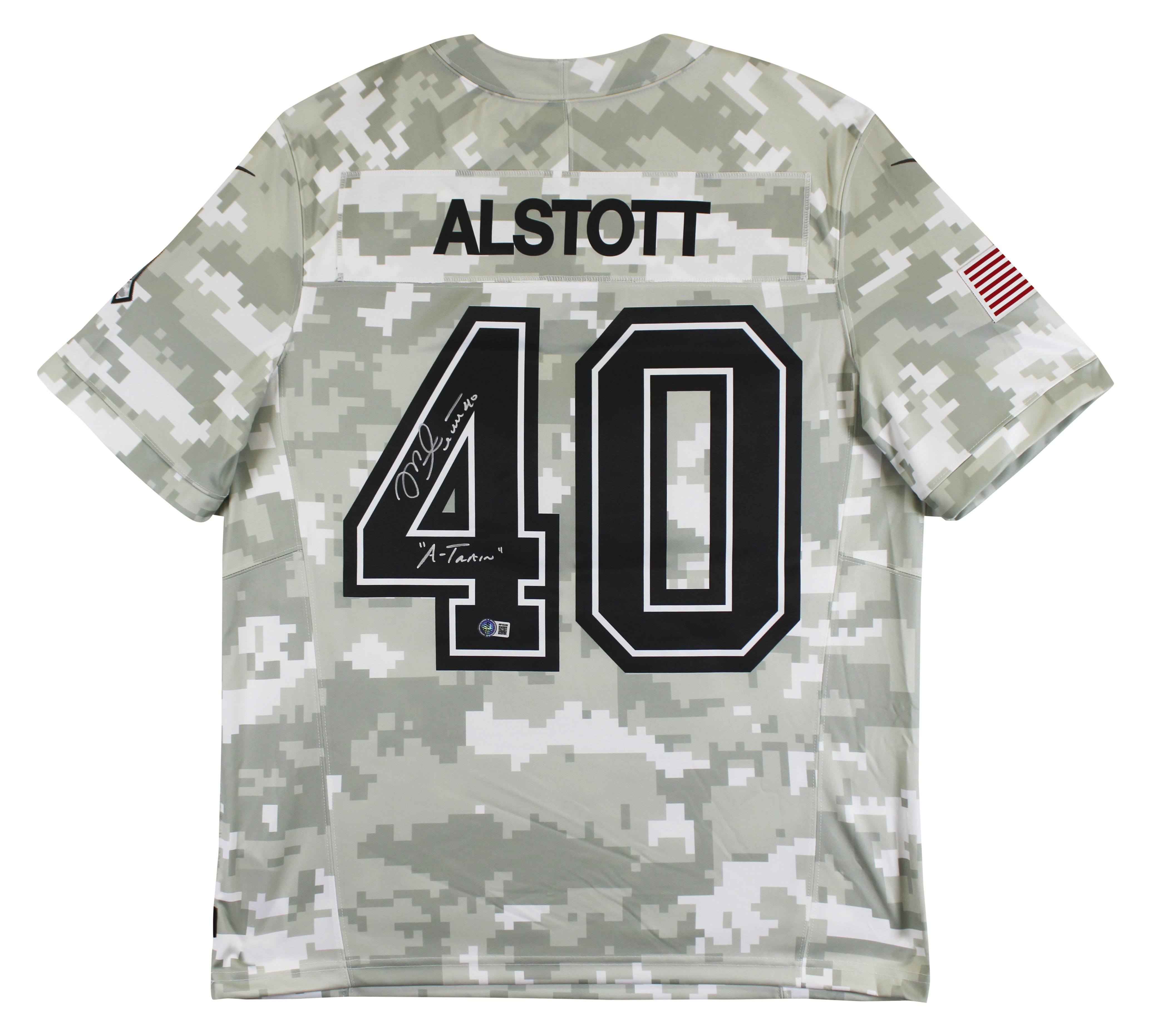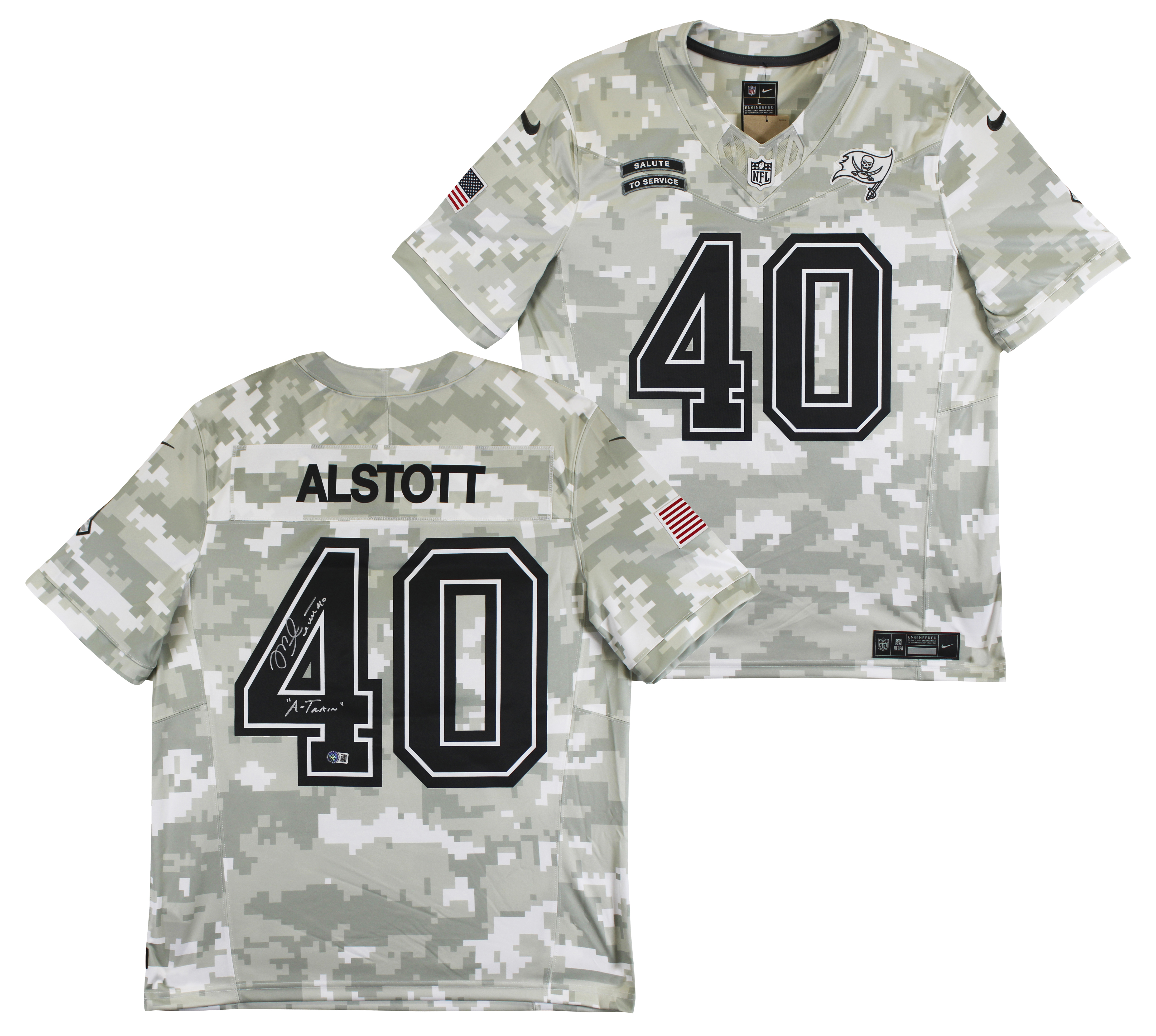 This Autographed 2024 Salute to Service Nike Limited Jersey with the inscription of "A-Train" has been Personally Signed by Mike Alstott of the Tampa Bay Buccaneers. This item is 100% Authentic to include a hologram by Beckett Authentication Services. This item will come with an affixed Beckett Authentication Services (BAS) authentication sticker, which includes a scannable QR code to verify authenticity. Please note that Beckett no longer provides serial-numbered COA cards, and the attached BAS sticker will serve as the complete authentication for this item. This is a BAS Witnessed Protection Program item which means a Beckett Authentication Service representative was present when this item was being signed. We conducted an autograph signing with Mike Alstott where multiples of the same item were signed. While the photographs are representative of this item, the size, placement and strength of the signature may vary. Each item is hand signed, therefore, each autograph is unique. This item can be verified through BAS Witnessed. This is a X-Large sized Jersey.