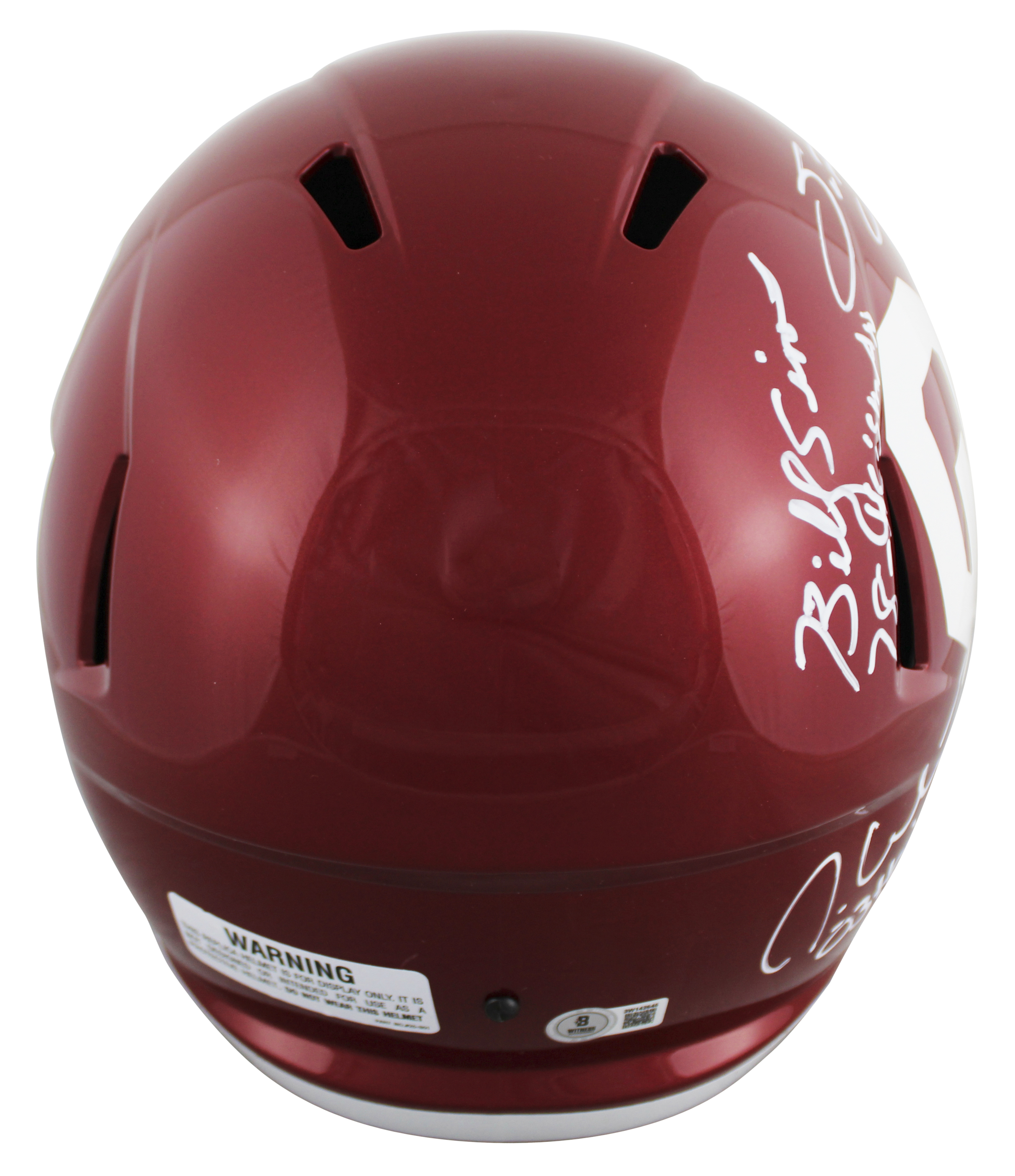 This Autographed Riddell Full Size Speed Rep Helmet with the inscription of "Heisman 1978 (Sims), Heisman 2003 (White), Heisman 1969 (Owens), Heisman 2008 (Bradford)" has been Personally Signed by Billy Sims, Jason White, Steve Owens & Sam Bradford of the Oklahoma Sooners. This item is 100% Authentic to include a hologram by Beckett Authentication Services. This item will come with an affixed Beckett Authentication Services (BAS) authentication sticker, which includes a scannable QR code to verify authenticity. Please note that Beckett no longer provides serial-numbered COA cards, and the attached BAS sticker will serve as the complete authentication for this item. This is a BAS Witnessed Protection Program item which means a Beckett Authentication Service representative was present when this item was being signed. We conducted an autograph signing with Billy Sims, Jason White, Steve Owens & Sam Bradford where multiples of the same item were signed. While the photographs are representative of this item, the size, placement and strength of the signature may vary. Each item is hand signed, therefore, each autograph is unique. This item can be verified through BAS Witnessed.