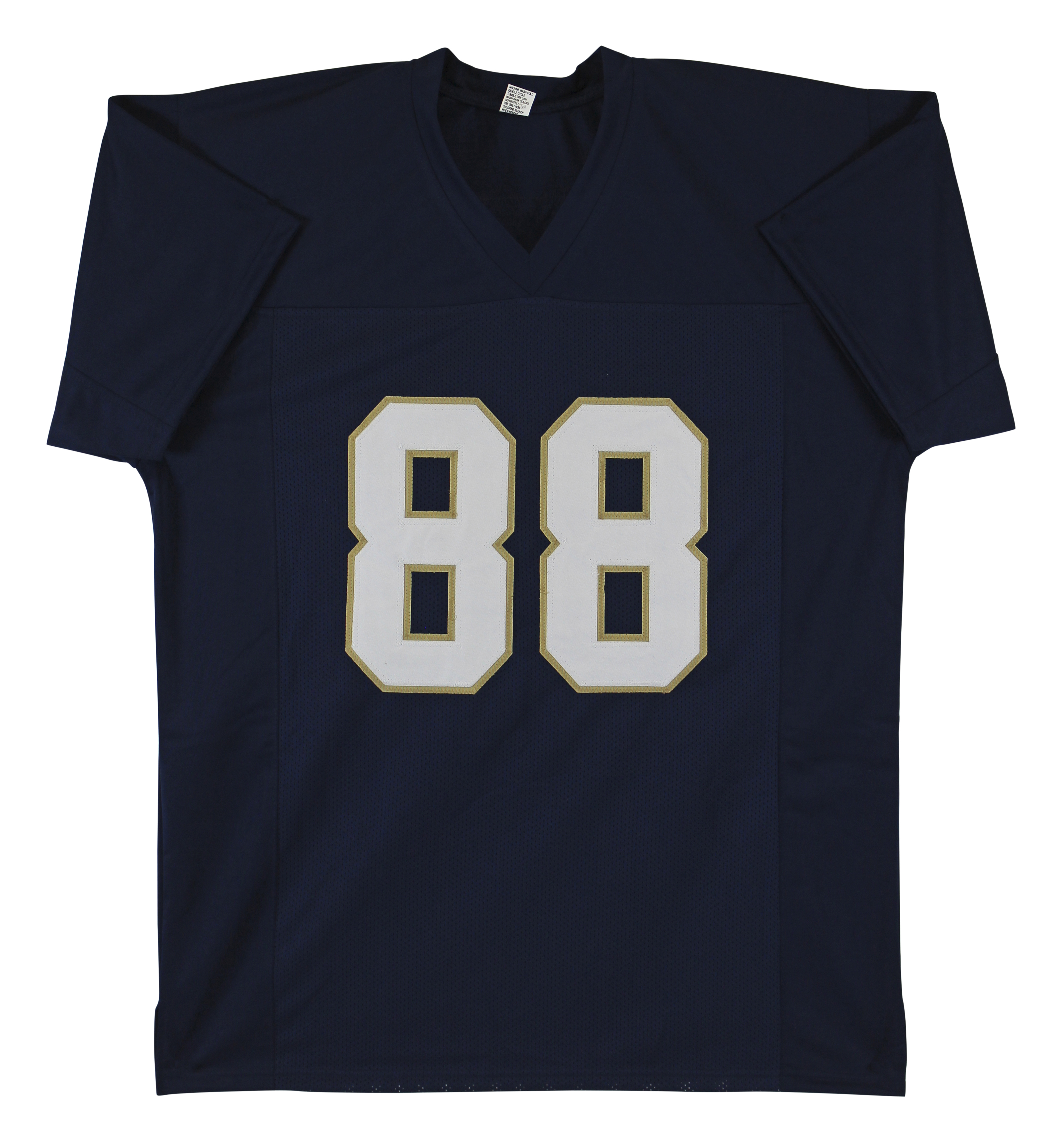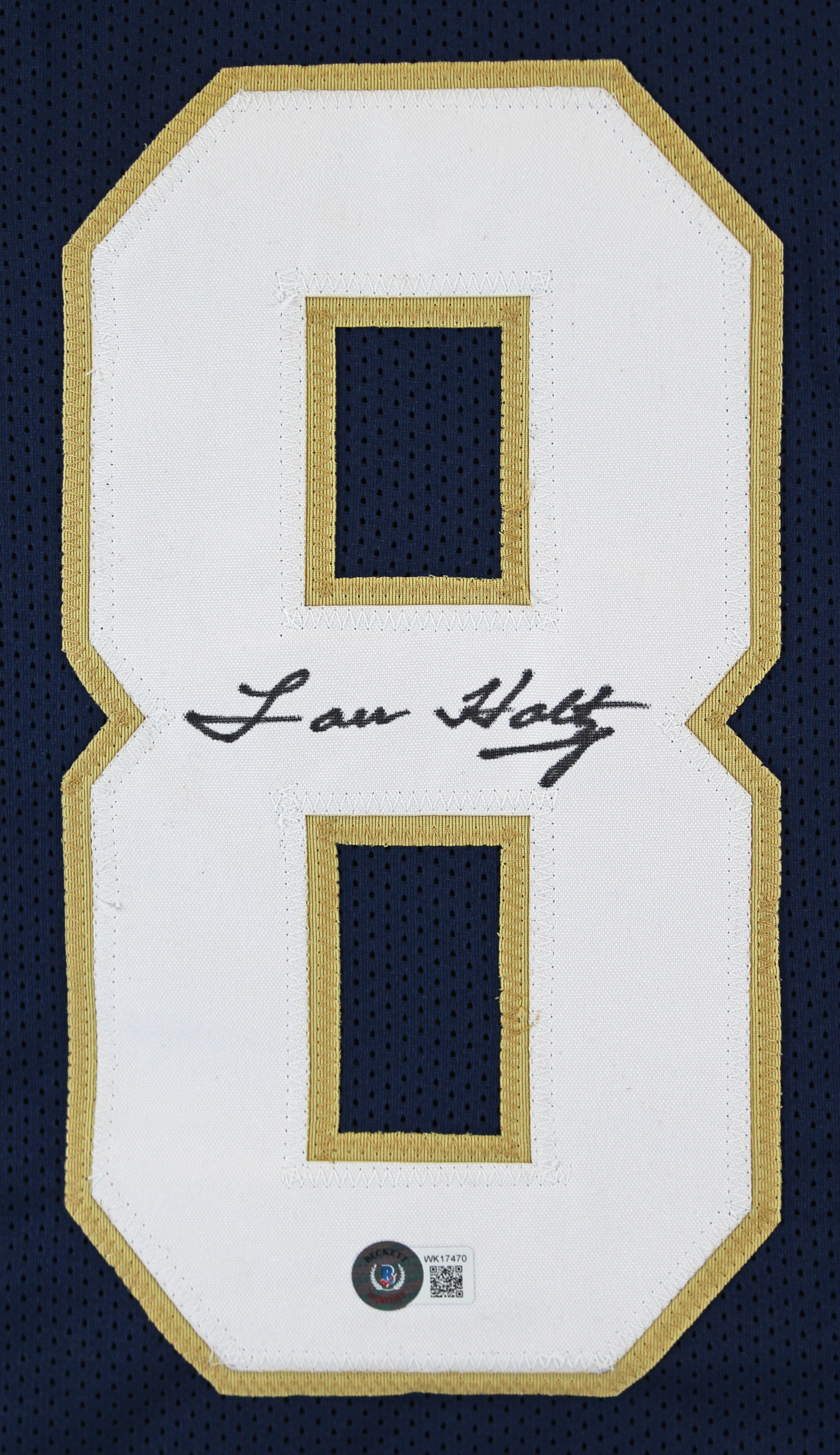 This Autographed Navy Blue Pro Style Jersey has been Personally Signed by Lou Holtz of the Notre Dame Fighting Irish. This item is 100% Authentic to include a hologram by Beckett Authentication Services. This item will come with the new Beckett Authentication hologram that has a scannable QR code rather than the traditional COA. If you would like to have a COA, you are welcome to reach out to Beckett for a printed certification once you receive your item. This is a BAS Witnessed Protection Program item which means a Beckett Authentication Service representative was present when this item was being signed. This is a stock item. We conducted an autograph signing with Lou Holtz and we have several of these available. The one you will receive will be of equal quality to the one pictured. This item can be verified through BAS Witnessed. This is a X-Large sized, non-branded, custom-stitched Jersey.