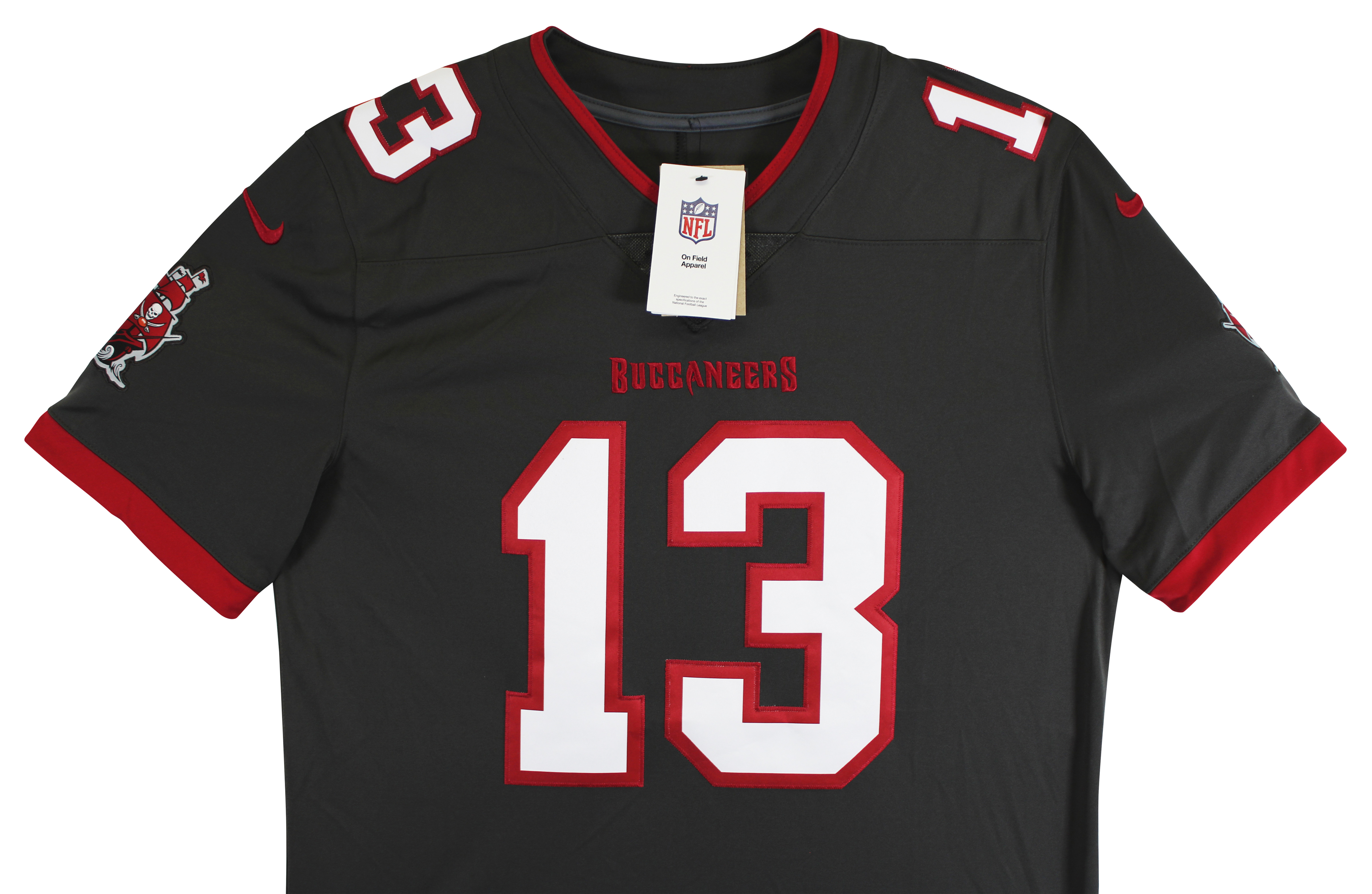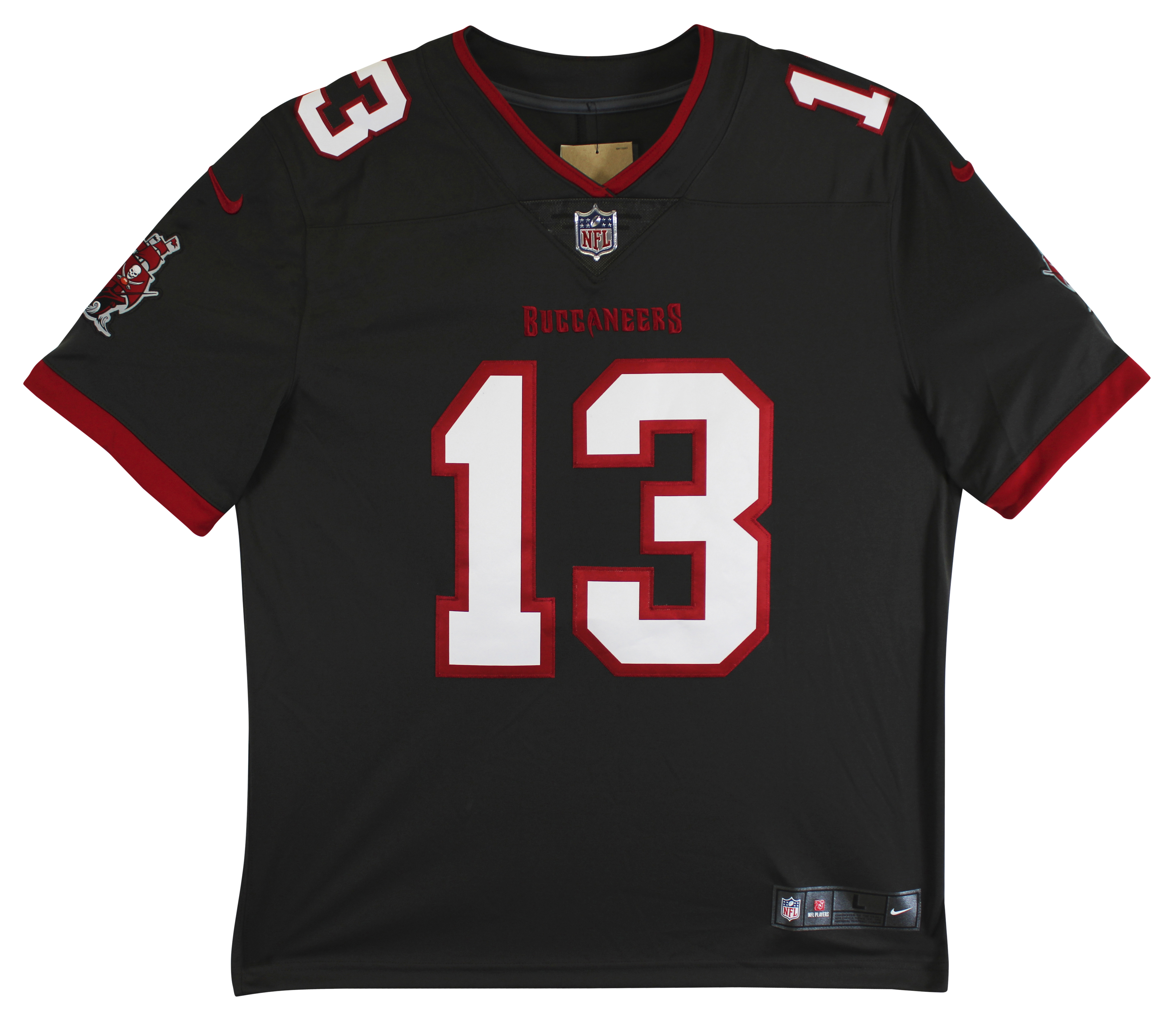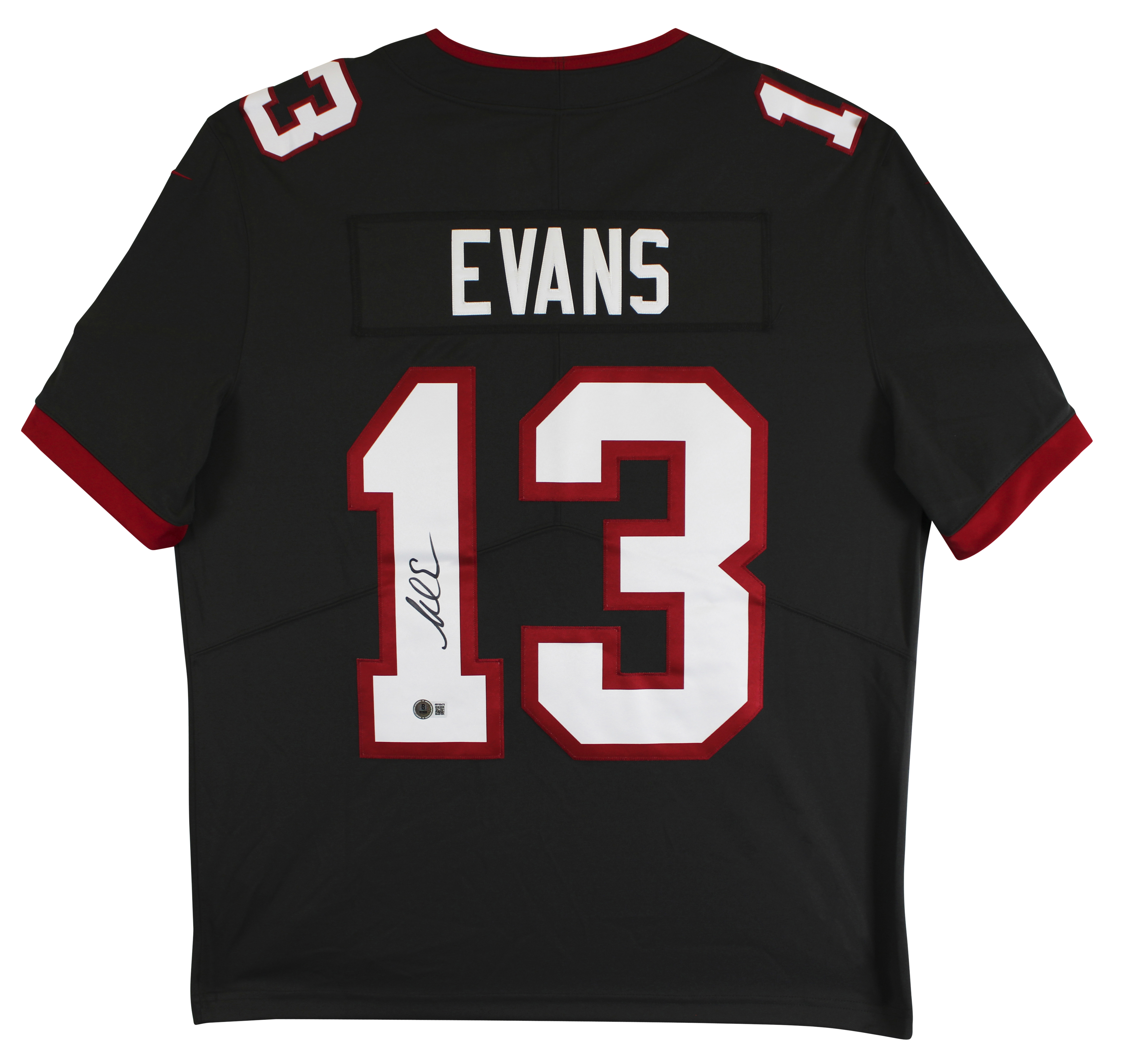 This Autographed Pewter Nike Elite Jersey has been Personally Signed by Mike Evans of the Tampa Bay Buccaneers. This item is 100% Authentic to include a hologram by Beckett Authentication Services. This item will come with an affixed Beckett Authentication Services (BAS) authentication sticker, which includes a scannable QR code to verify authenticity. Please note that Beckett no longer provides serial-numbered COA cards, and the attached BAS sticker will serve as the complete authentication for this item. This is a BAS Witnessed Protection Program item which means a Beckett Authentication Service representative was present when this item was being signed. We conducted an autograph signing with Mike Evans where multiples of the same item were signed. While the photographs are representative of this item, the size, placement and strength of the signature may vary. Each item is hand signed, therefore, each autograph is unique. This item can be verified through BAS Witnessed. This is a Large sized Jersey.