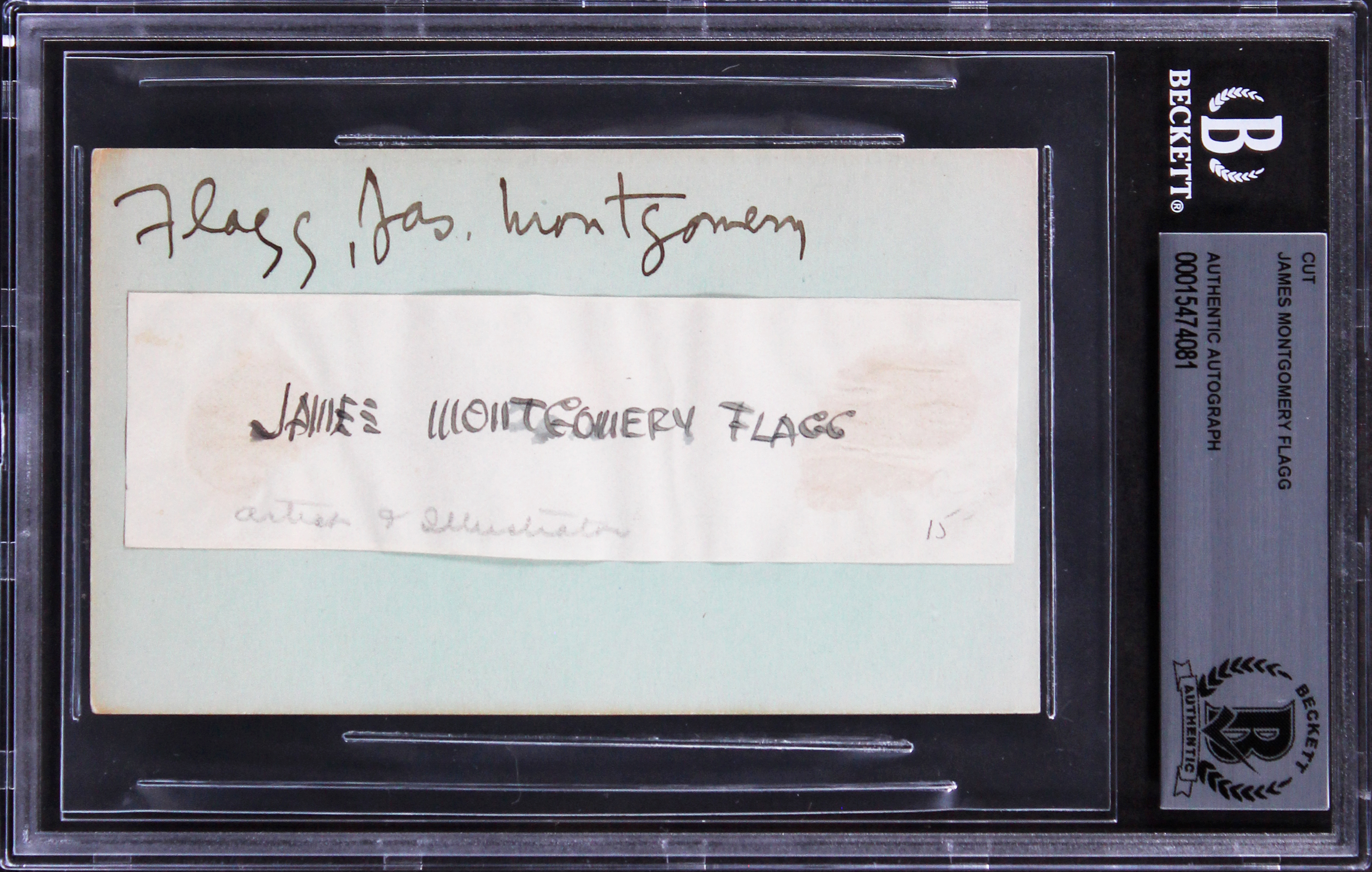 This Autographed 1.35x4.75 Cut Signature has been Personally Signed by James Montgomery Flagg. This item is 100% Authentic, it comes slabbed and authenticated by Beckett Authentication Services. The authenticity can be verified on Beckett Authentication Services website.