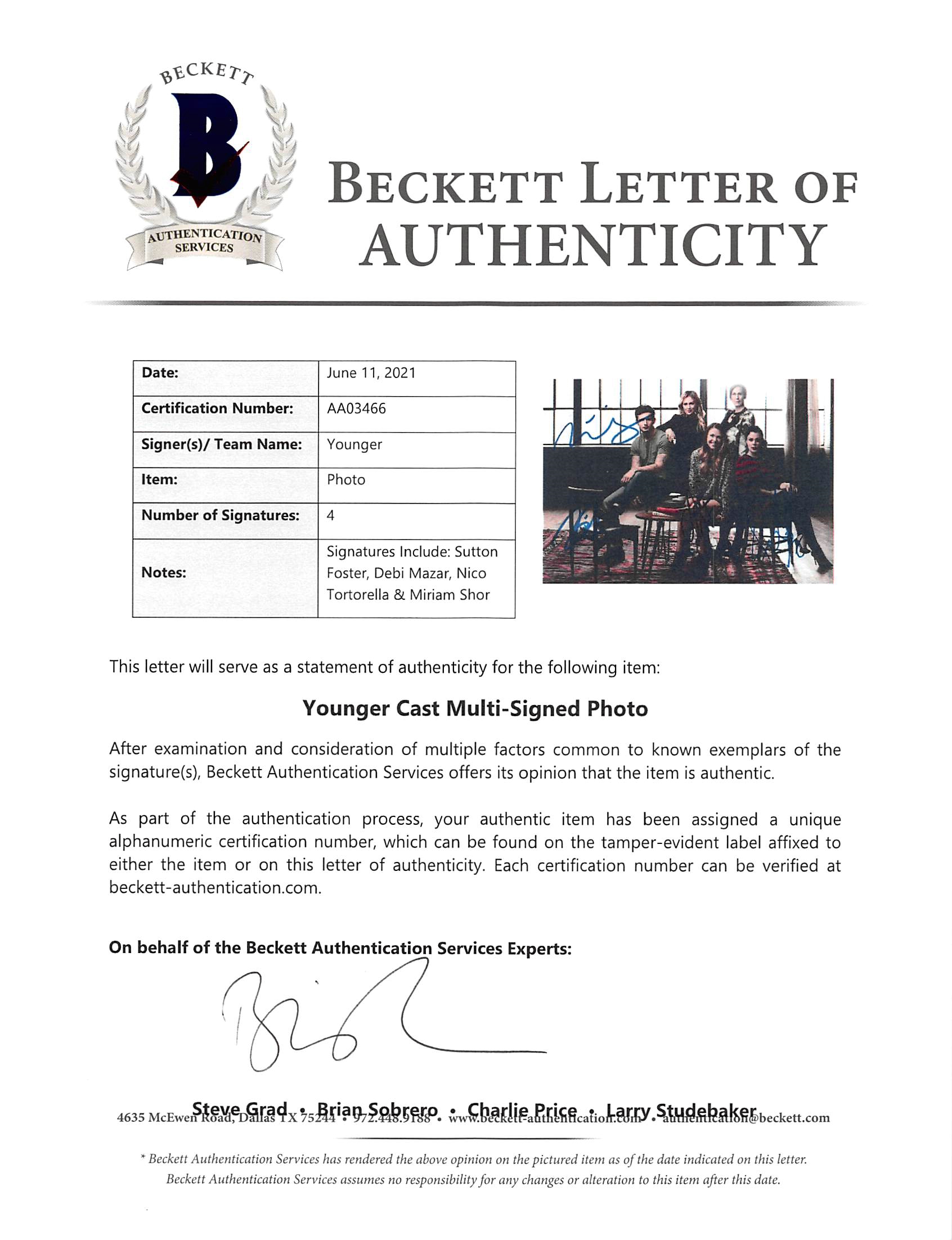 This Autographed 8x10 Photo has been Personally Signed by Sutton Foster, Debi Mazar, Nico Tortorella & Miriam Shor of Younger. This item is 100% Authentic to include a Certificate of Authenticity (COA) / hologram by Beckett Authentication Services. The authenticity can be verified on Beckett Authentication Services website.