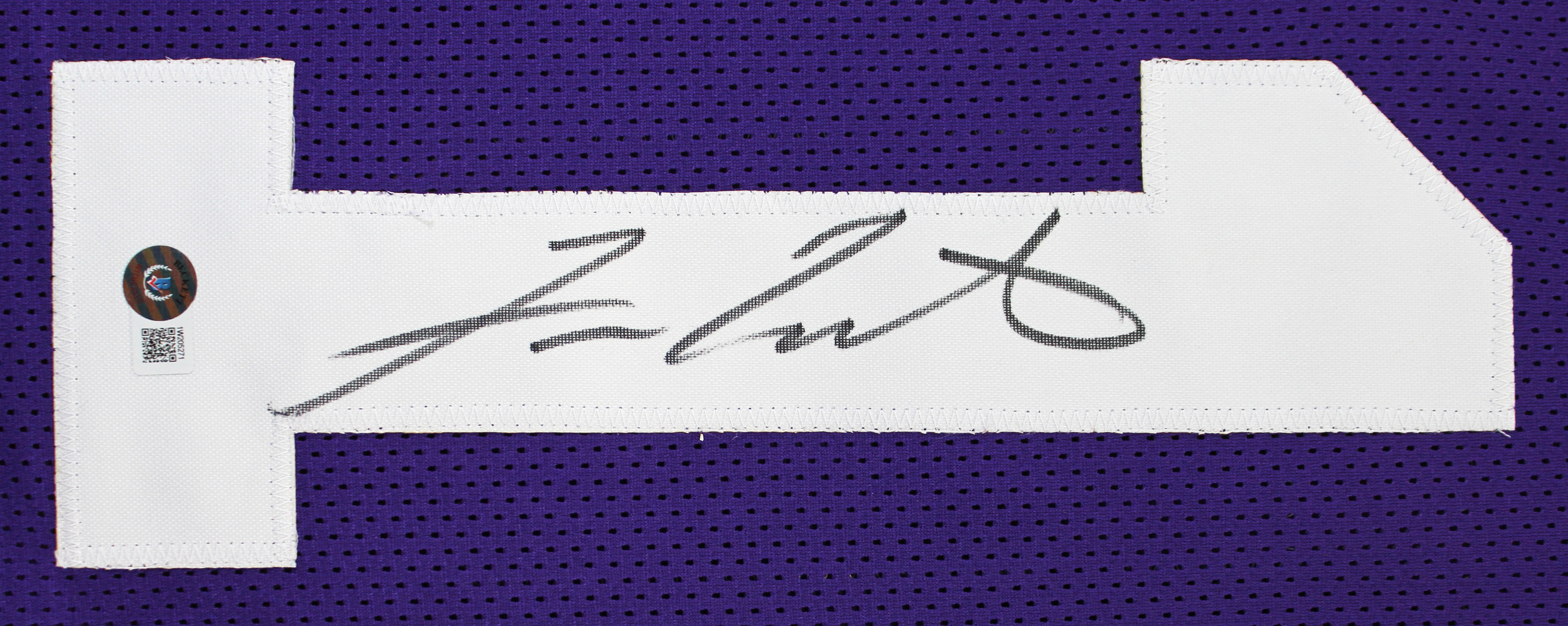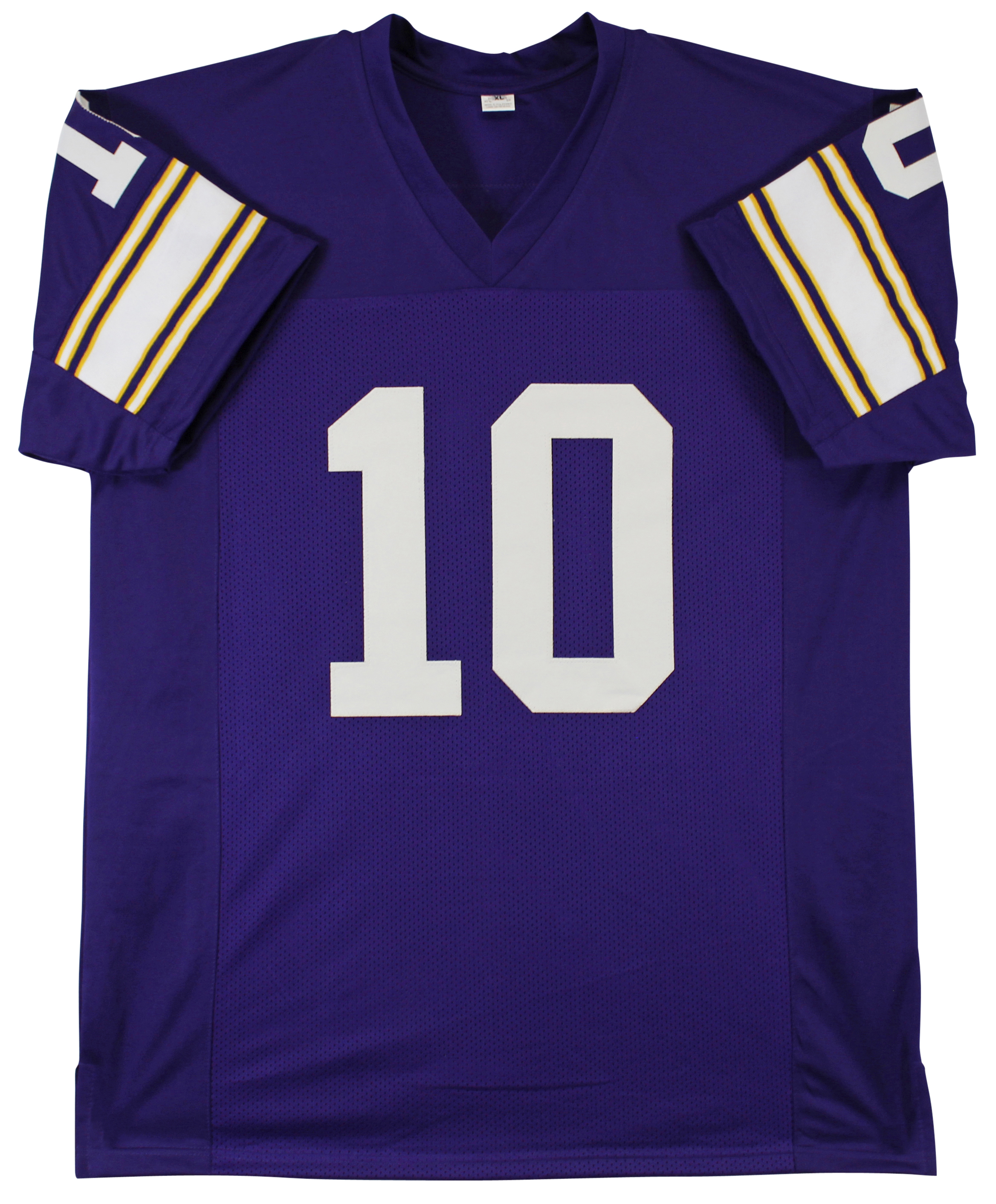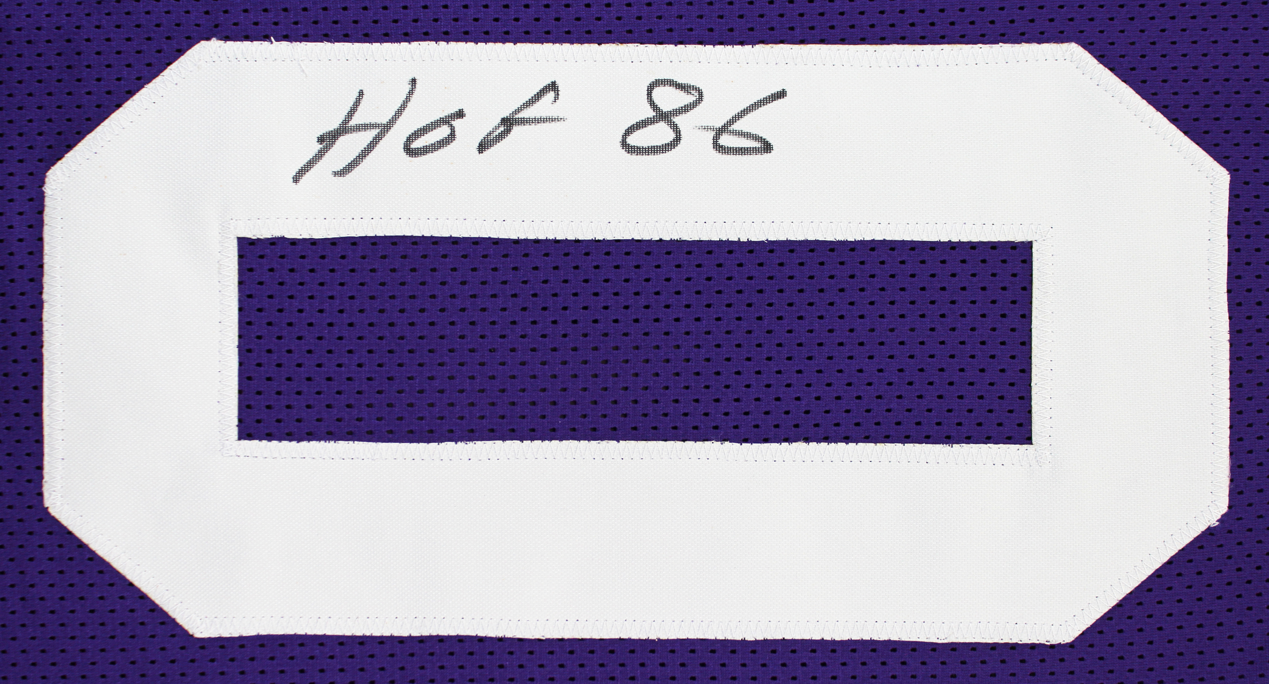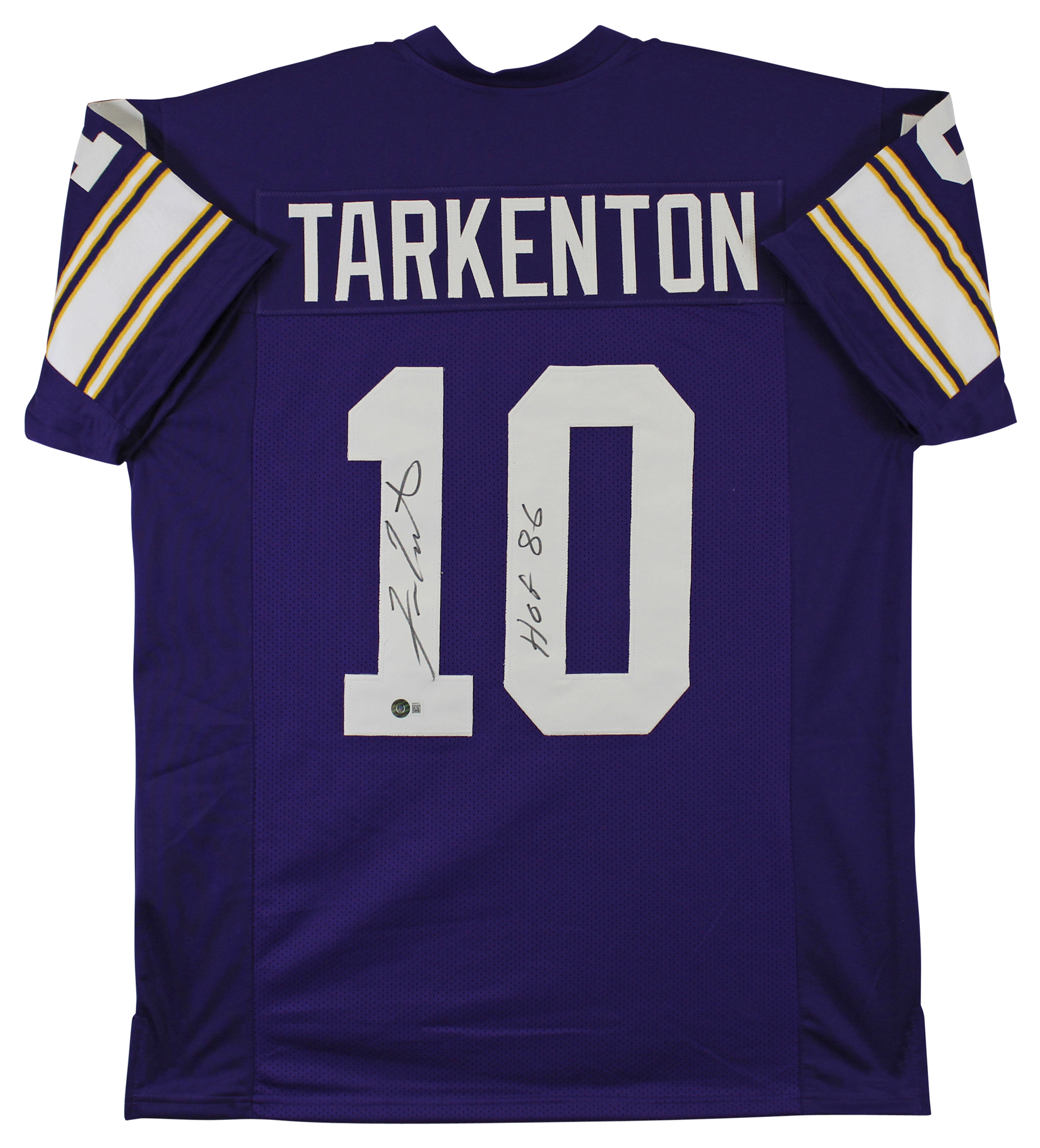This Autographed Purple Pro Style Jersey with the inscription of "HOF 86" has been Personally Signed by Fran Tarkenton of the Minnesota Vikings. This item is 100% Authentic to include a hologram by Beckett Authentication Services. This item will come with an affixed Beckett Authentication Services (BAS) authentication sticker, which includes a scannable QR code to verify authenticity. Please note that Beckett no longer provides serial-numbered COA cards, and the attached BAS sticker will serve as the complete authentication for this item. This is a BAS Witnessed Protection Program item which means a Beckett Authentication Service representative was present when this item was being signed. The authenticity can be verified on Beckett Authentication Services website. This is a X-Large sized, non-branded, custom-stitched Jersey.