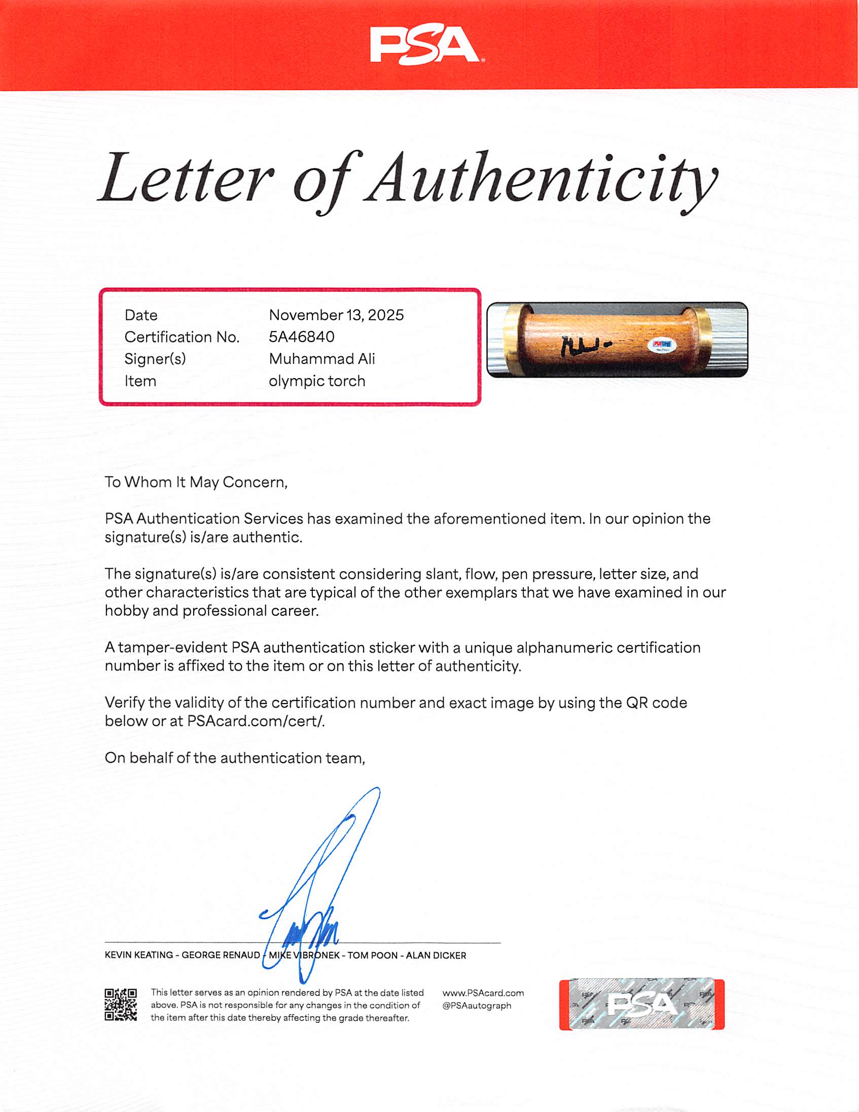 This Autographed 1996 Atlanta Olympics Replica 32 Inch Olympic Torch has been Personally Signed by Muhammad Ali. This item is 100% Authentic and comes with a PSA/DNA Certification Card and a matching numbered Hologram. The authenticity can be verified on Professional Sports Authenticator website.