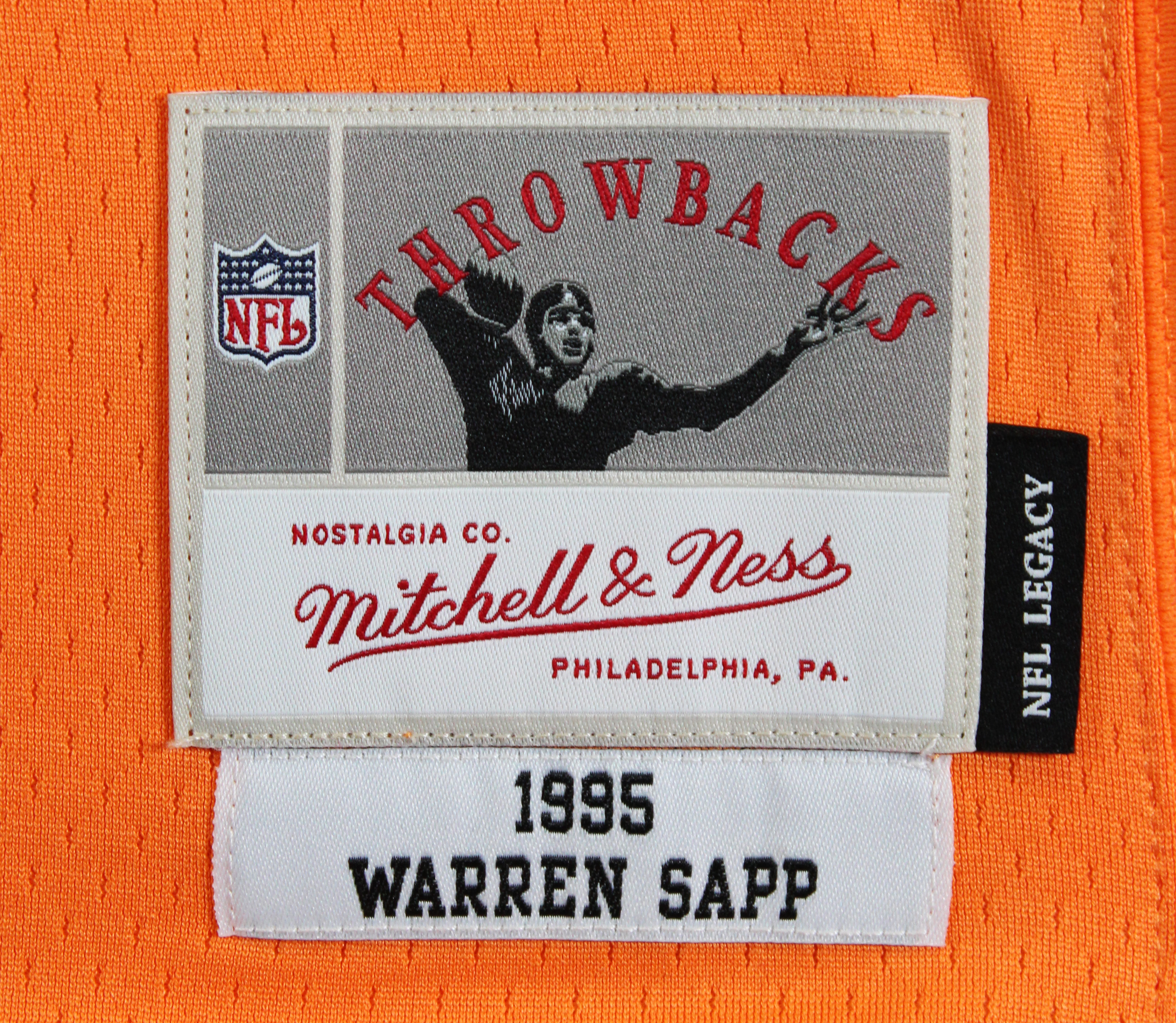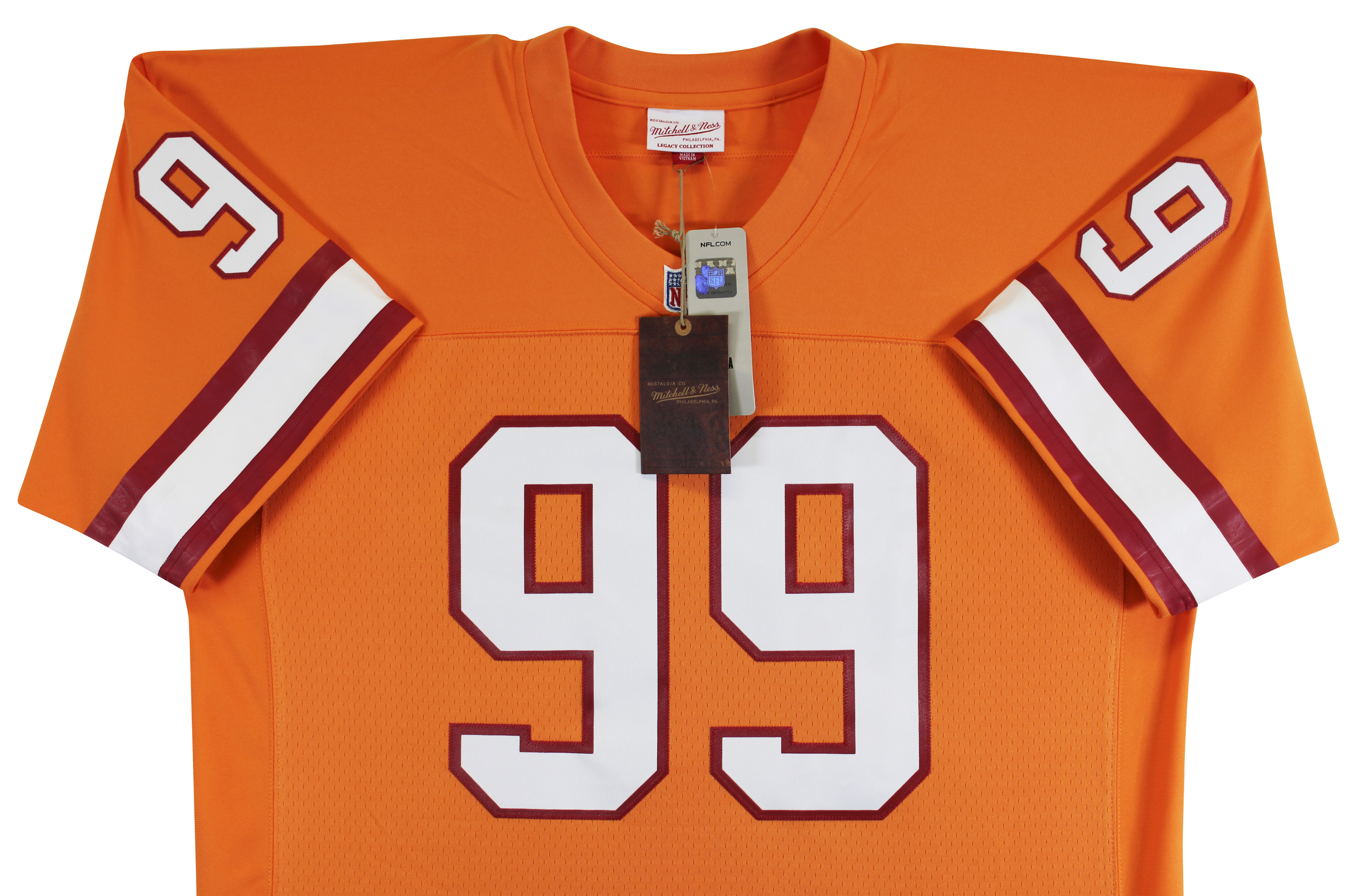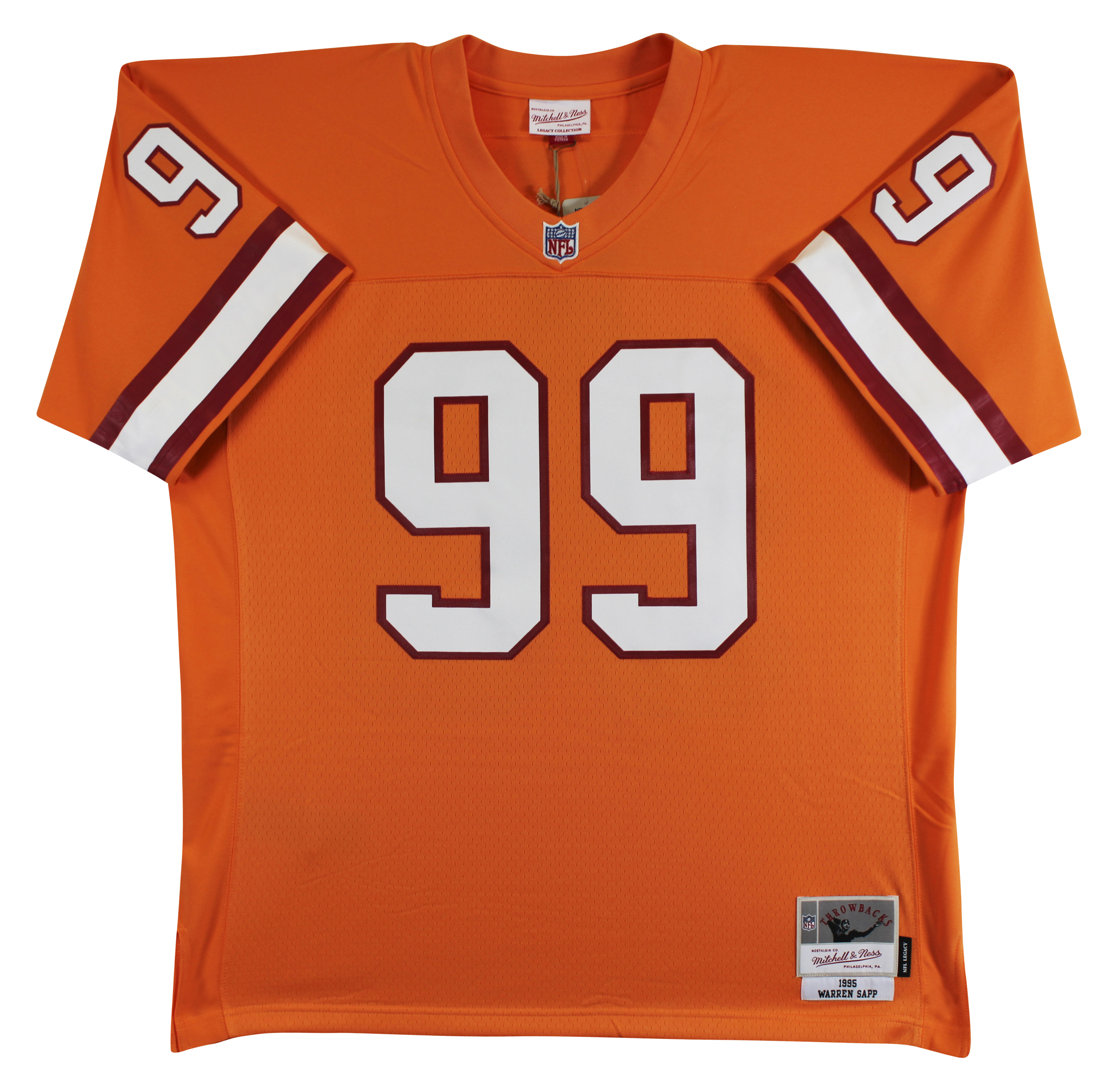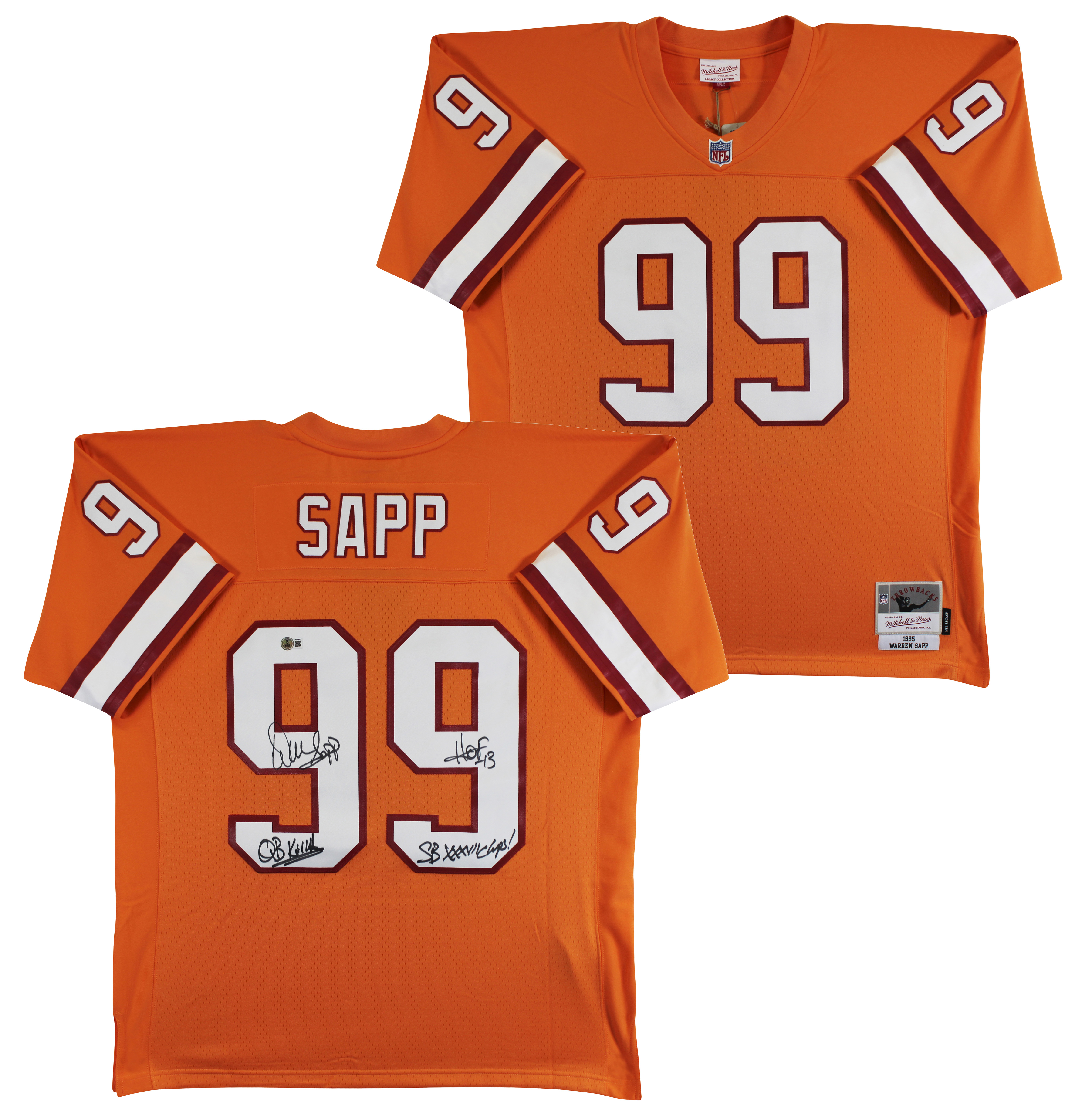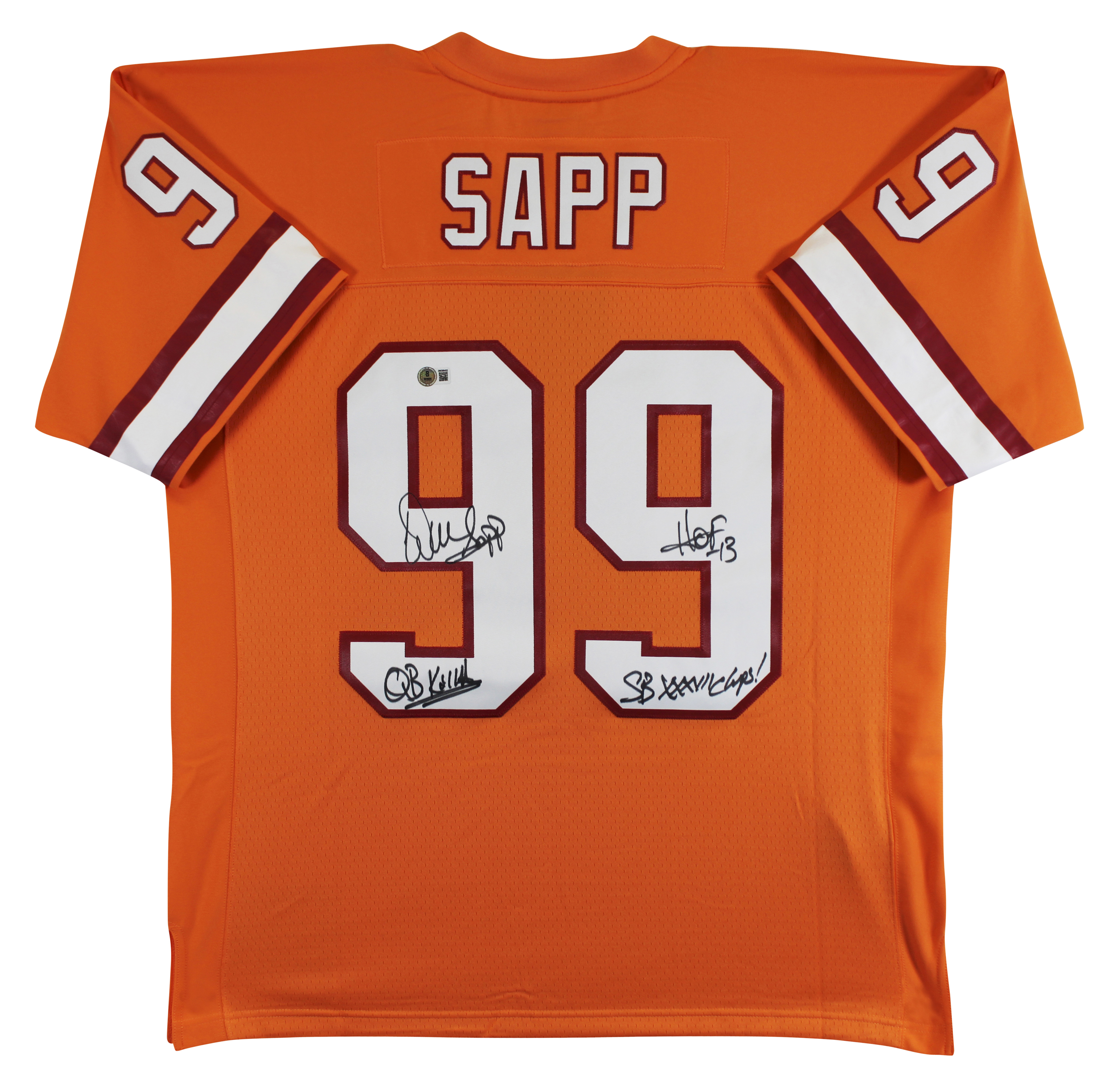 This Autographed Orange Mitchell & Ness Throwback Jersey with the inscription of "QB Killa, HOF 13, SB XXXVII Champs" has been Personally Signed by Warren Sapp of the Tampa Bay Buccaneers. This item is 100% Authentic to include a hologram by Beckett Authentication Services. This item will come with an affixed Beckett Authentication Services (BAS) authentication sticker, which includes a scannable QR code to verify authenticity. Please note that Beckett no longer provides serial-numbered COA cards, and the attached BAS sticker will serve as the complete authentication for this item. This is a BAS Witnessed Protection Program item which means a Beckett Authentication Service representative was present when this item was being signed. We have multiples of this same item. While the photographs are representative of this item, the size, placement and strength of the signature may vary. Each item is hand signed, therefore, each autograph is unique. This is a X-Large sized Jersey.