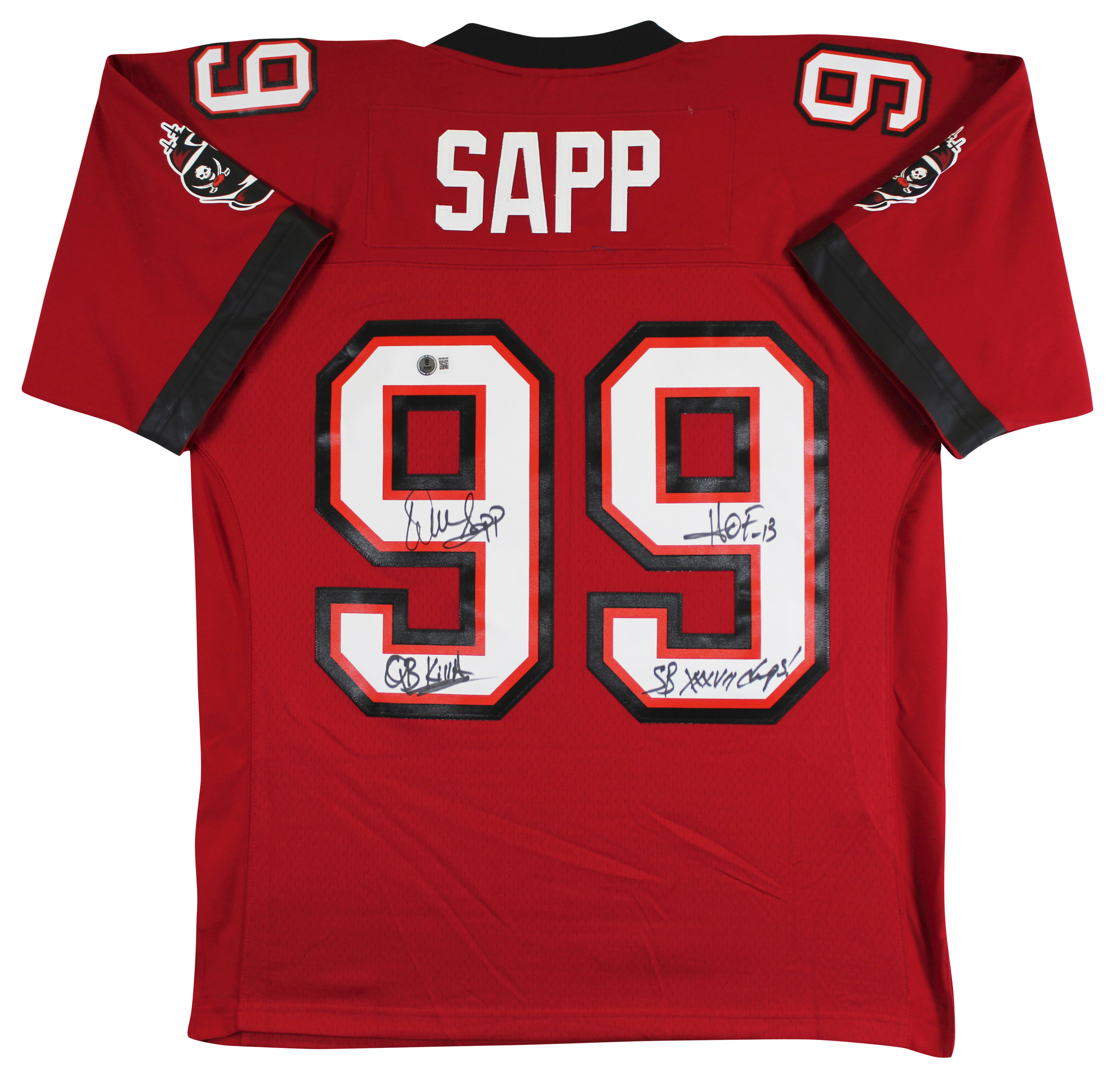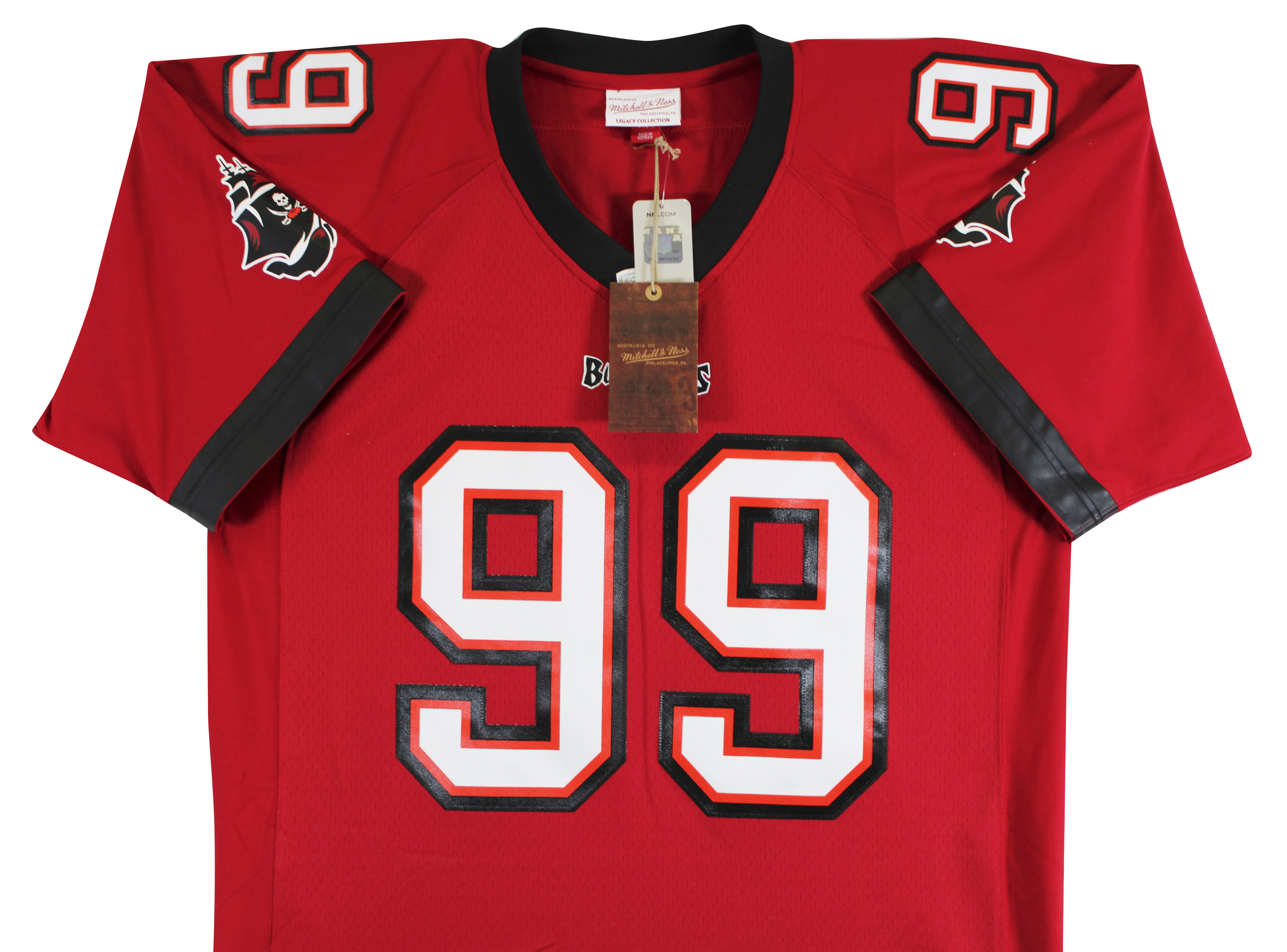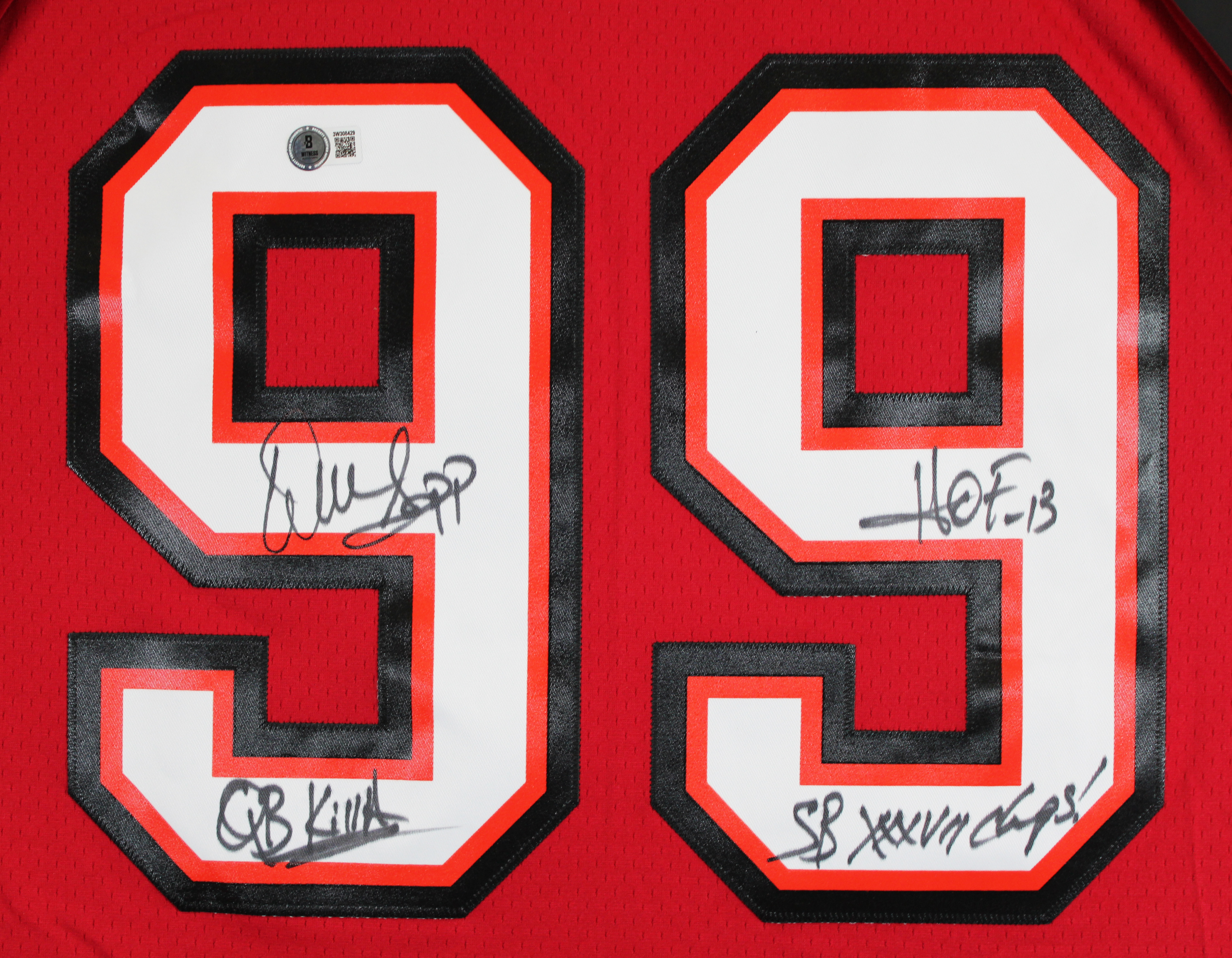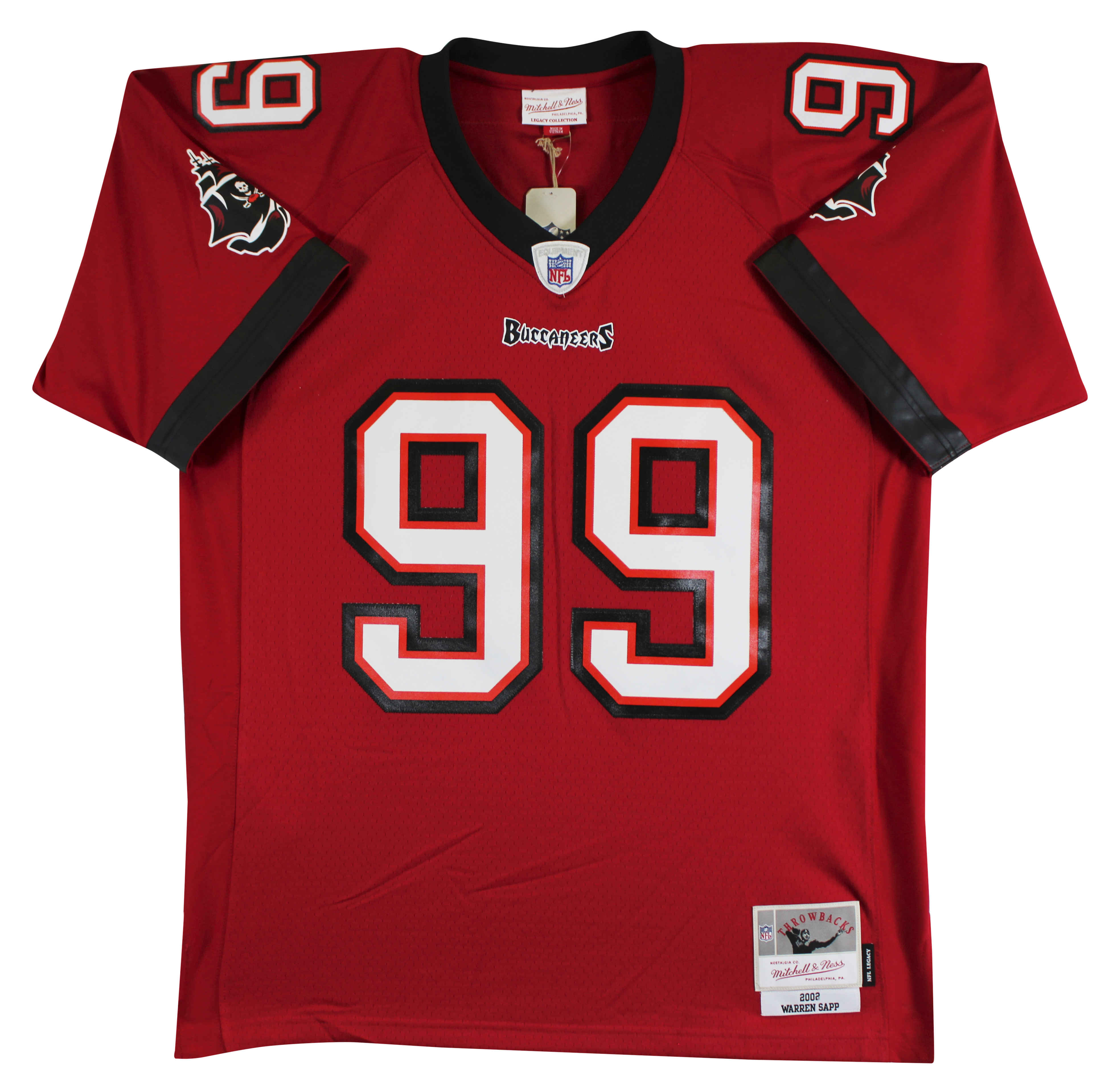 This Autographed Red Mitchell & Ness Jersey with the inscription of "QB Killa, HOF 13, SB XXXVII Champs" has been Personally Signed by Warren Sapp of the Tampa Bay Buccaneers. This item is 100% Authentic to include a hologram by Beckett Authentication Services. This item will come with an affixed Beckett Authentication Services (BAS) authentication sticker, which includes a scannable QR code to verify authenticity. Please note that Beckett no longer provides serial-numbered COA cards, and the attached BAS sticker will serve as the complete authentication for this item. This is a BAS Witnessed Protection Program item which means a Beckett Authentication Service representative was present when this item was being signed. We have multiples of this same item. While the photographs are representative of this item, the size, placement and strength of the signature may vary. Each item is hand signed, therefore, each autograph is unique. This is a X-Large sized Jersey.