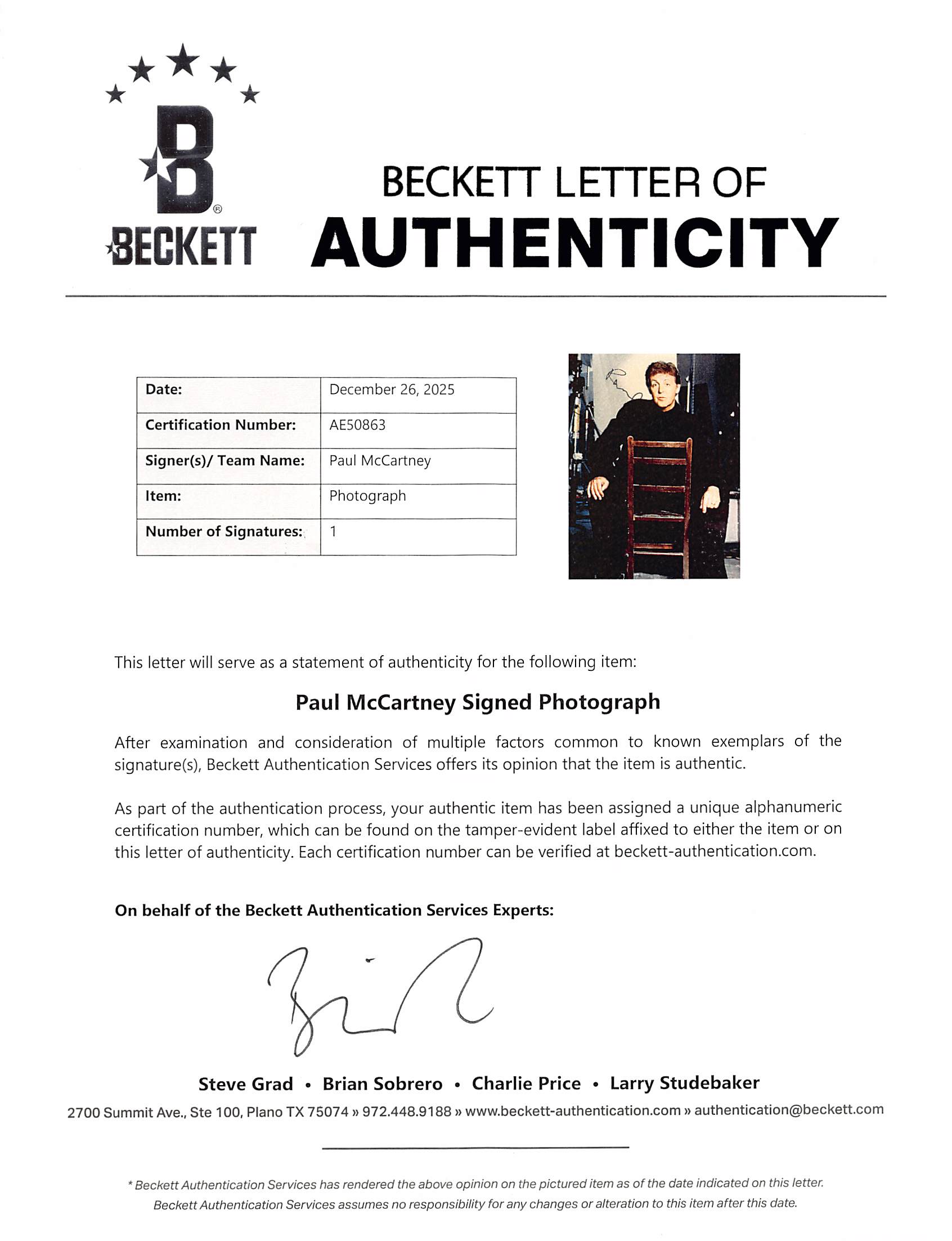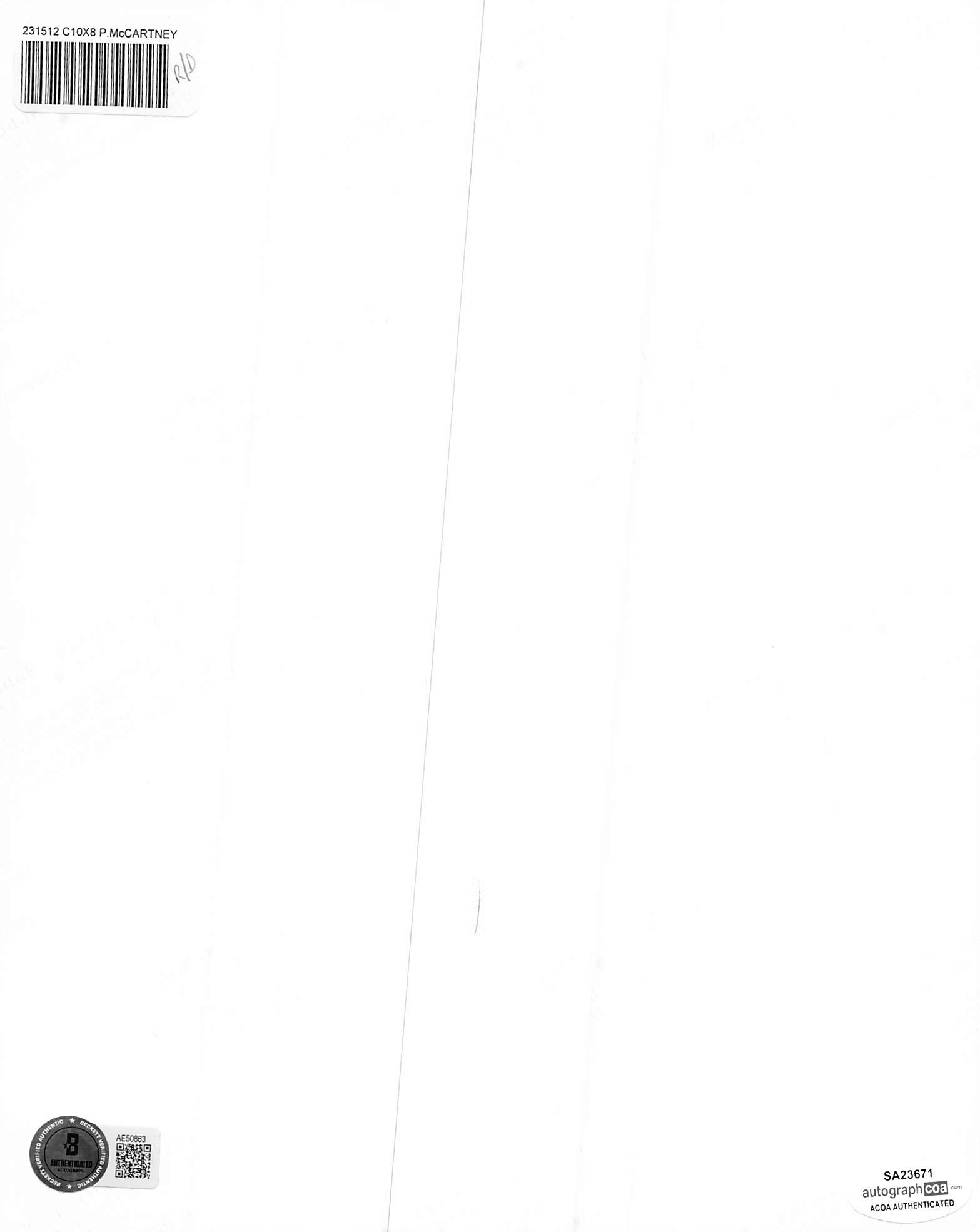 This Autographed Vertical 8x10 Photo has been Personally Signed by Paul McCartney of The Beatles. This item is 100% Authentic to include a Certificate of Authenticity (COA) / hologram by Beckett Authentication Services. The authenticity can be verified on Beckett Authentication Services website.