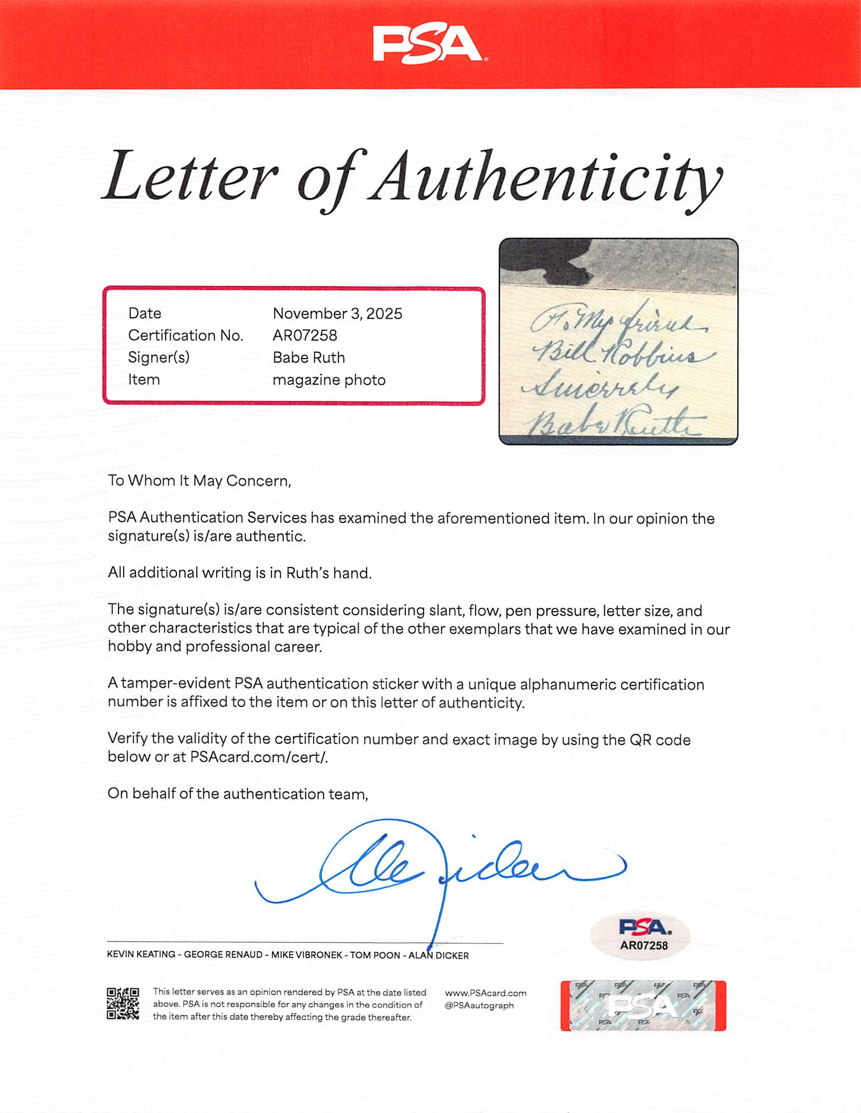 This Autographed & Framed 8x10.5 Magazine Page with the inscription of "To My Friend Bill Robbins Sincerely" has been Personally Signed by Babe Ruth of the New York Yankees. This item is 100% Authentic to include a Certificate of Authenticity (COA) / hologram by Beckett Authentication Services. The authenticity can be verified on Beckett Authentication Services website. This item has been professionally framed to overall dimensions of approximately 12 x 16 inches.