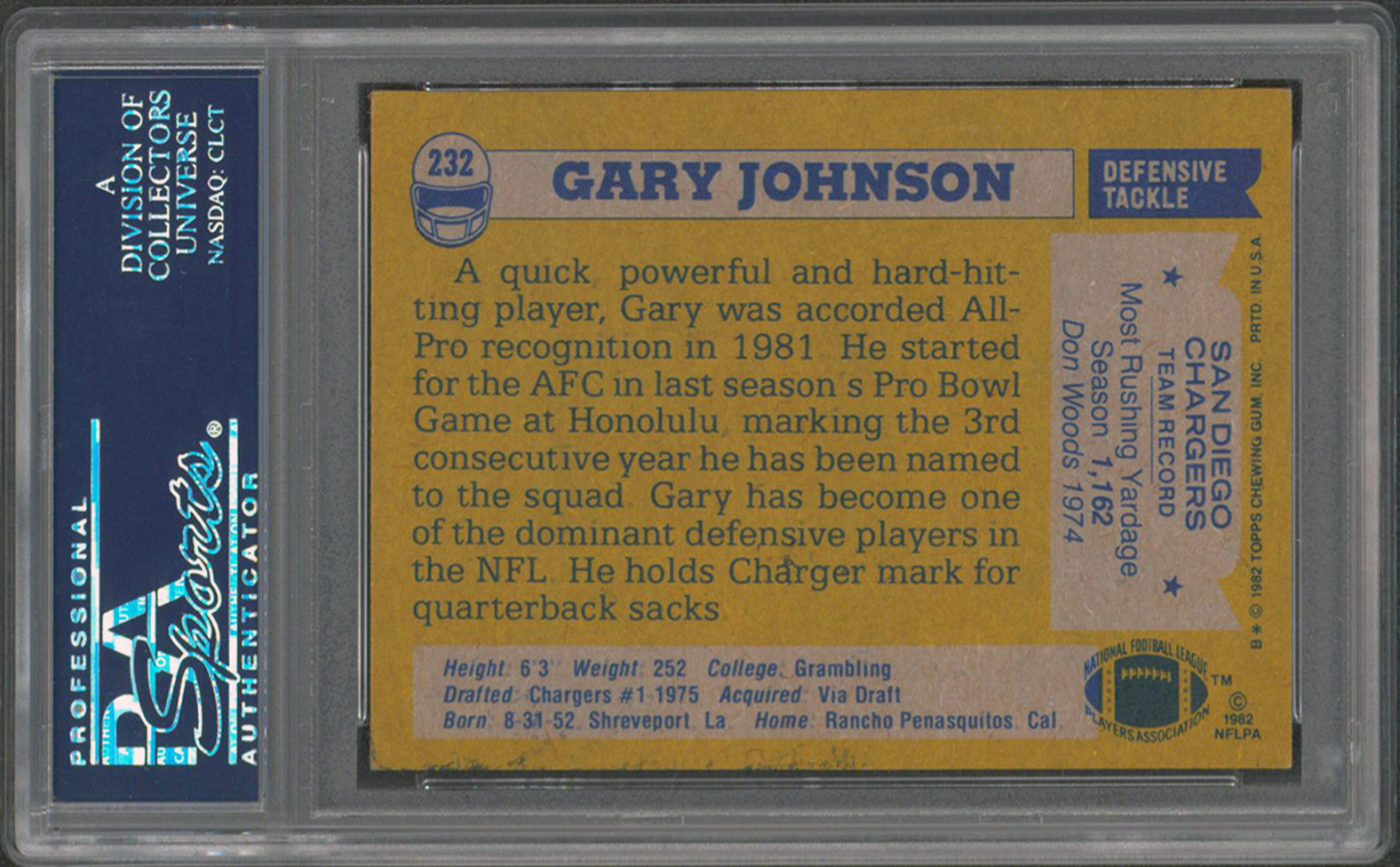 This Autographed 1982 Topps #232 Card has been Personally Signed by Gary Johnson of the San Diego Chargers. This item is 100% Authentic, it comes slabbed and authenticated by PSA/DNA. The authenticity can be verified on Professional Sports Authenticator website.