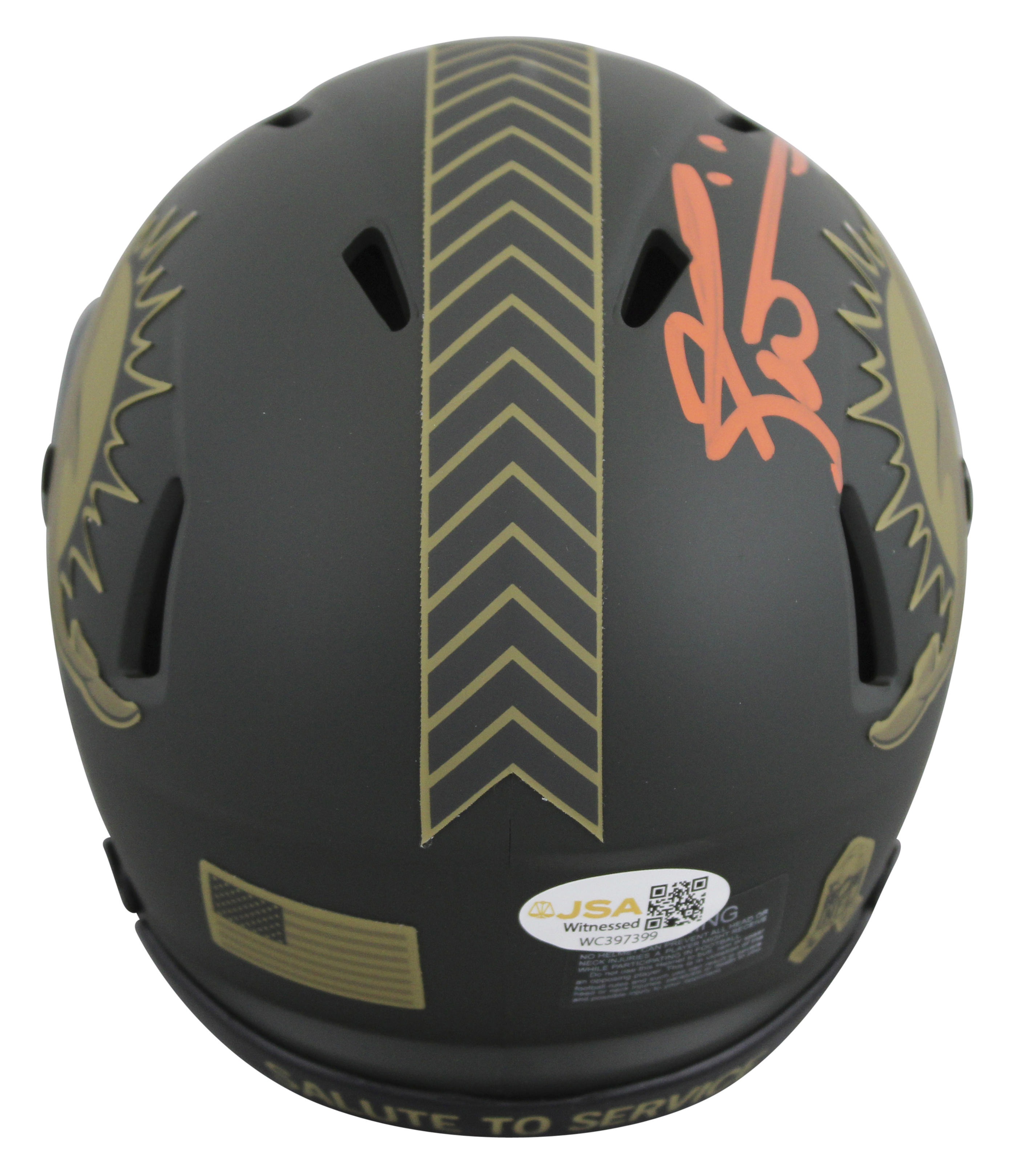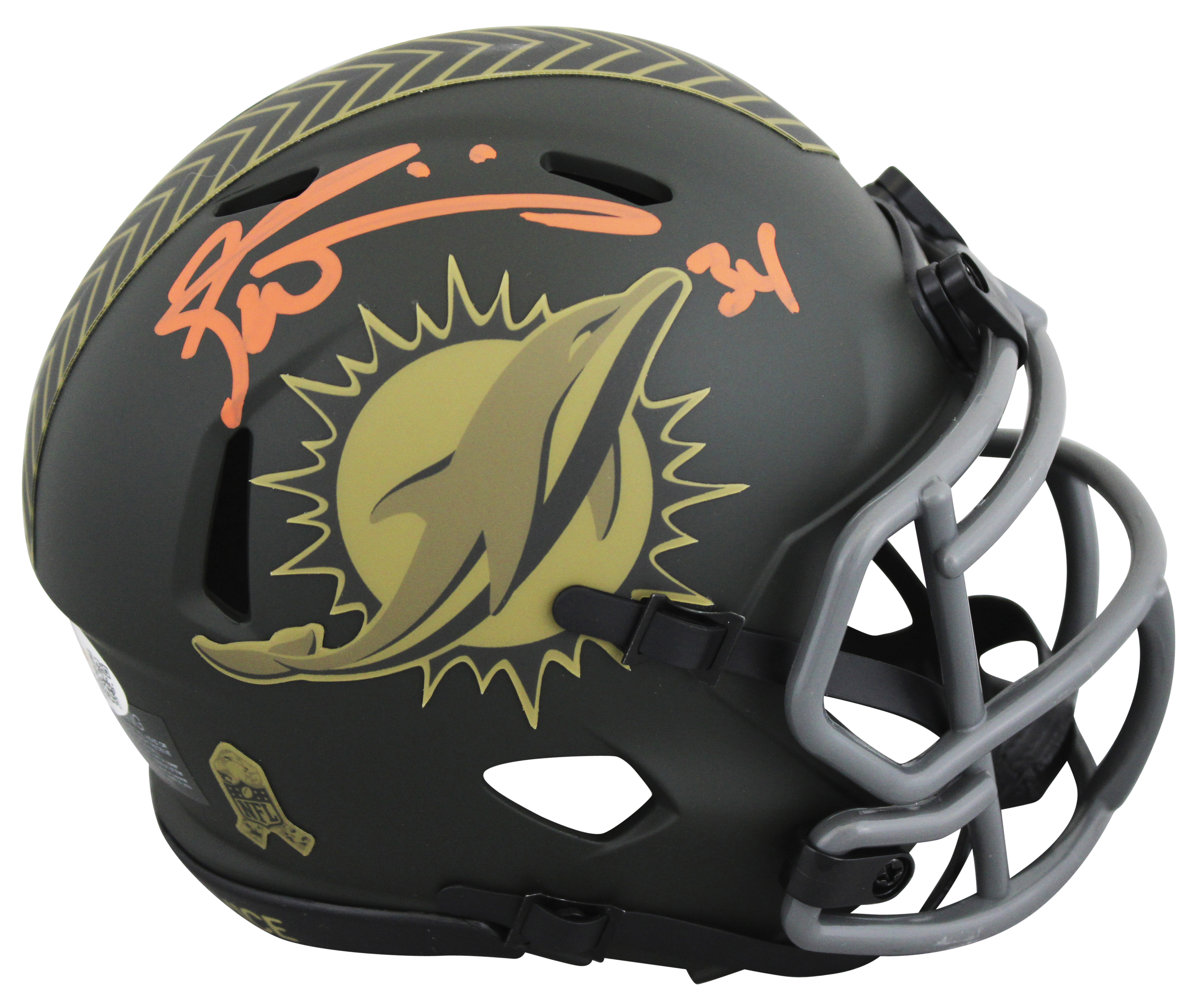 This Autographed Alternate 2025 Salute to Service IV Speed Mini Helmet has been Personally Signed by Ricky Williams of the Miami Dolphins. This item is 100% Authentic to include a hologram by James Spence Authentication Services. This item will come with an affixed James Spence Authentication Services (JSA) authentication sticker, which includes a scannable QR code to verify authenticity. Please note that JSA no longer provides serial-numbered COA cards with witnessed items, and the attached JSA sticker will serve as the complete authentication for this item. This is a JSA Witnessed Protection Program item which means a JSA representative was present when this item was being signed. We conducted an autograph signing with Ricky Williams where multiples of the same item were signed. While the photographs are representative of this item, the size, placement and strength of the signature may vary. Each item is hand signed, therefore, each autograph is unique. This item can be verified through JSA Witness.