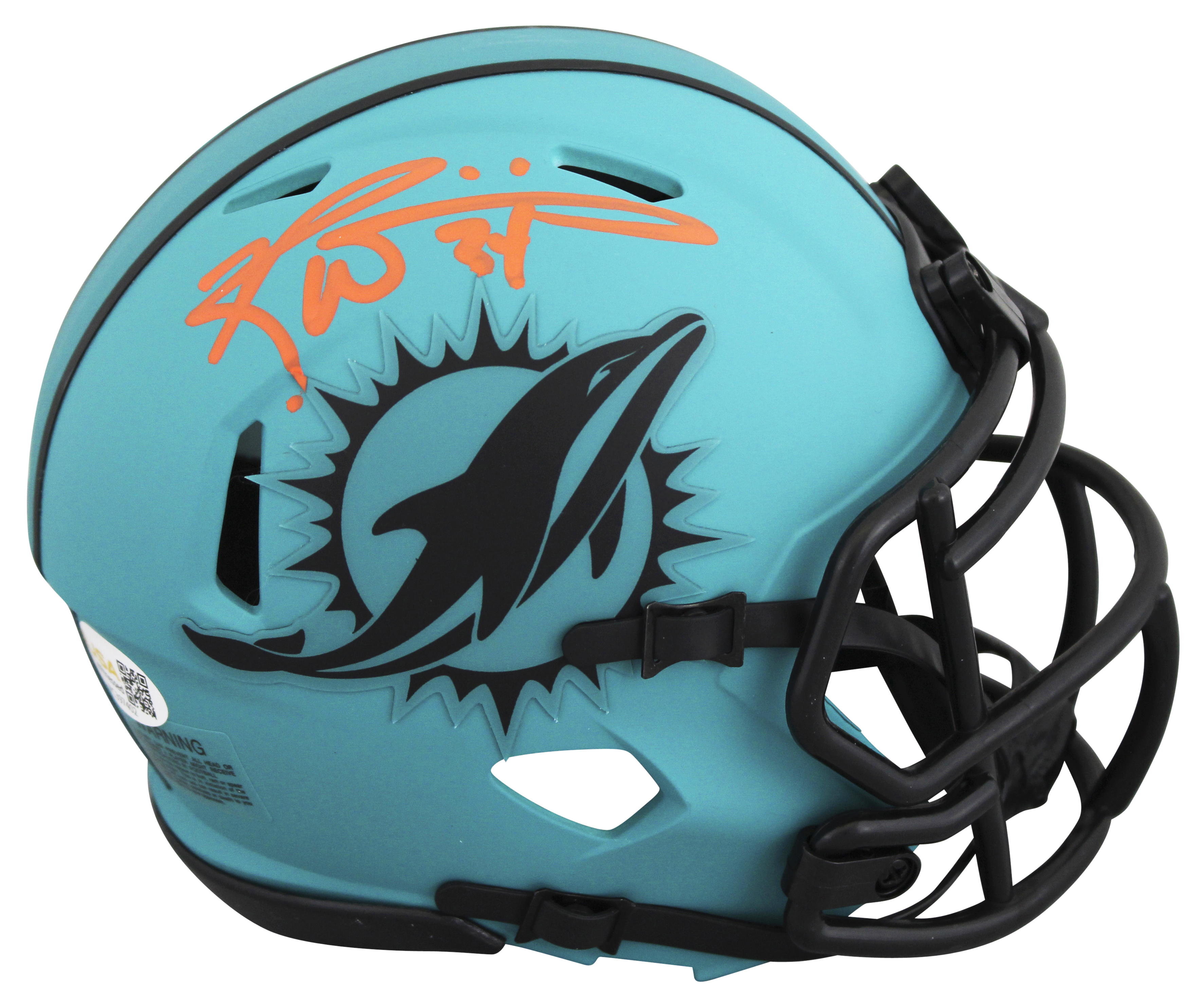 This Autographed Alternate Rave Speed Mini Helmet has been Personally Signed by Ricky Williams of the Miami Dolphins. This item is 100% Authentic to include a hologram by James Spence Authentication Services. This item will come with an affixed James Spence Authentication Services (JSA) authentication sticker, which includes a scannable QR code to verify authenticity. Please note that JSA no longer provides serial-numbered COA cards with witnessed items, and the attached JSA sticker will serve as the complete authentication for this item. This is a JSA Witnessed Protection Program item which means a JSA representative was present when this item was being signed. We conducted an autograph signing with Ricky Williams where multiples of the same item were signed. While the photographs are representative of this item, the size, placement and strength of the signature may vary. Each item is hand signed, therefore, each autograph is unique. This item can be verified through JSA Witness.